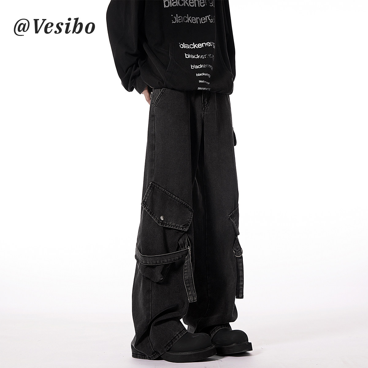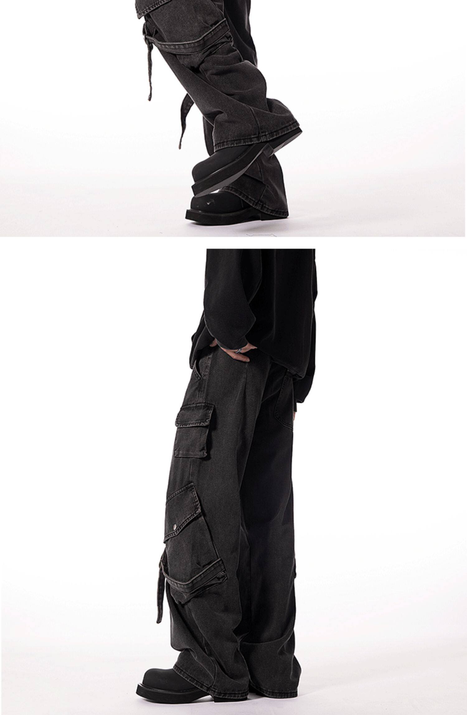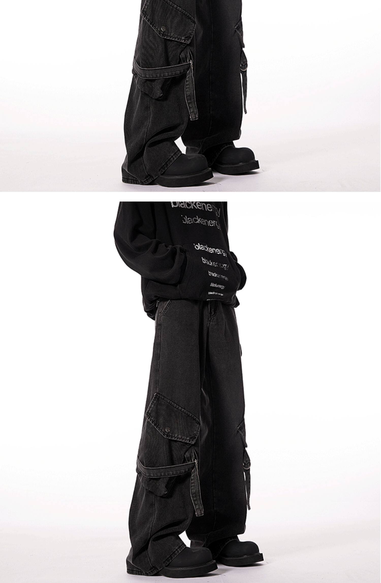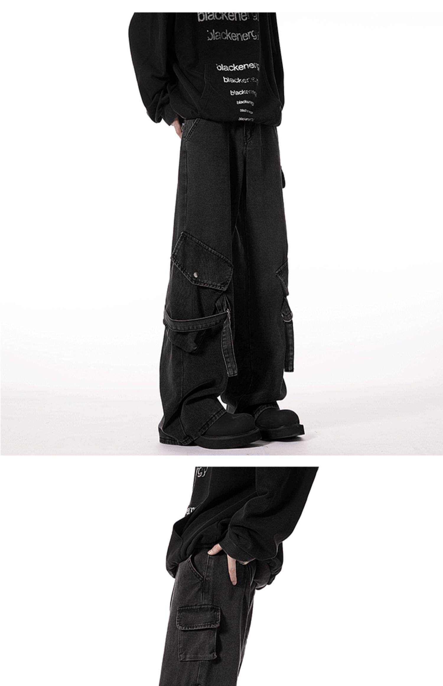 重磅黑色工裝牛仔褲男冬季美式高街痞帥濶腿褲復古做舊多口袋褲子