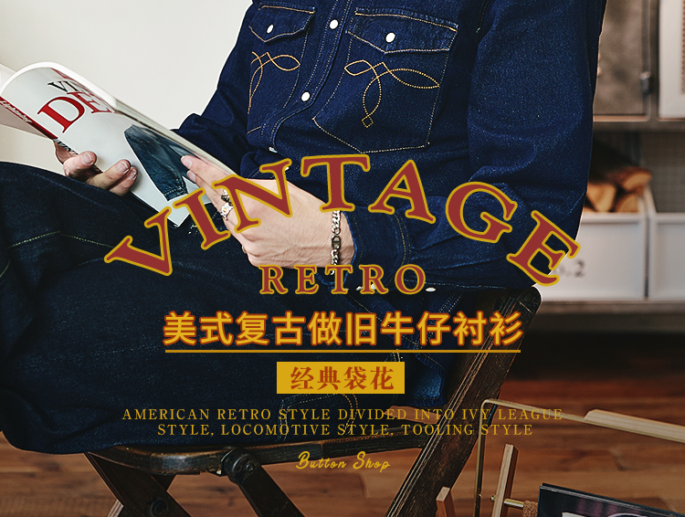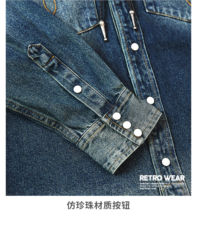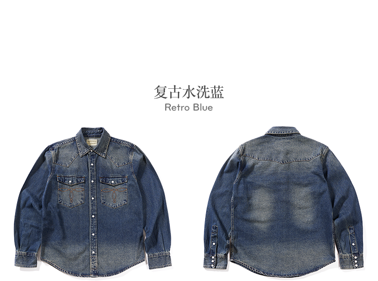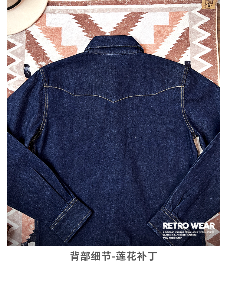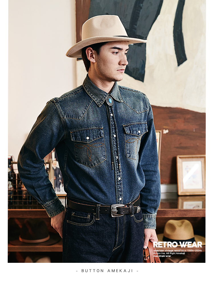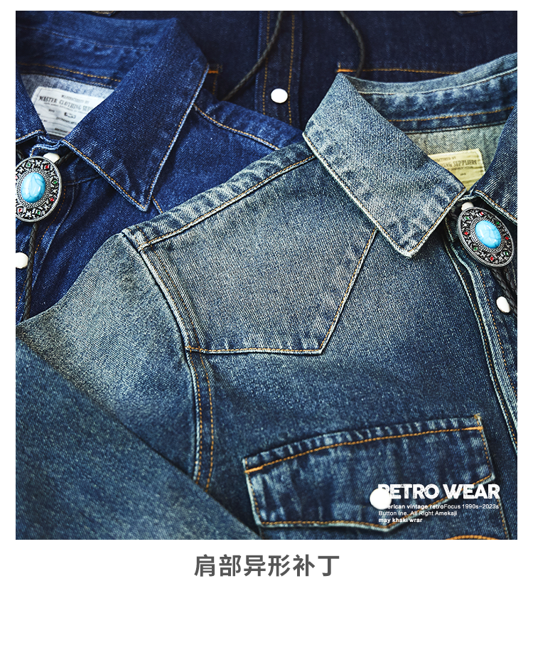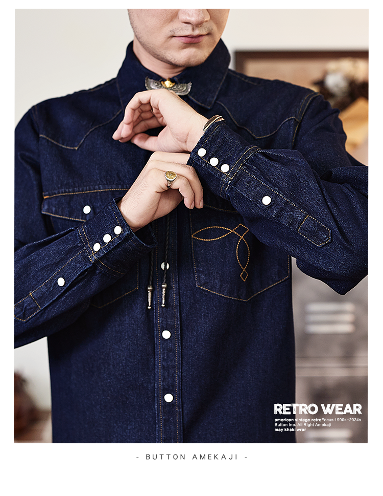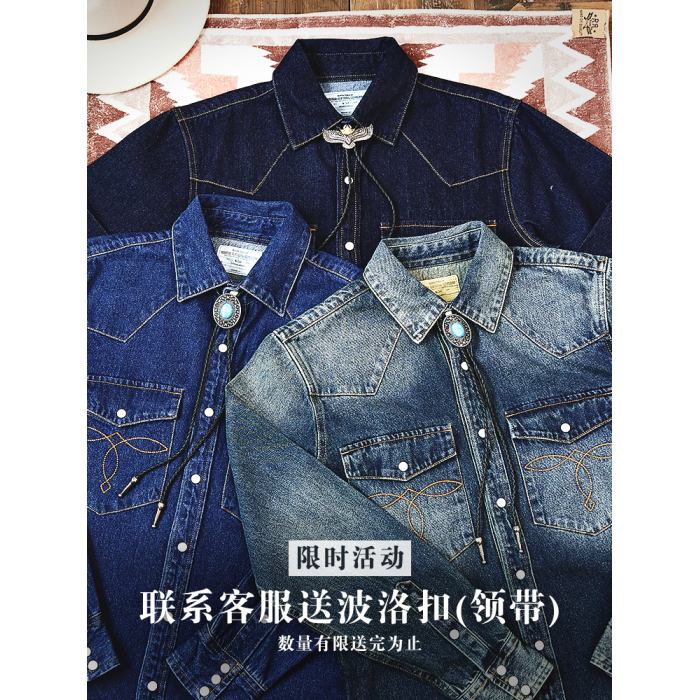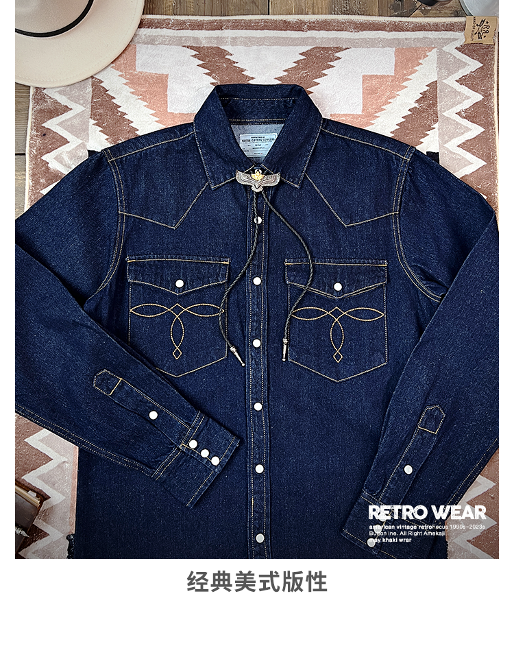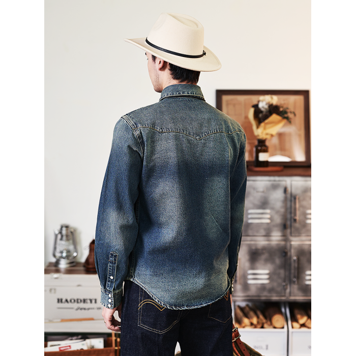 美式復古做舊春秋阿美哢嘰重磅西部牛仔襯衫古著RL工裝襯衣男長袖