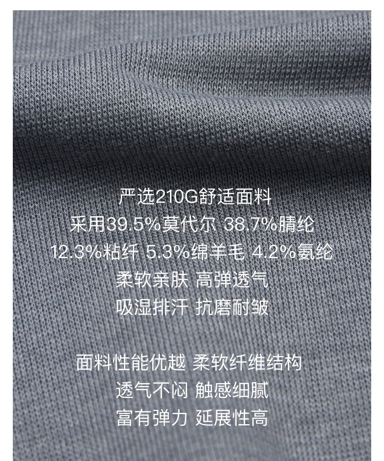 | 材質成分 | 莫代爾纖維(莫代爾)39.5% 聚丙烯腈纖維(腈綸)38.7% 粘膠纖維(粘纖)12.3% 綿羊毛5.3% 聚氨酯彈性纖維(氨綸)4.2% |