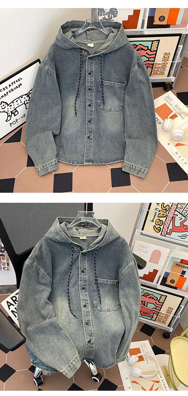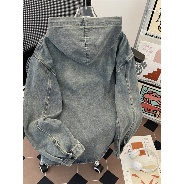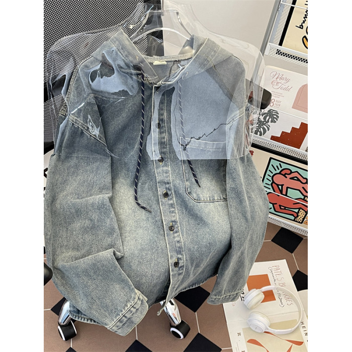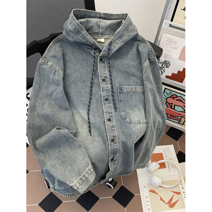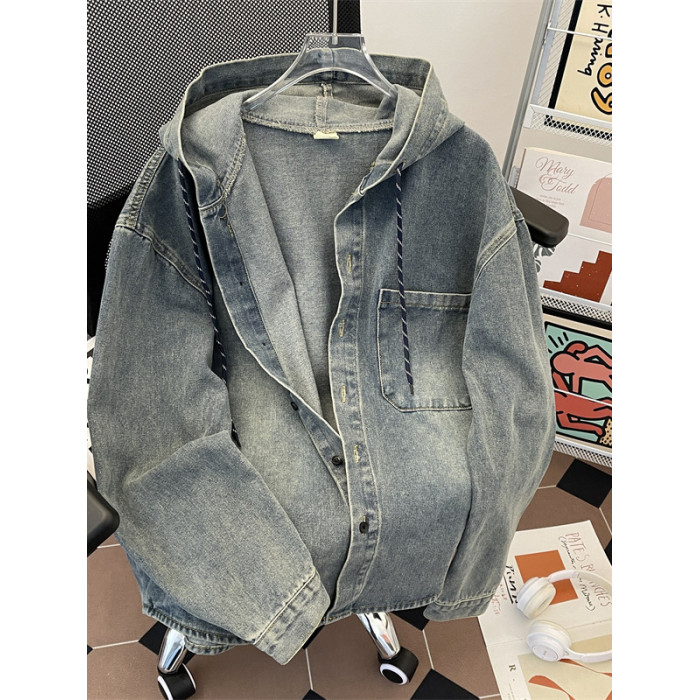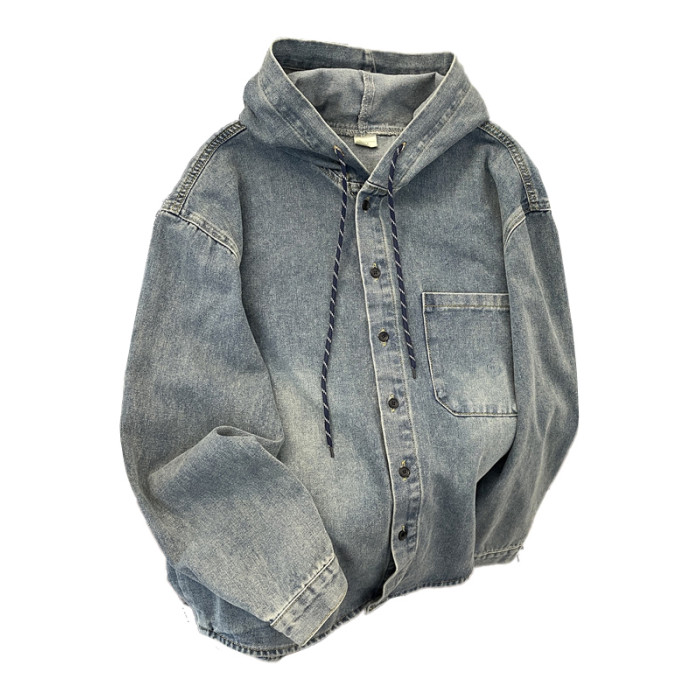 做舊水洗牛仔夾克男寬鬆連帽工裝上衣春秋款美式潮牌復古休閒外套