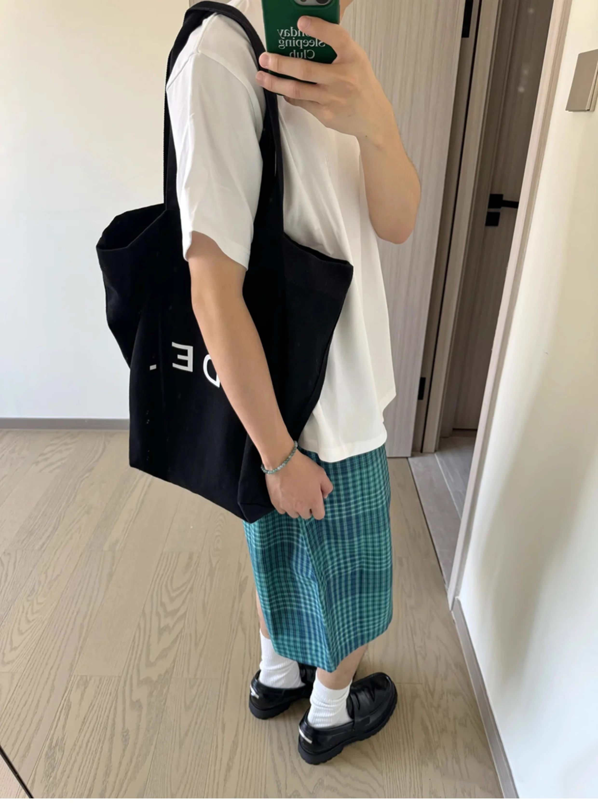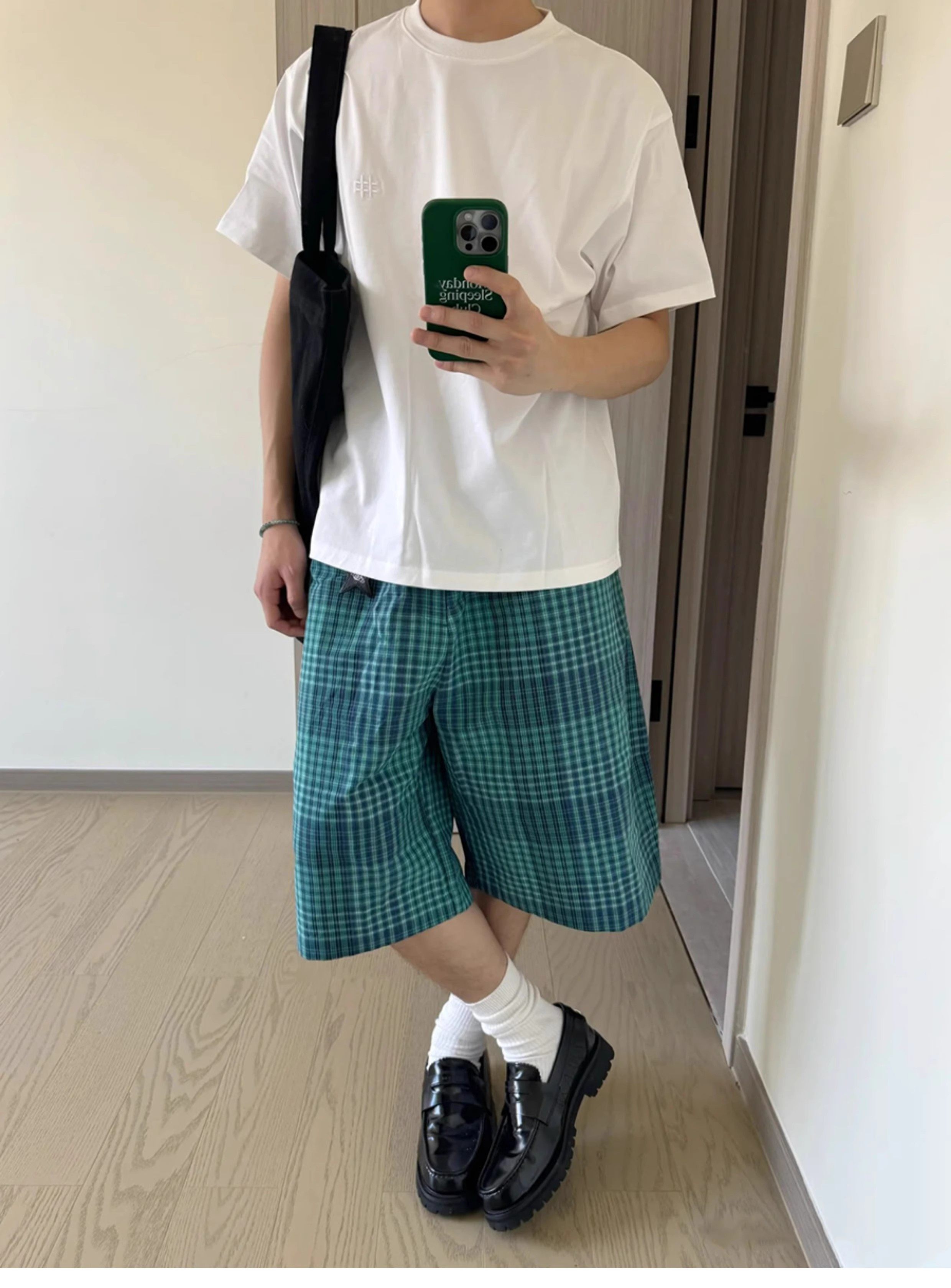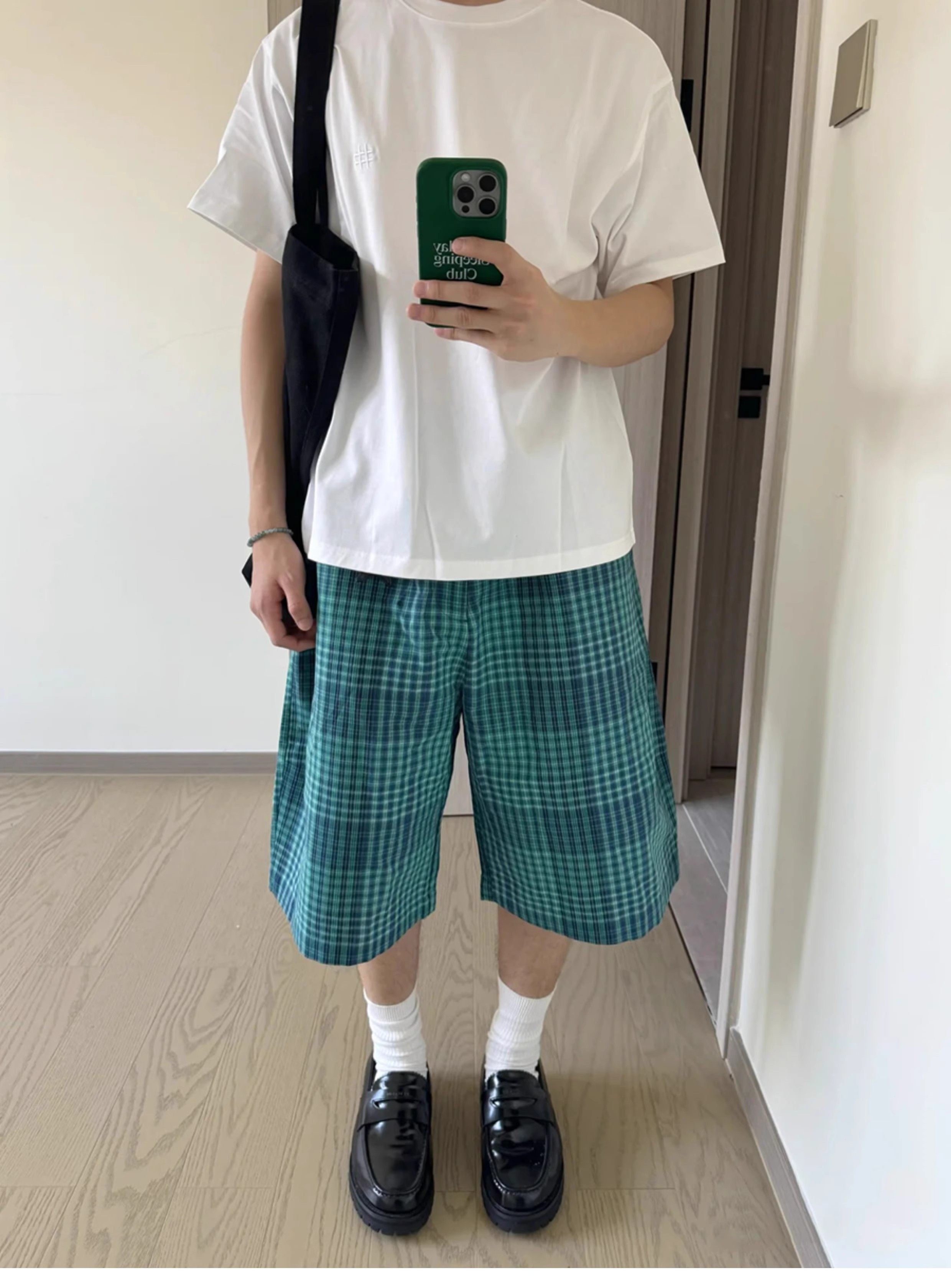 日系復古藍格子寬鬆短褲男女夏季高街休閒百搭五分中褲ins情侶款
