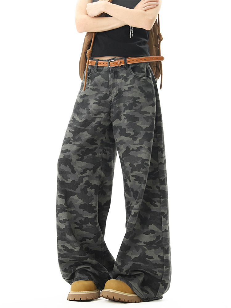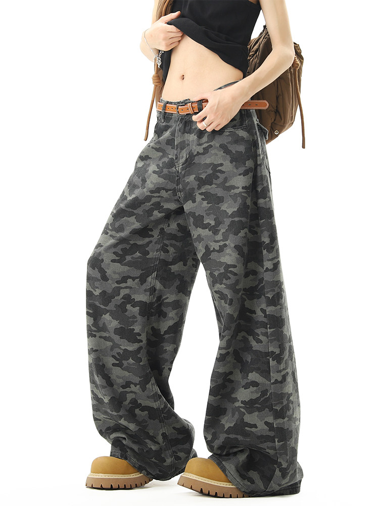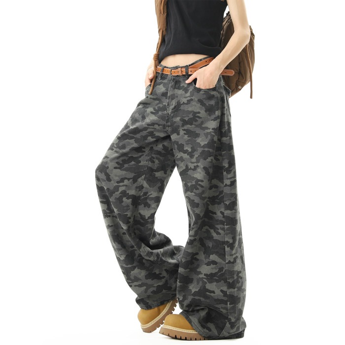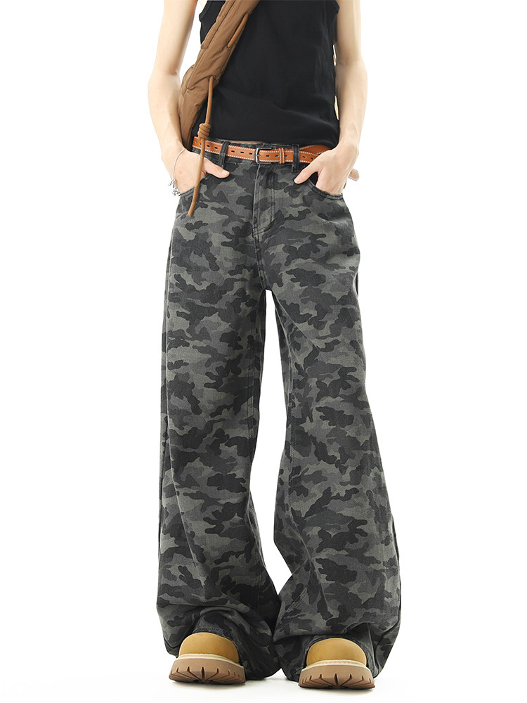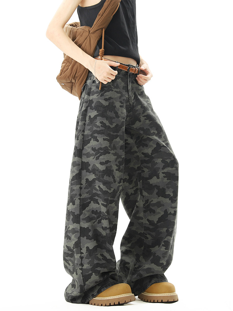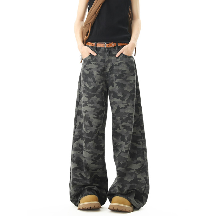 美式高街迷彩濶腿工裝褲男女夏季潮vibe寬鬆百搭垂感直筒拖地長褲