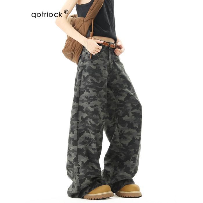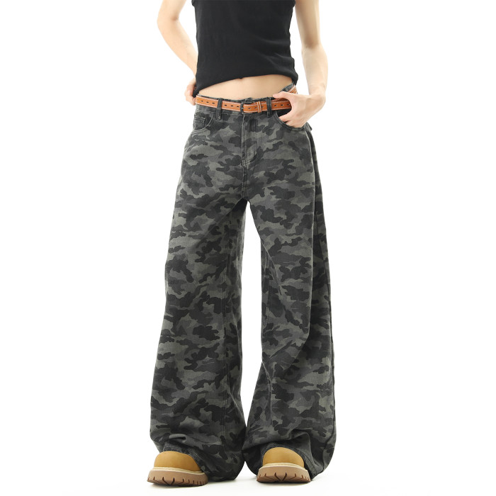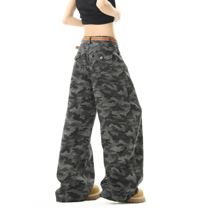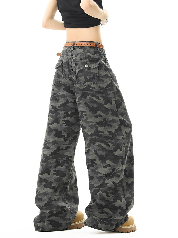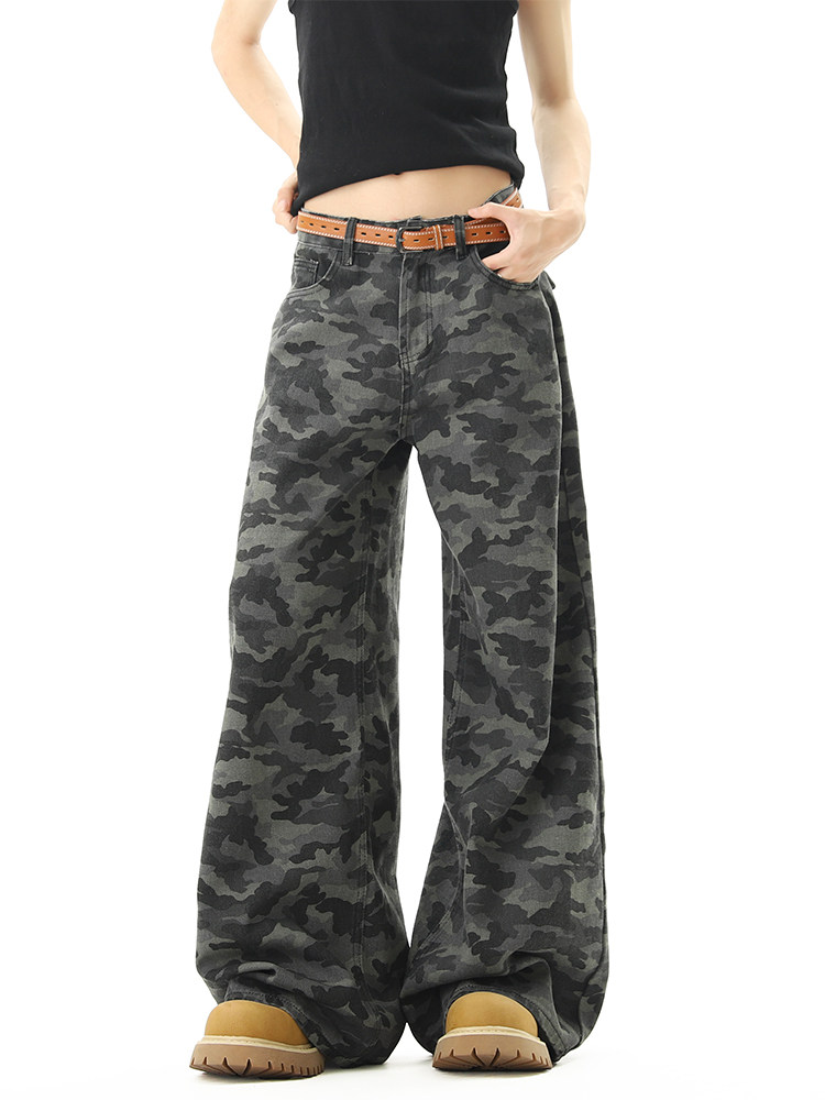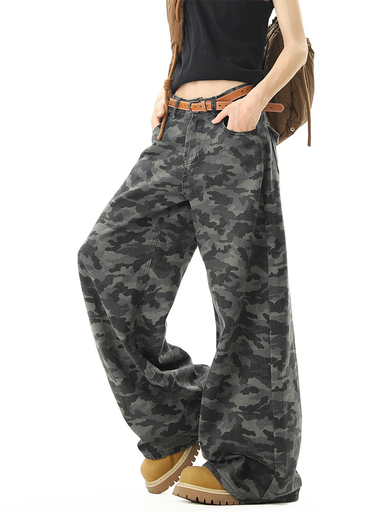 美式高街迷彩濶腿工裝褲男女夏季潮vibe寬鬆百搭垂感直筒拖地長褲