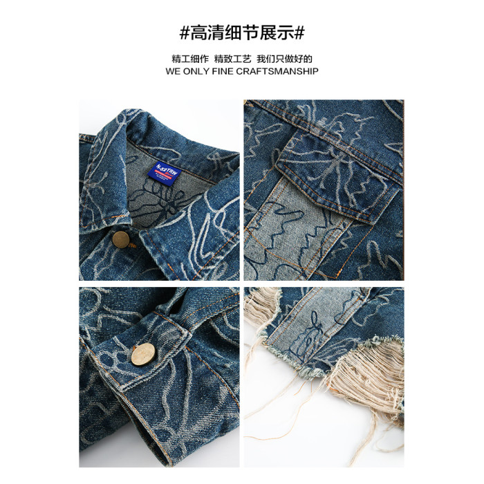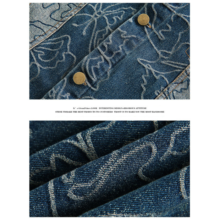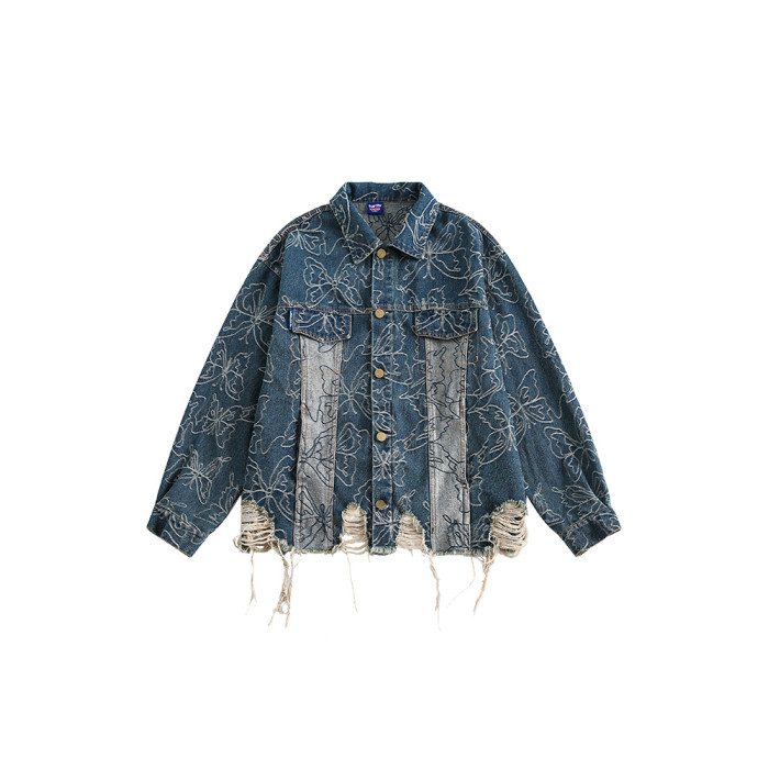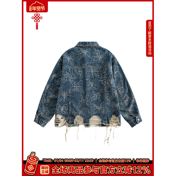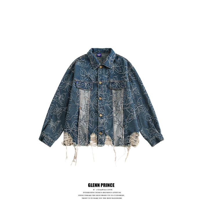 GPstudio早春新款復古蝴蝶提花破洞牛仔外套男設計感小衆夾克