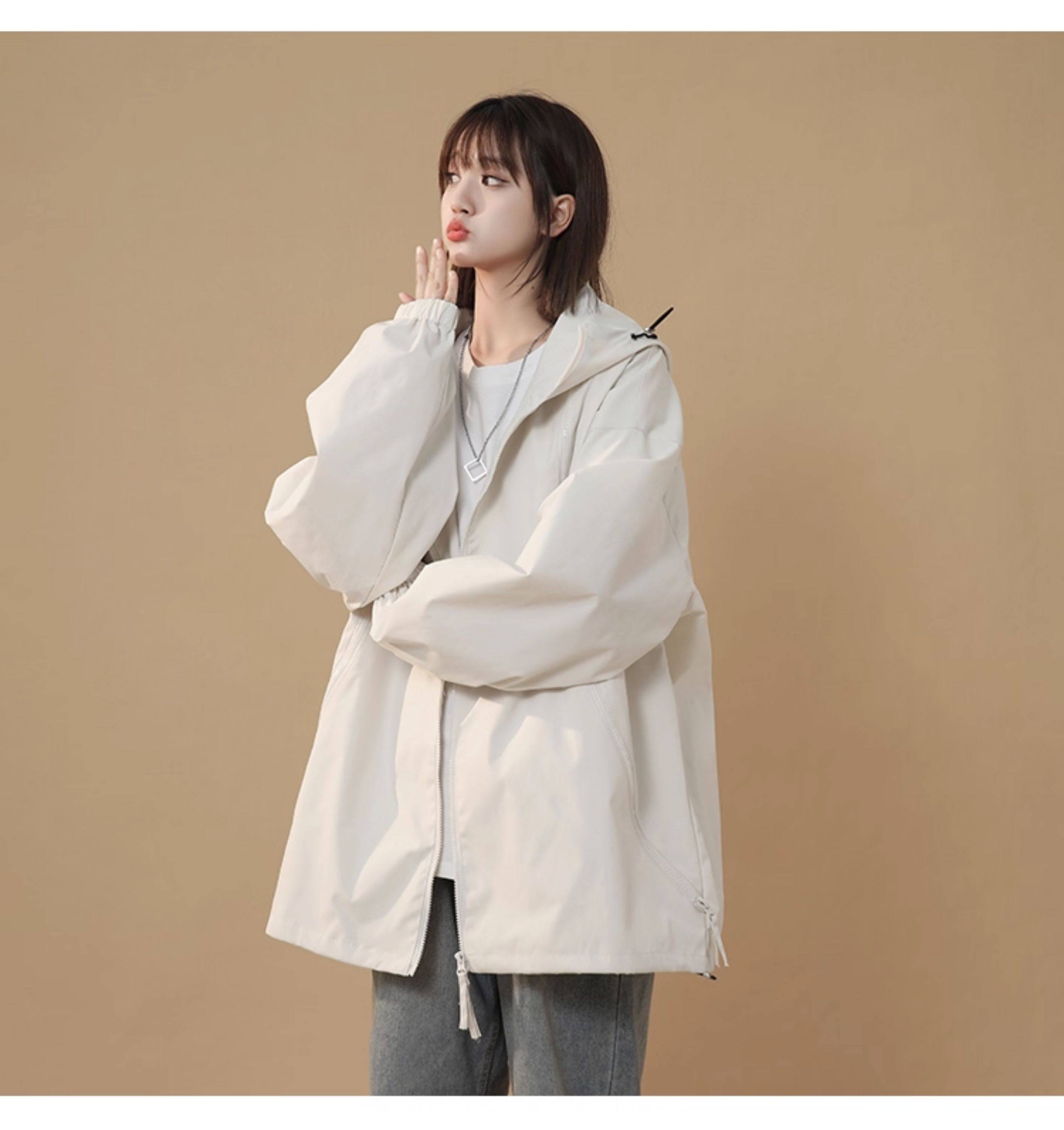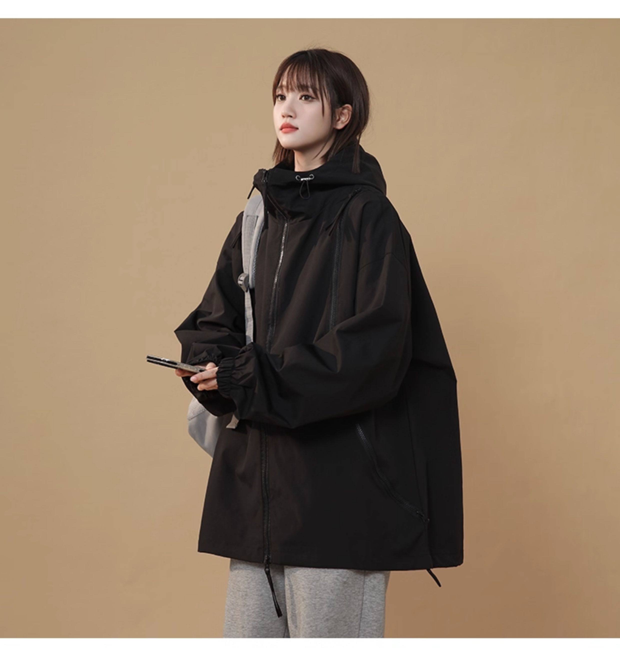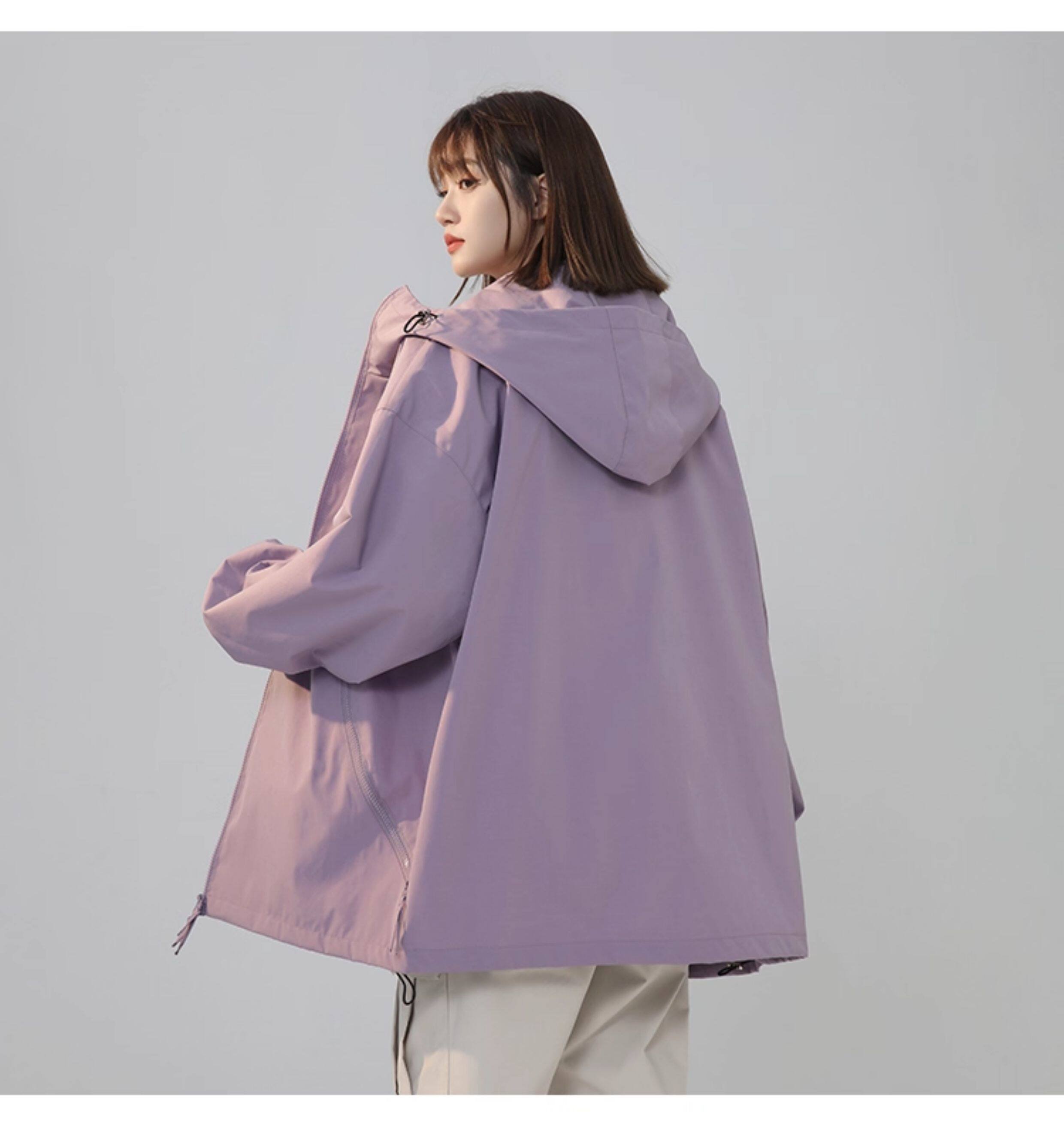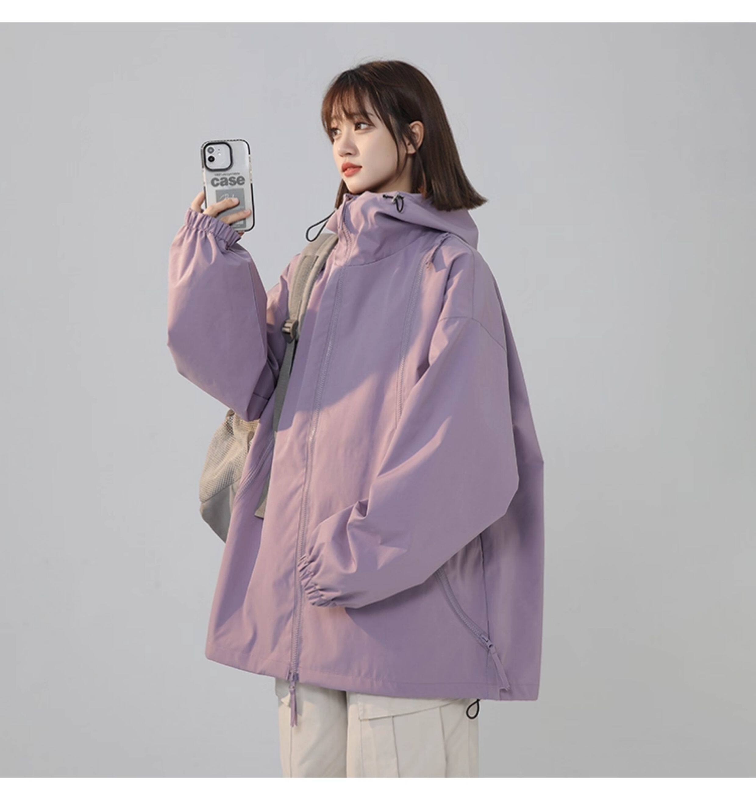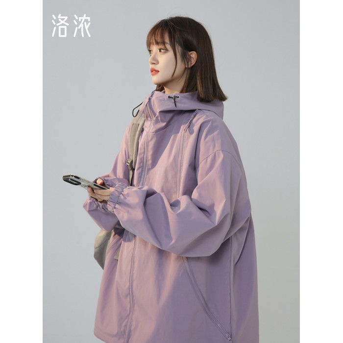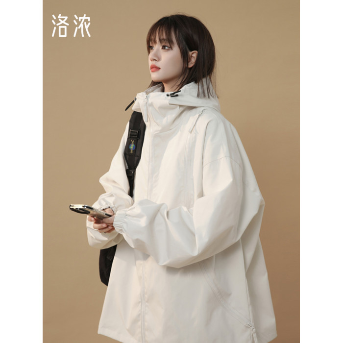 洛濃無性別秋季連帽沖鋒夾克男女純色寬鬆大碼外套青少年防潑水潮