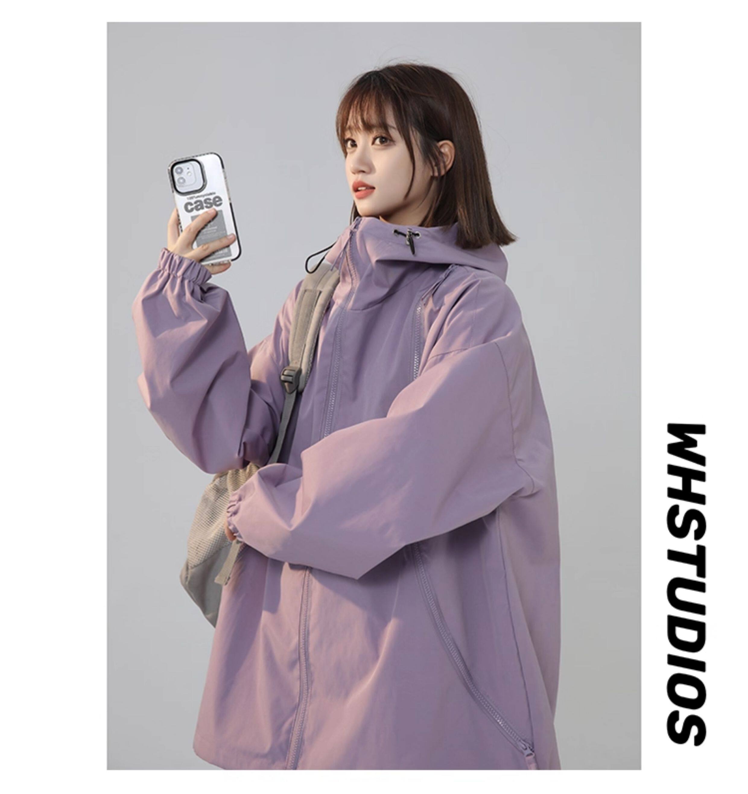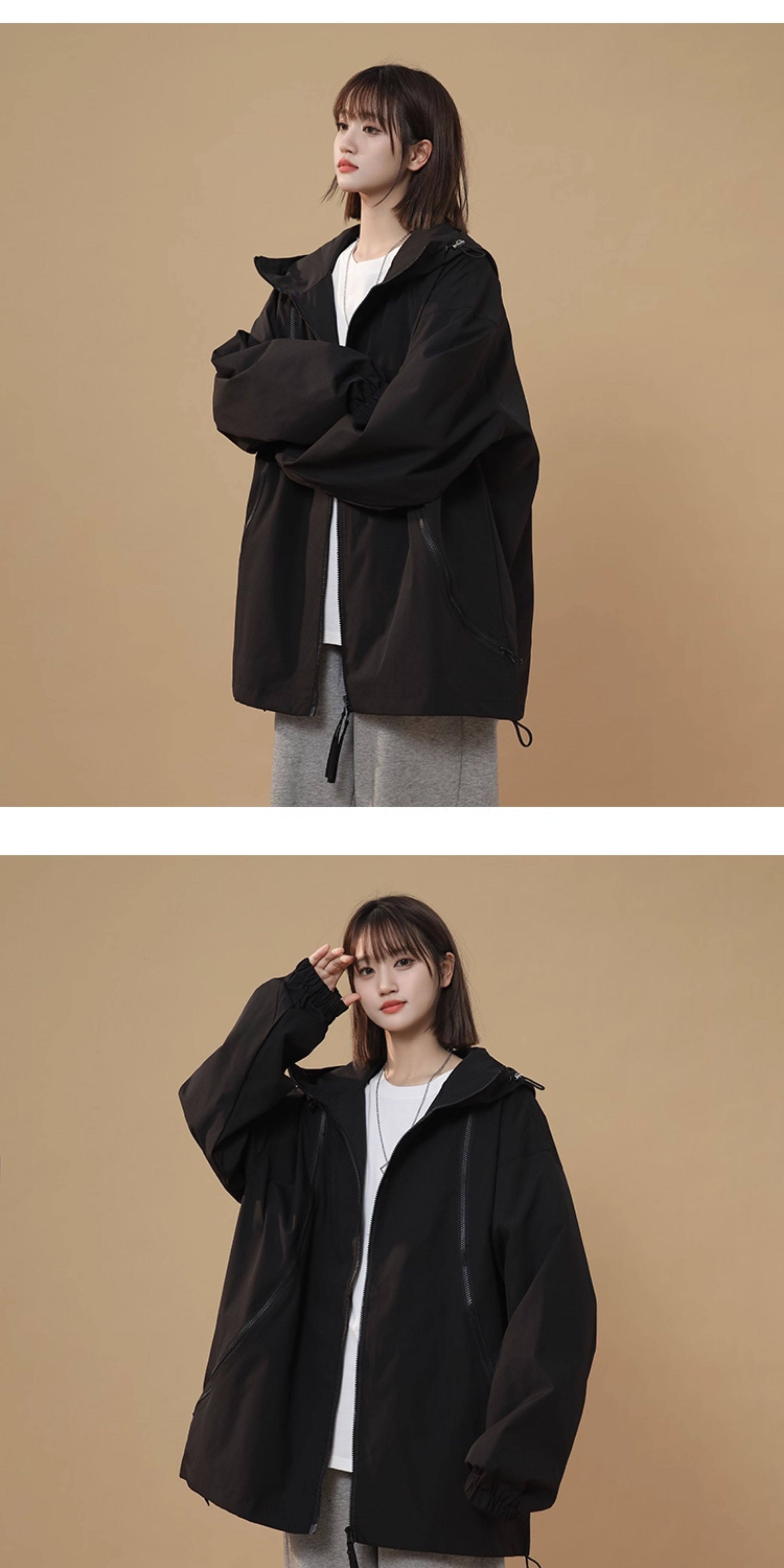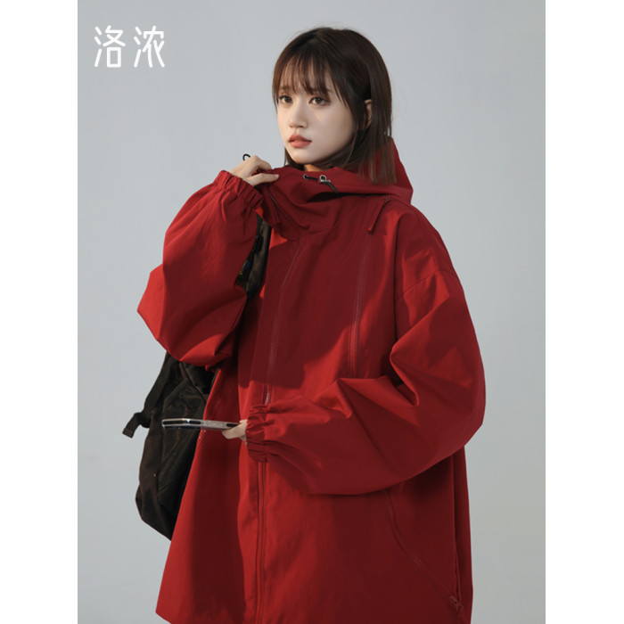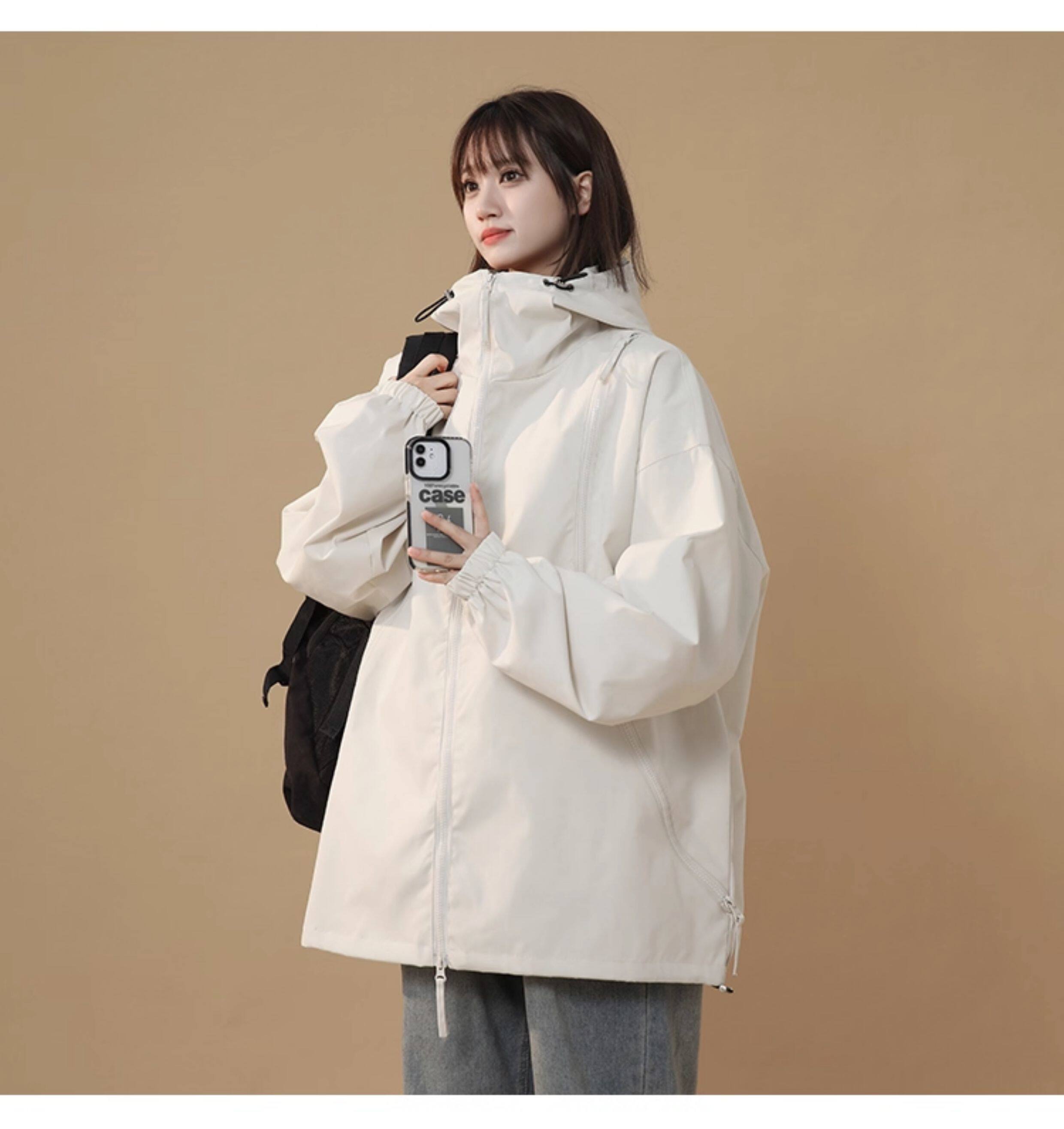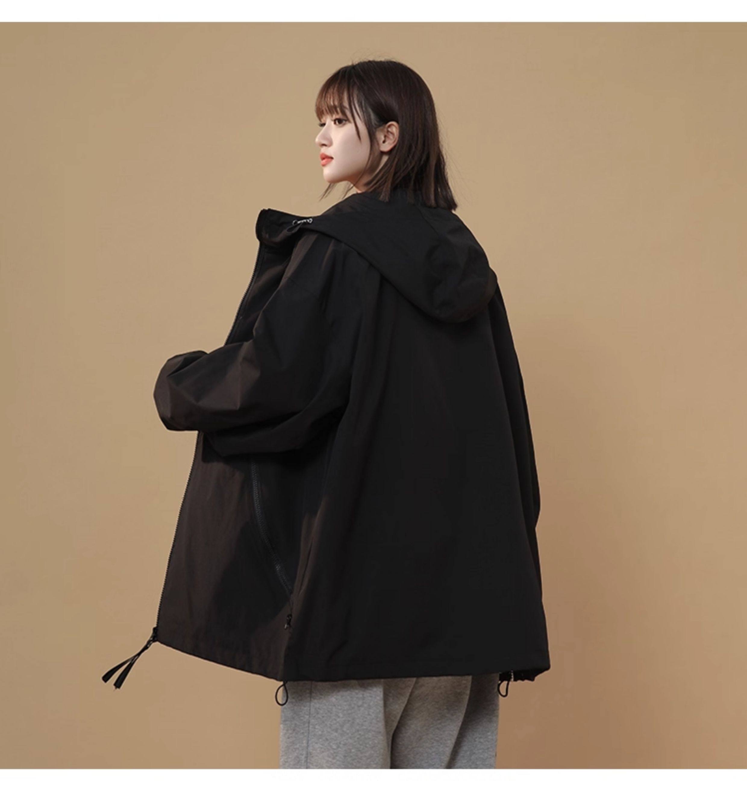 洛濃無性別秋季連帽沖鋒夾克男女純色寬鬆大碼外套青少年防潑水潮