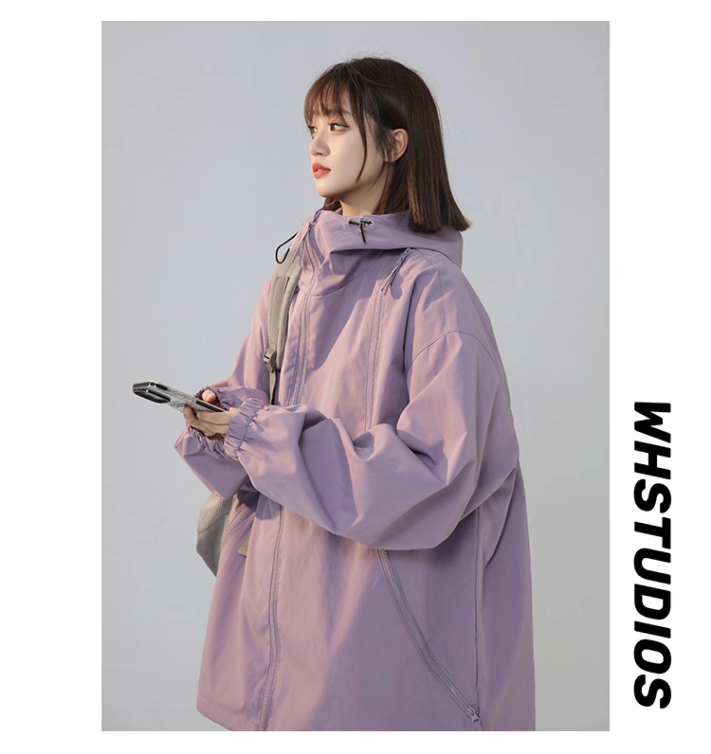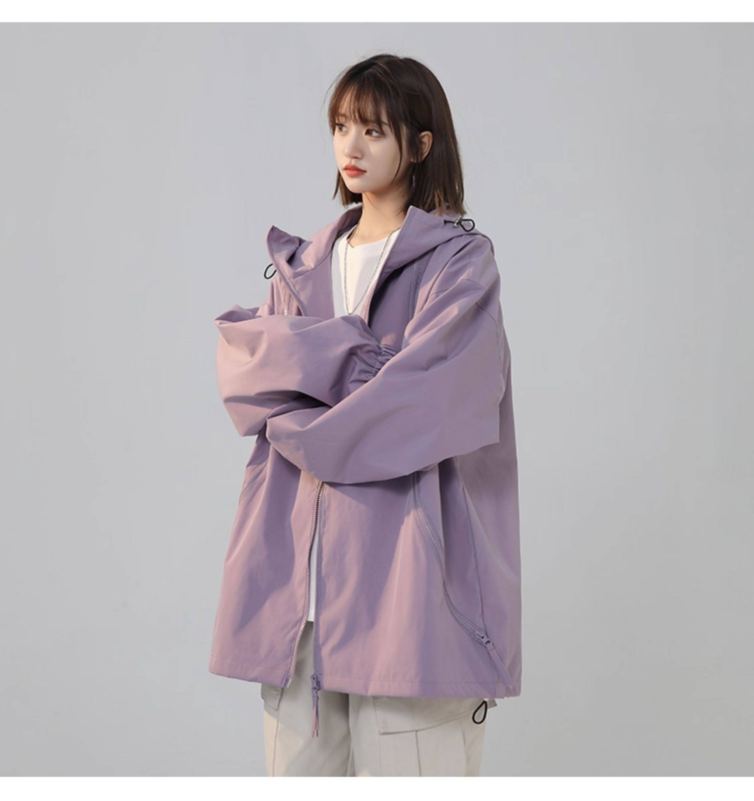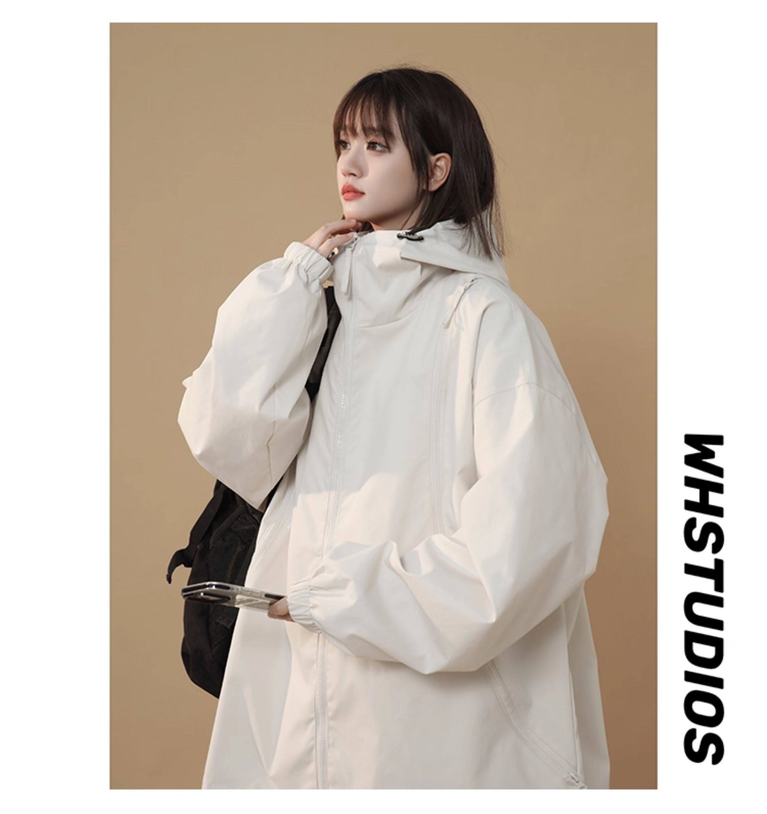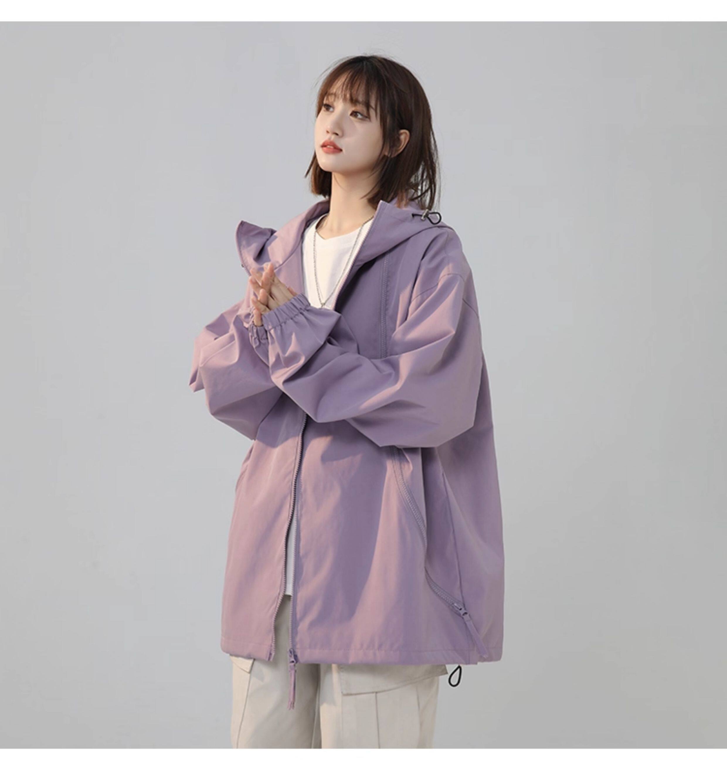 洛濃無性別秋季連帽沖鋒夾克男女純色寬鬆大碼外套青少年防潑水潮