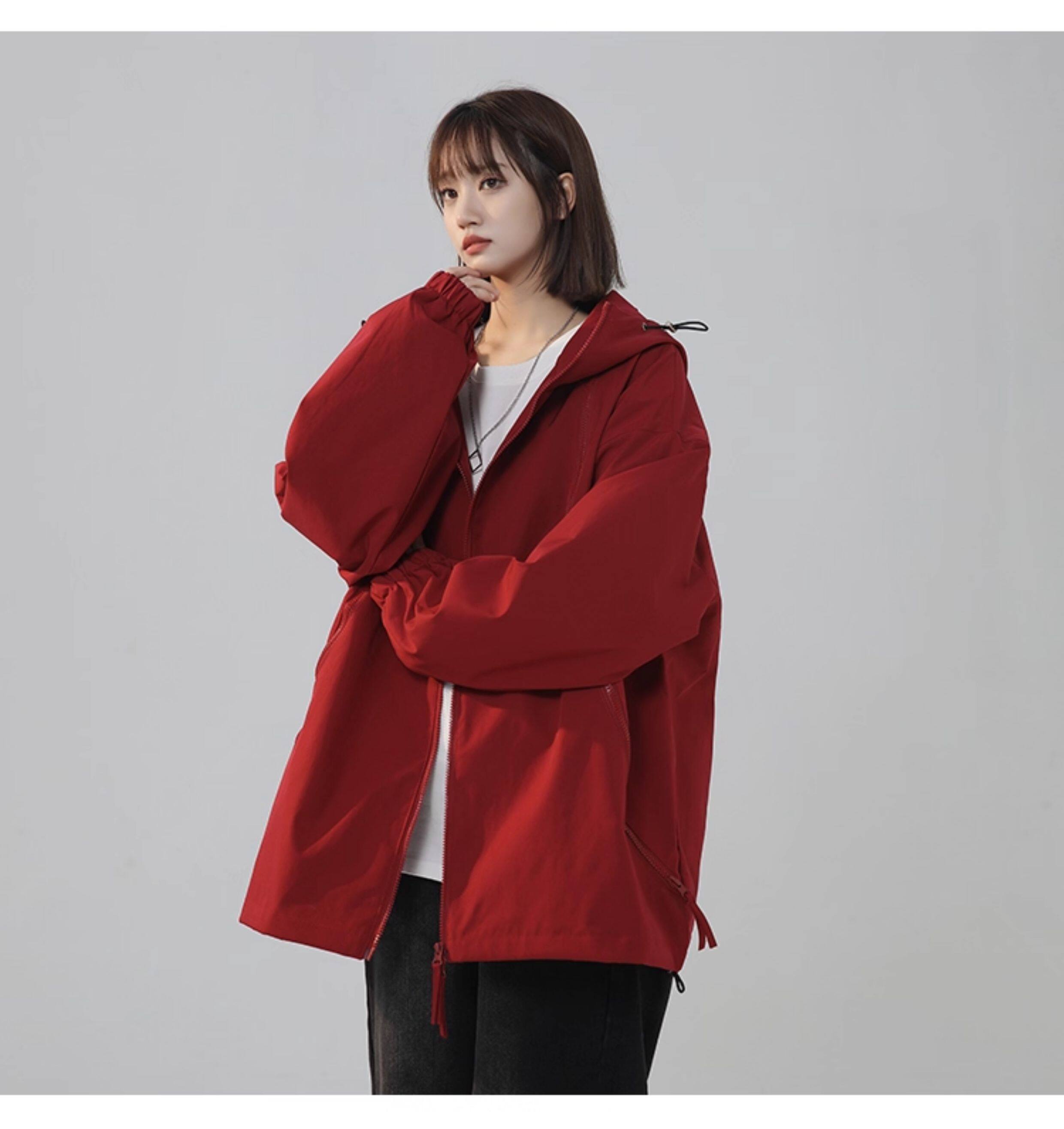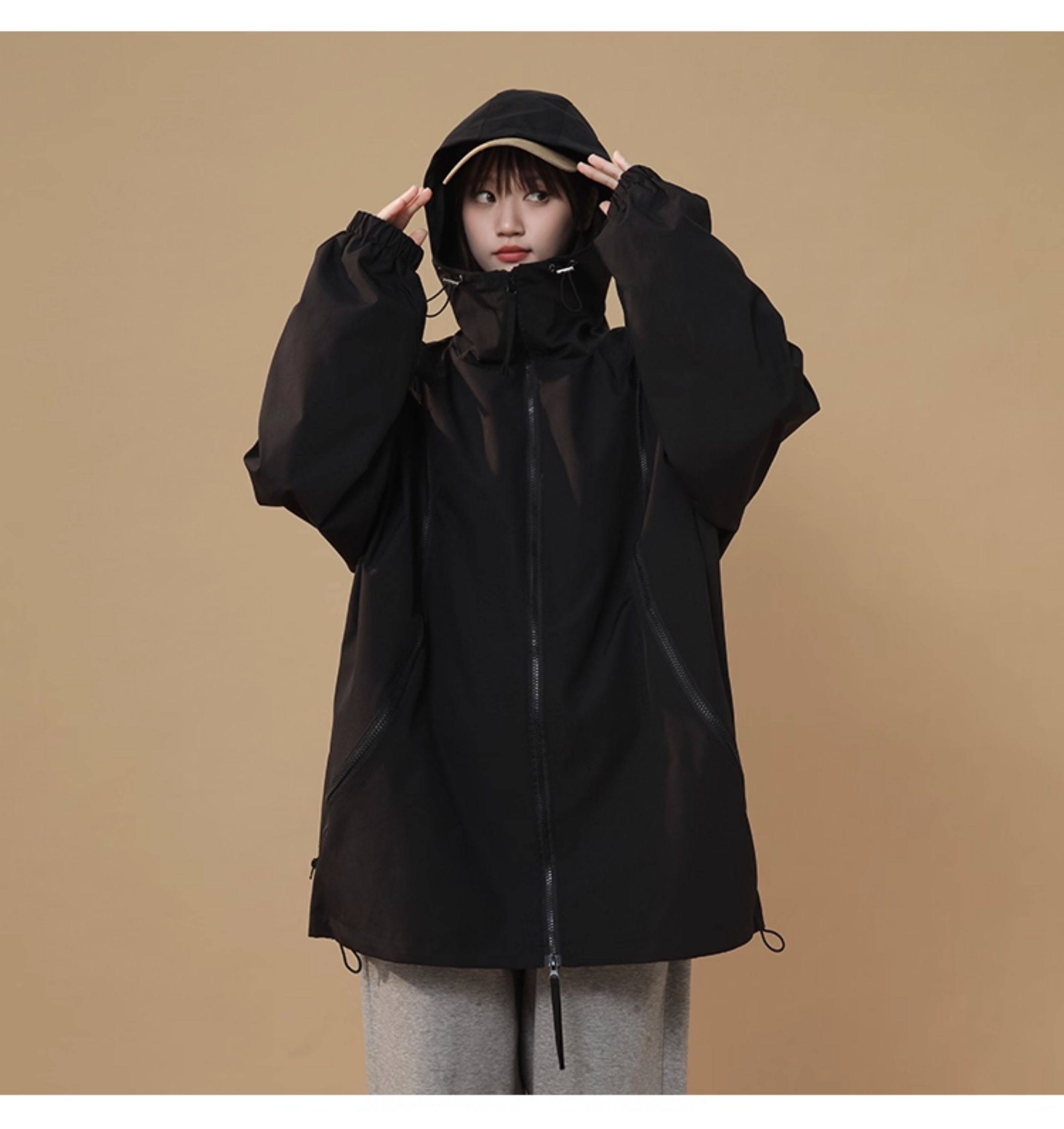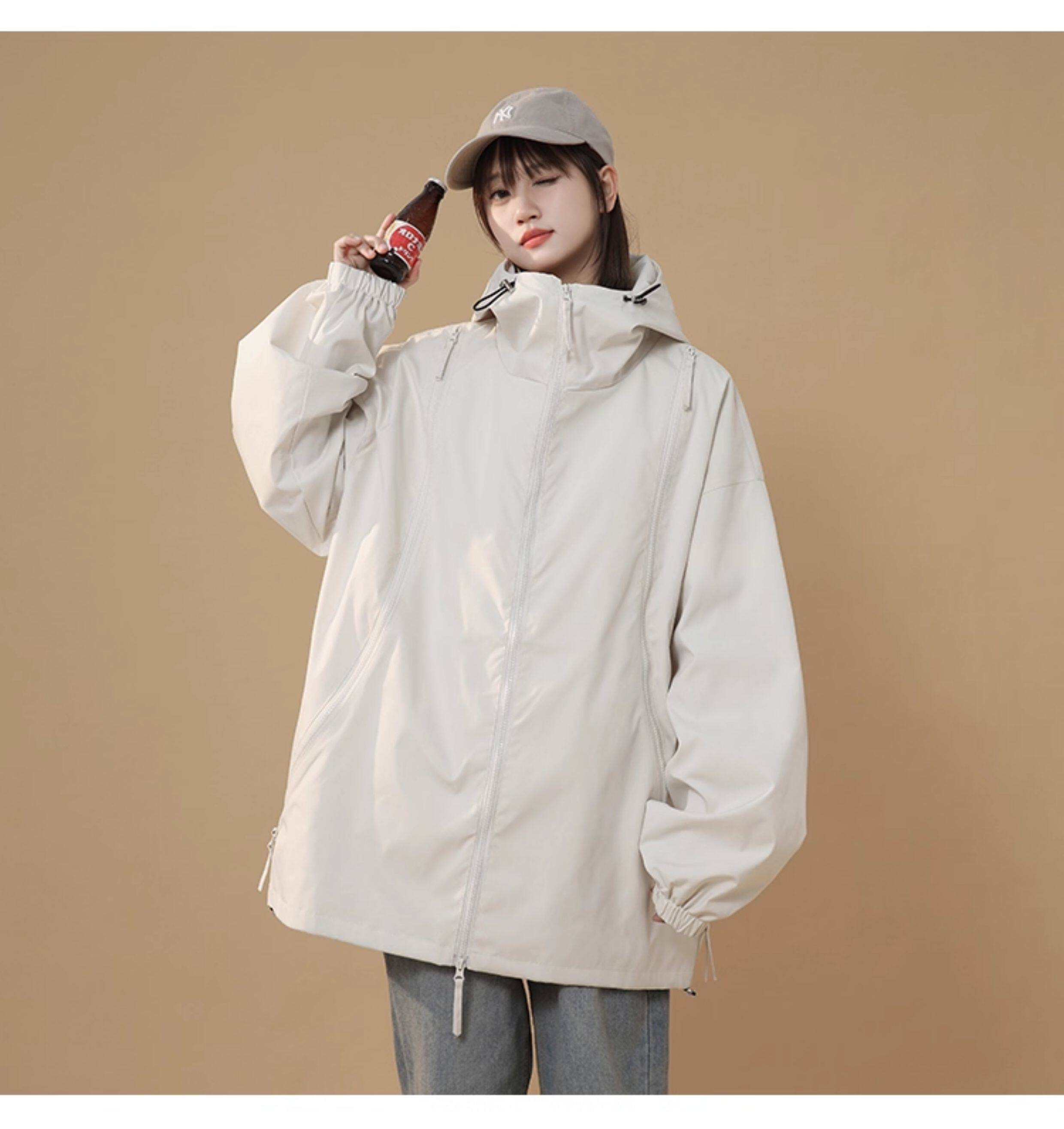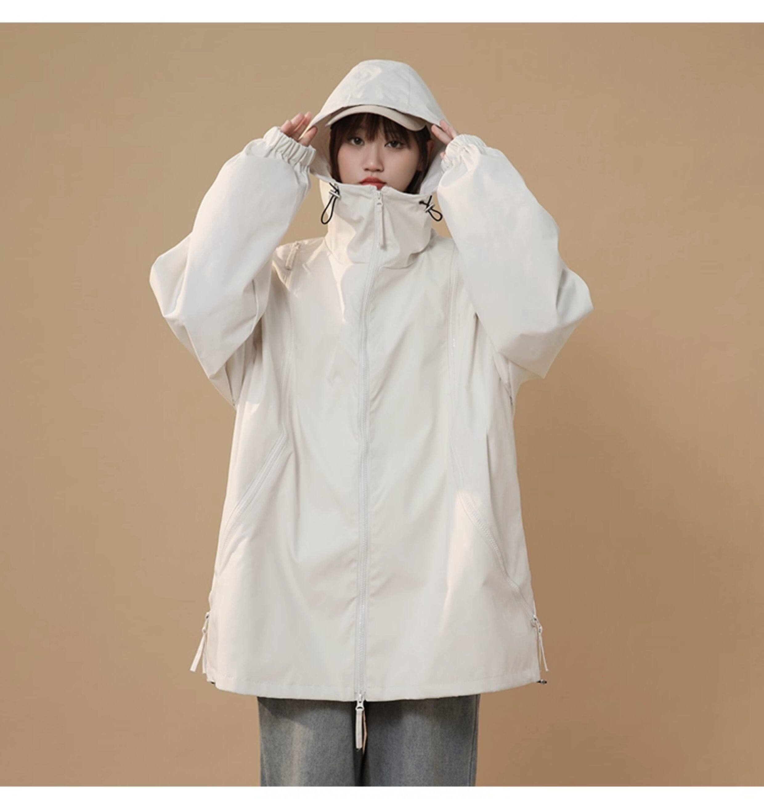 洛濃無性別秋季連帽沖鋒夾克男女純色寬鬆大碼外套青少年防潑水潮