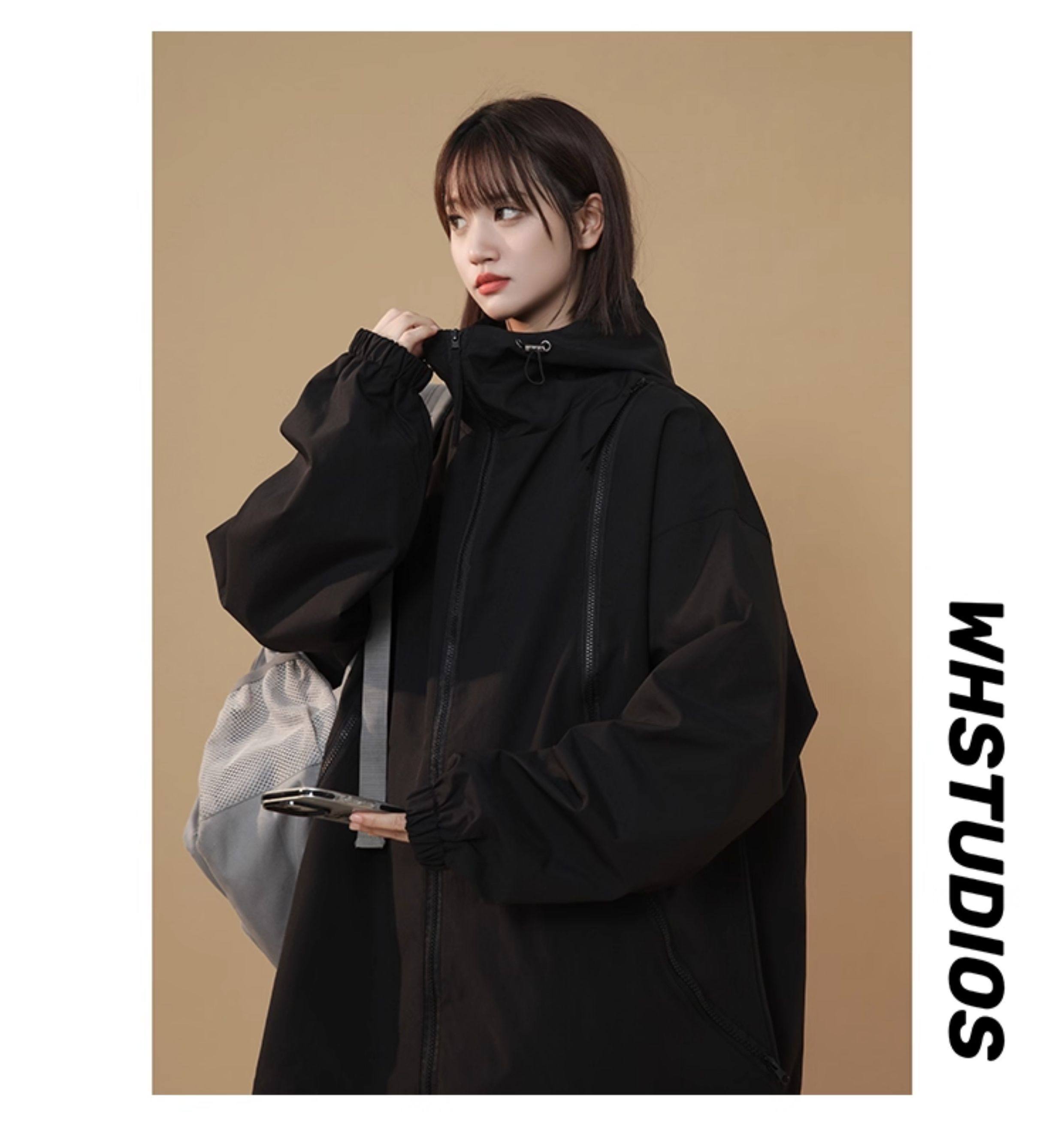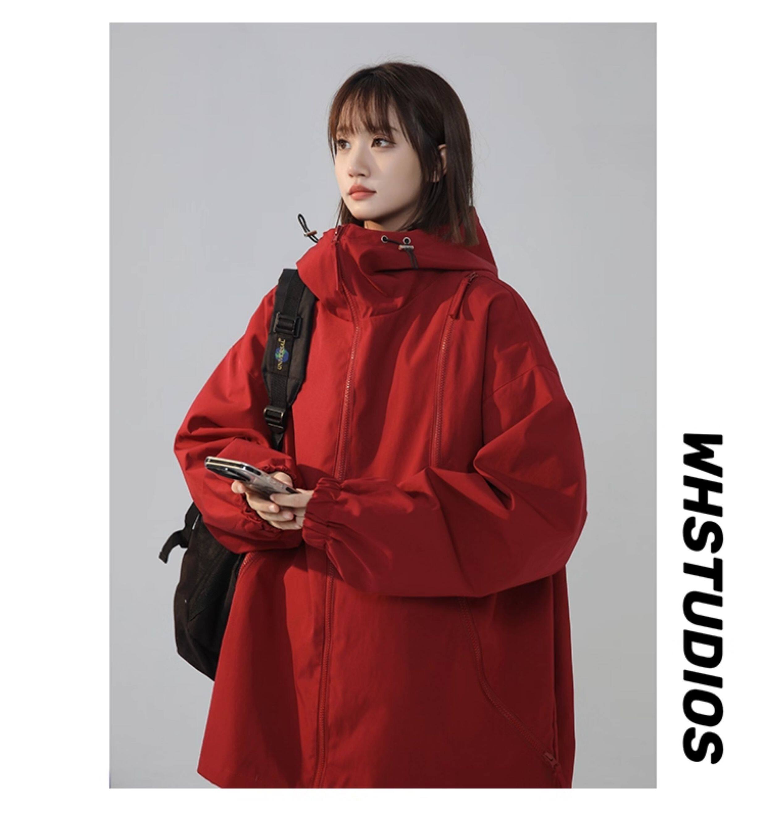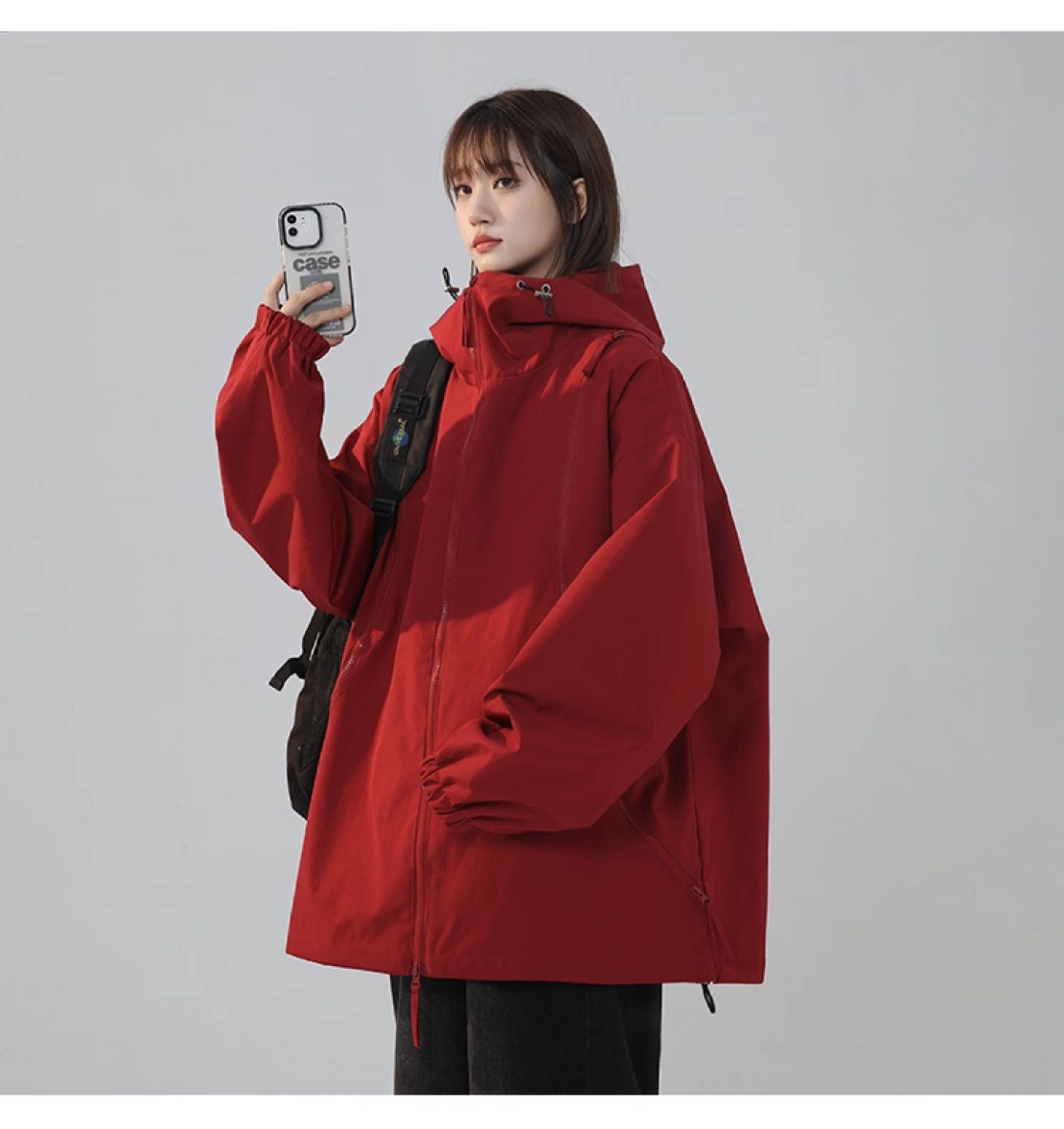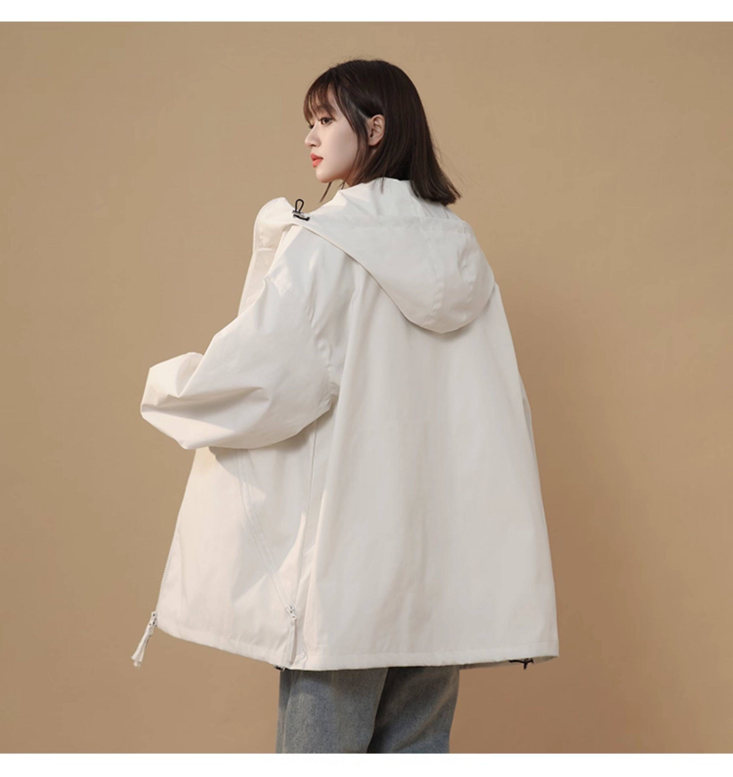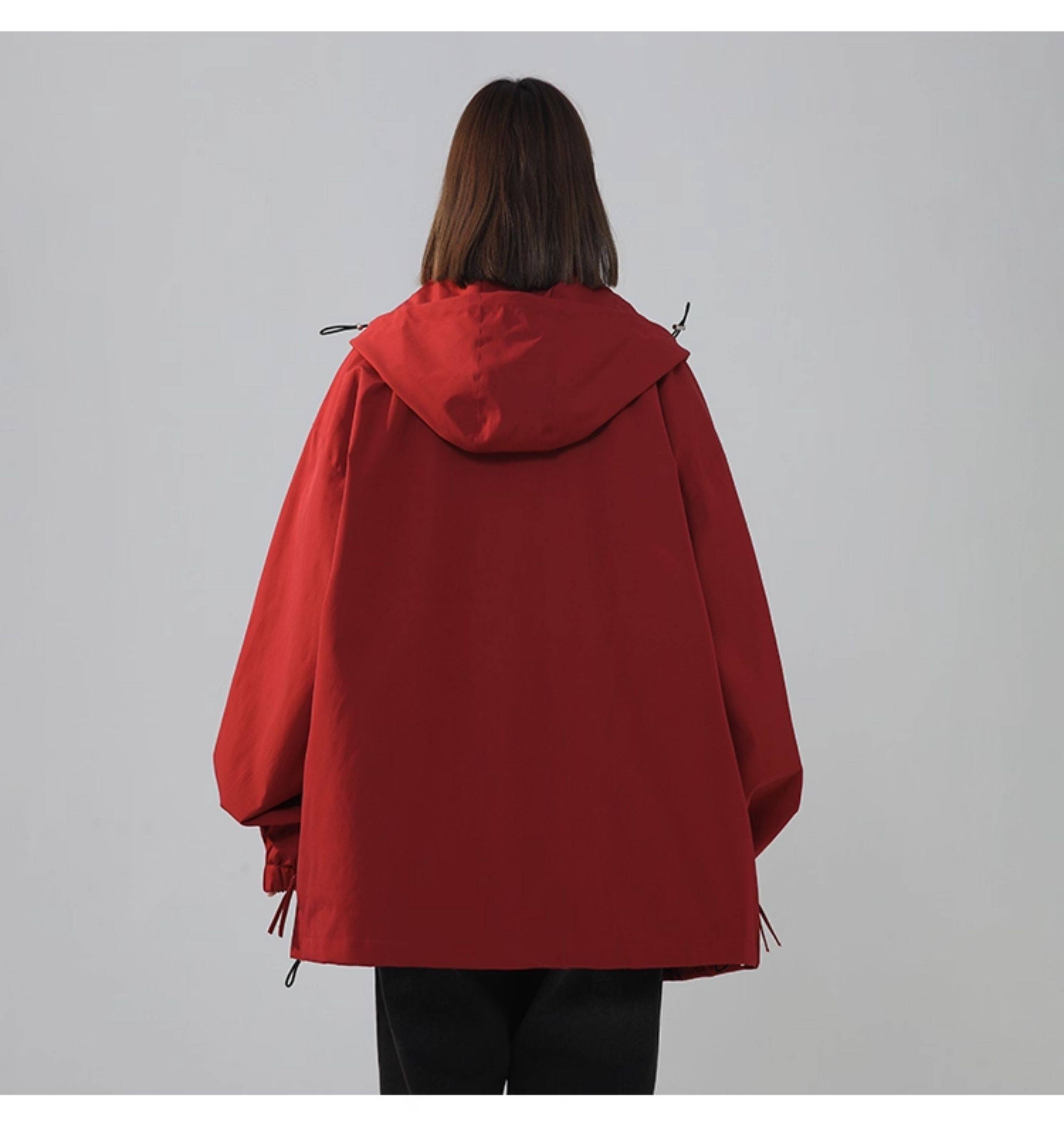 洛濃無性別秋季連帽沖鋒夾克男女純色寬鬆大碼外套青少年防潑水潮