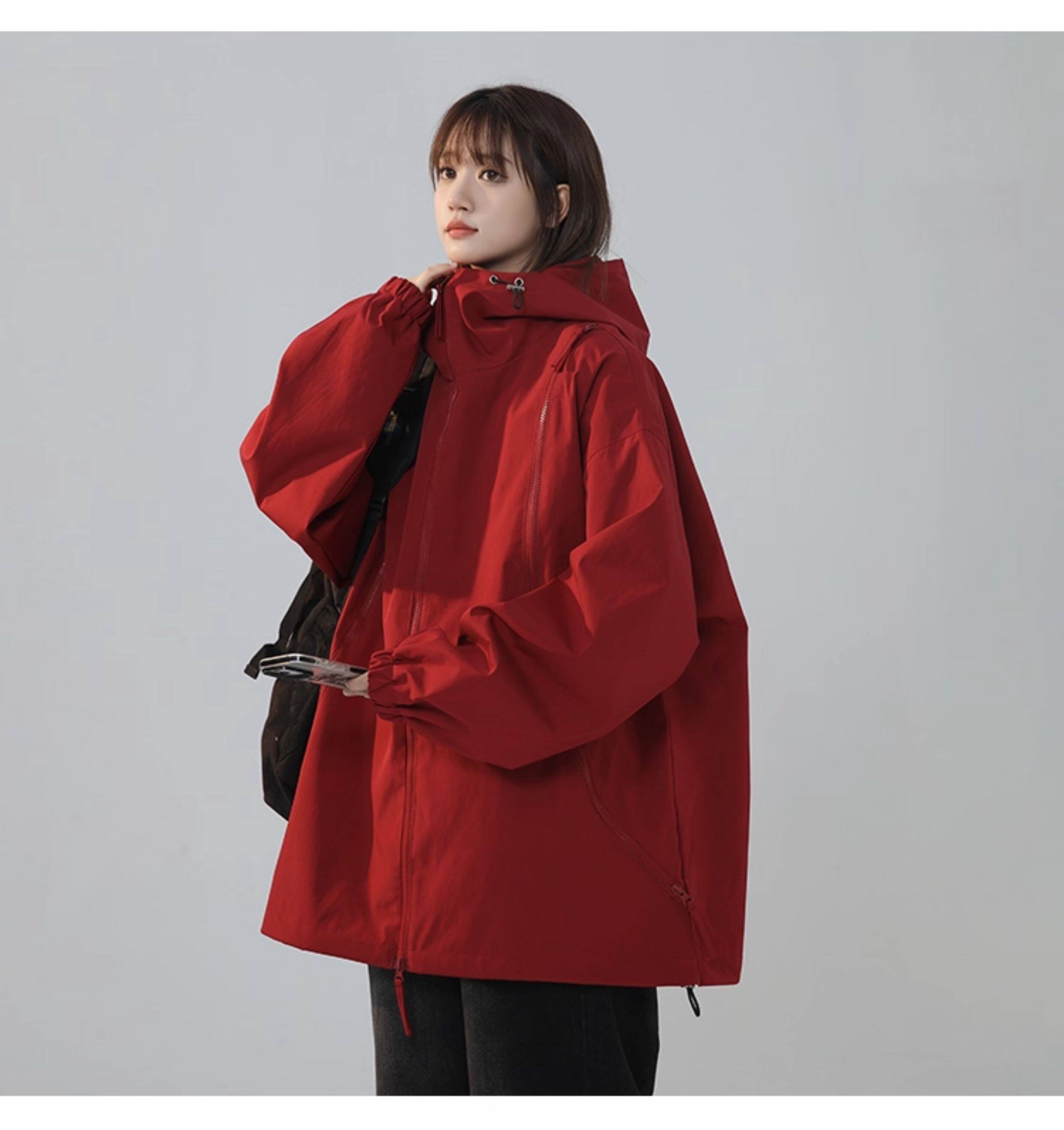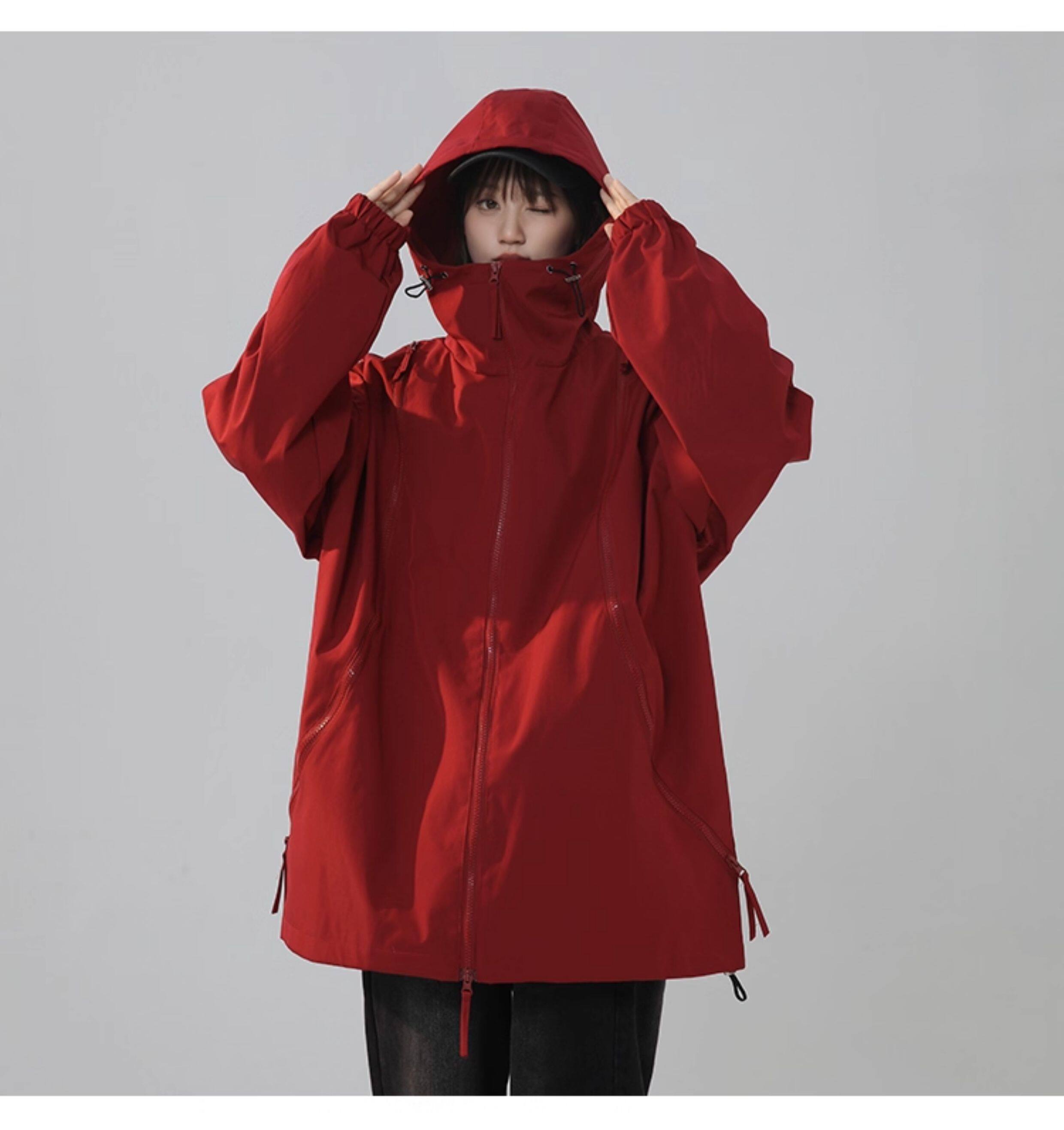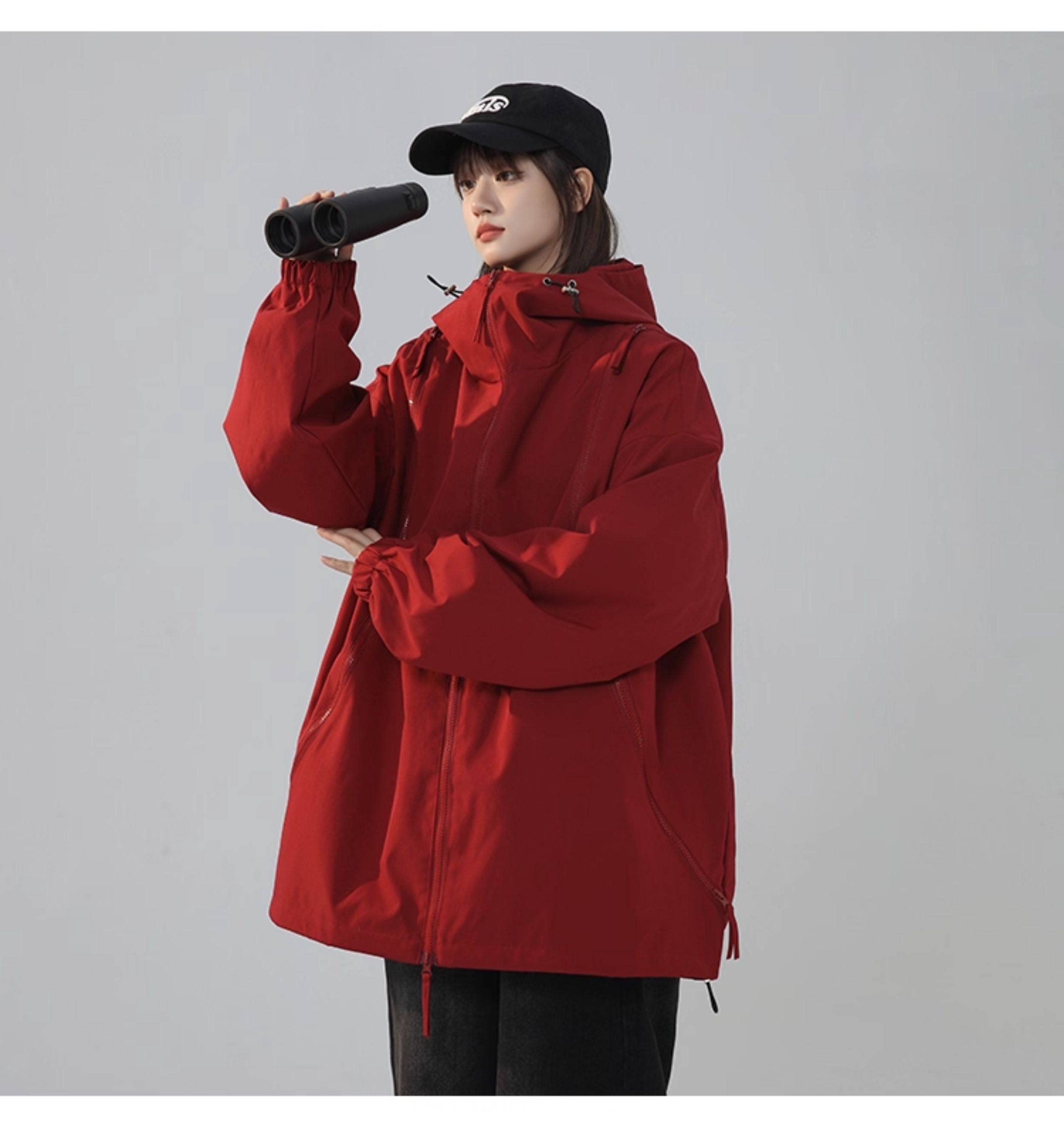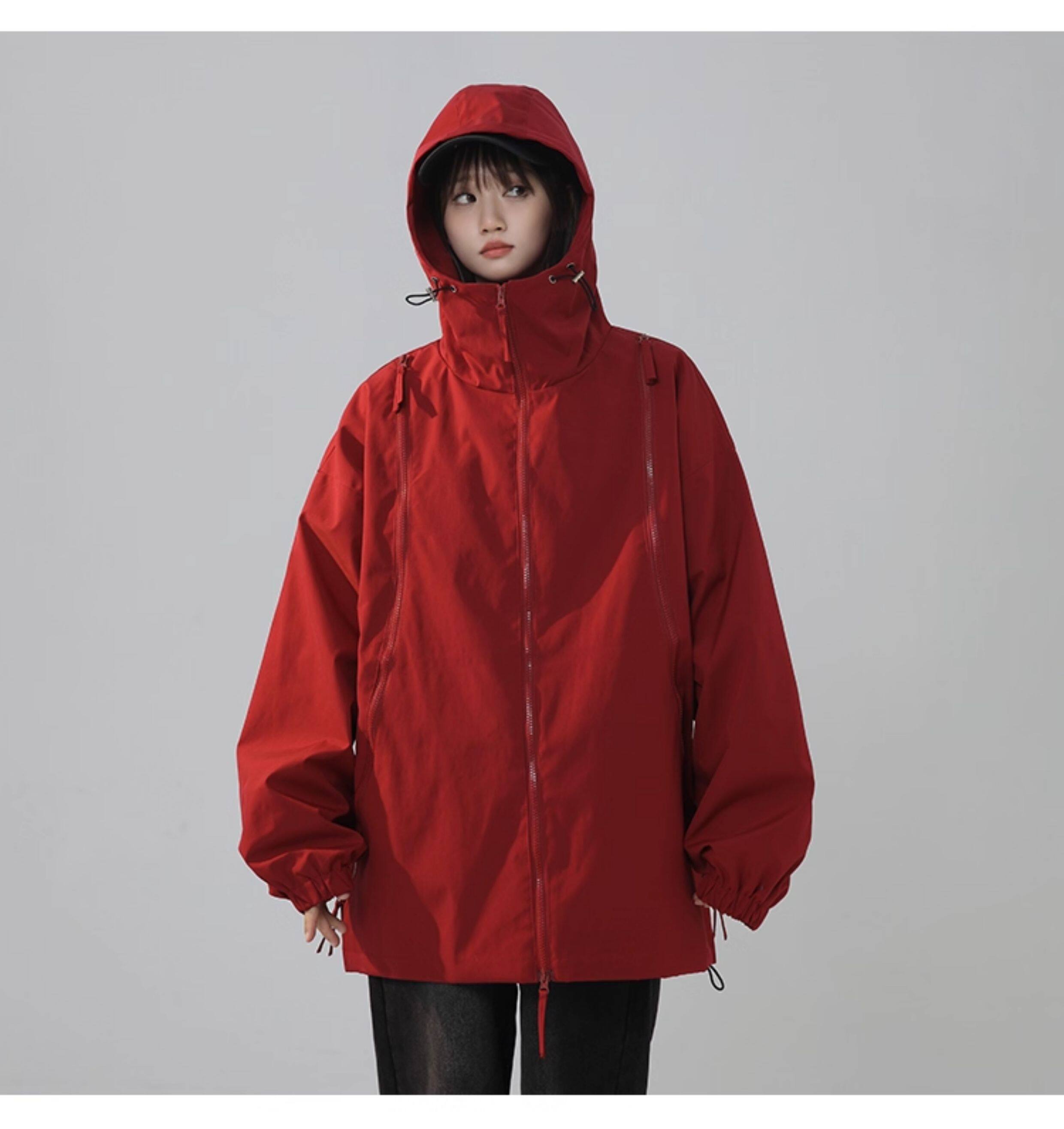 洛濃無性別秋季連帽沖鋒夾克男女純色寬鬆大碼外套青少年防潑水潮
