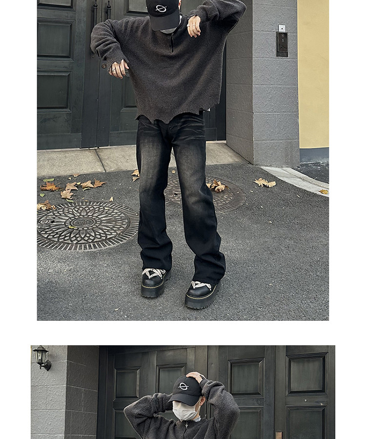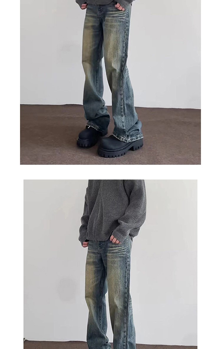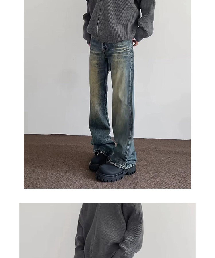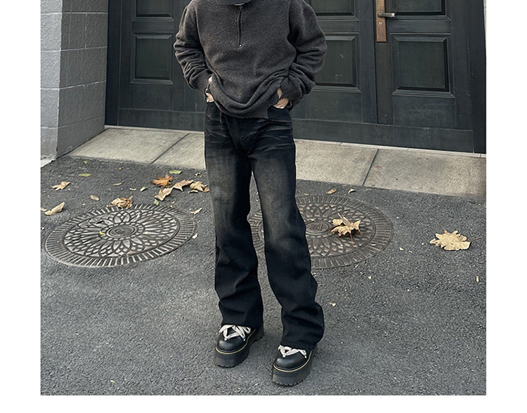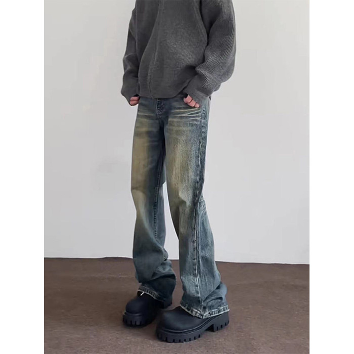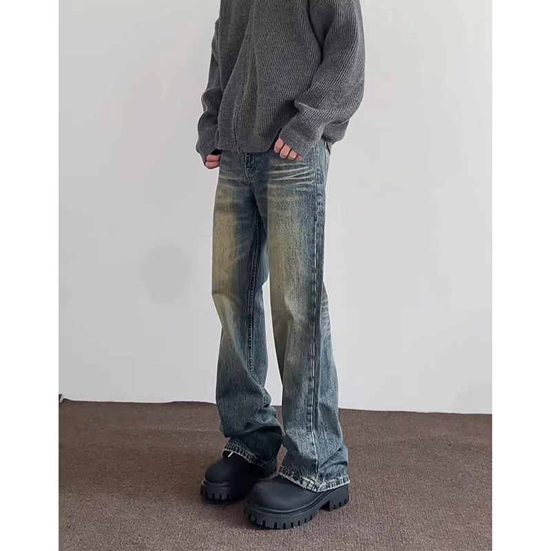 微喇復古藍牛仔褲男美式高街hiphop水洗做舊潮牌設計漸變直筒長褲
