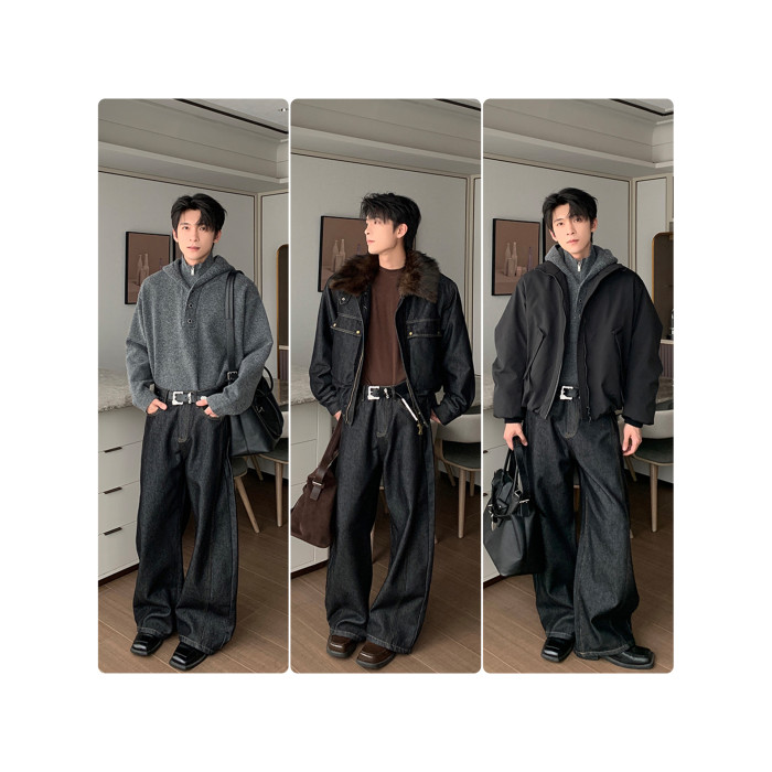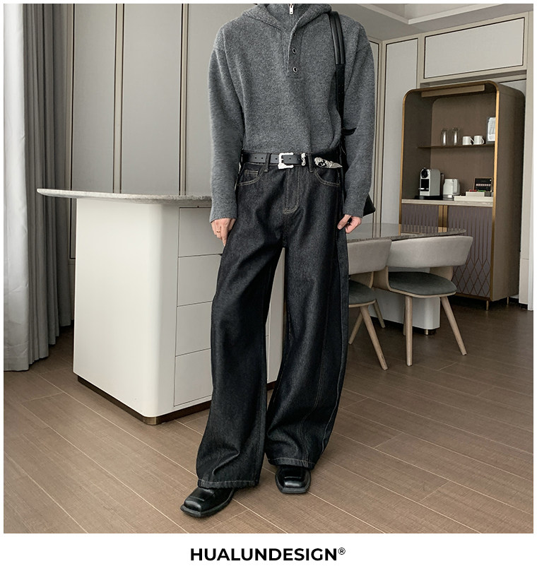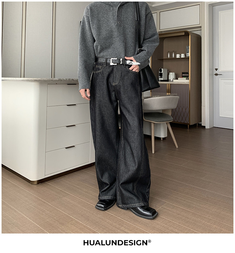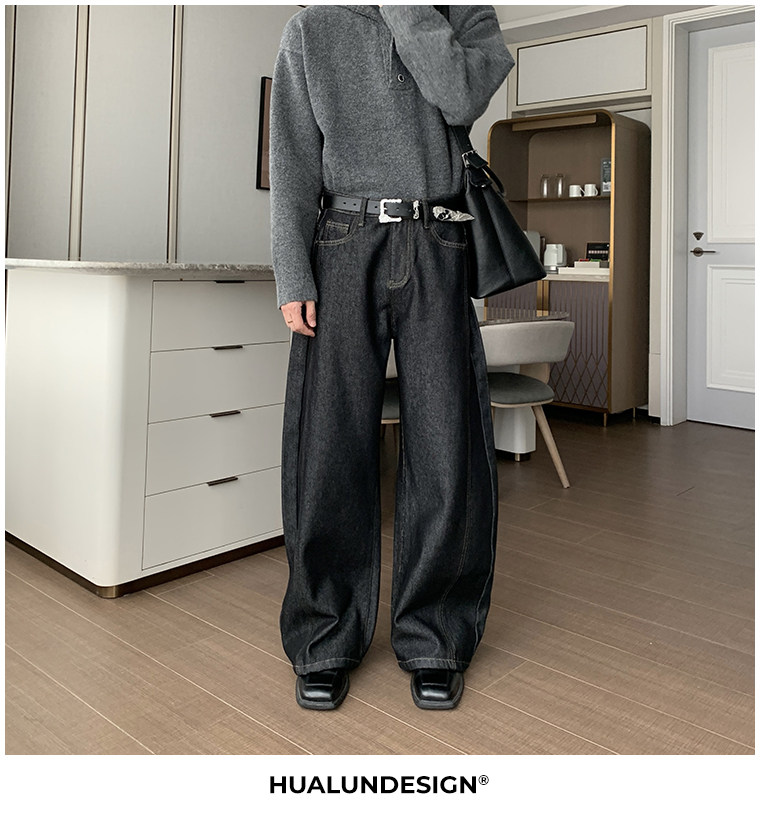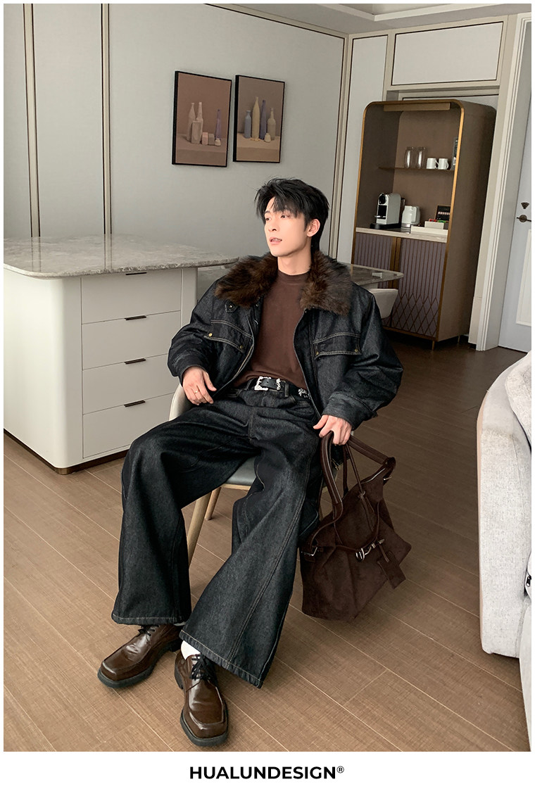 Hualun冬季加絨加厚牛仔褲男寬鬆保暖褲子男款潮流百搭濶腿彎刀褲