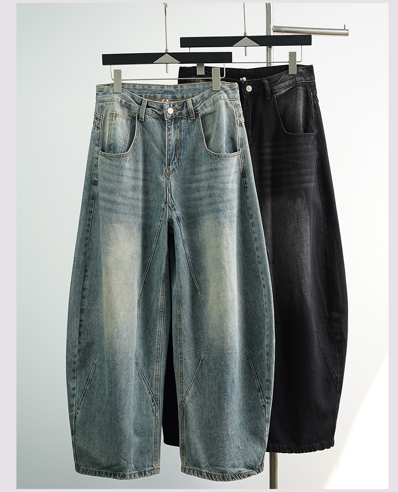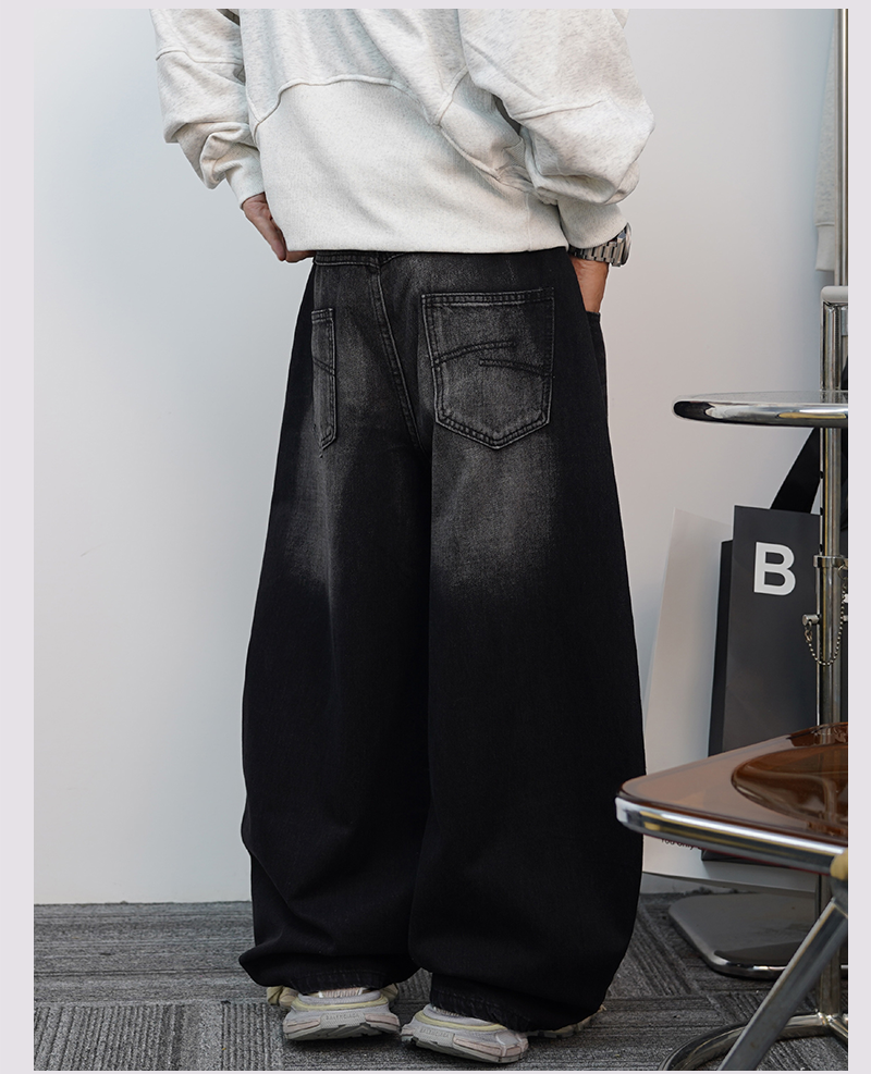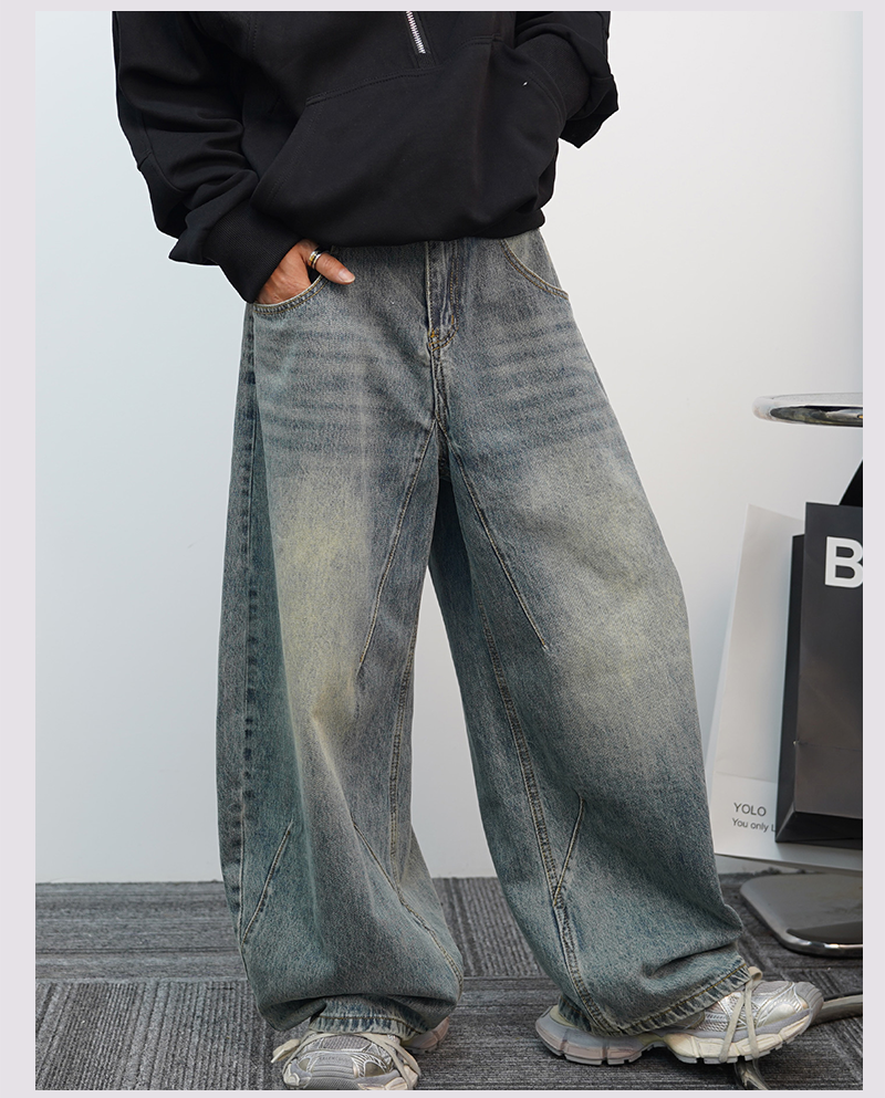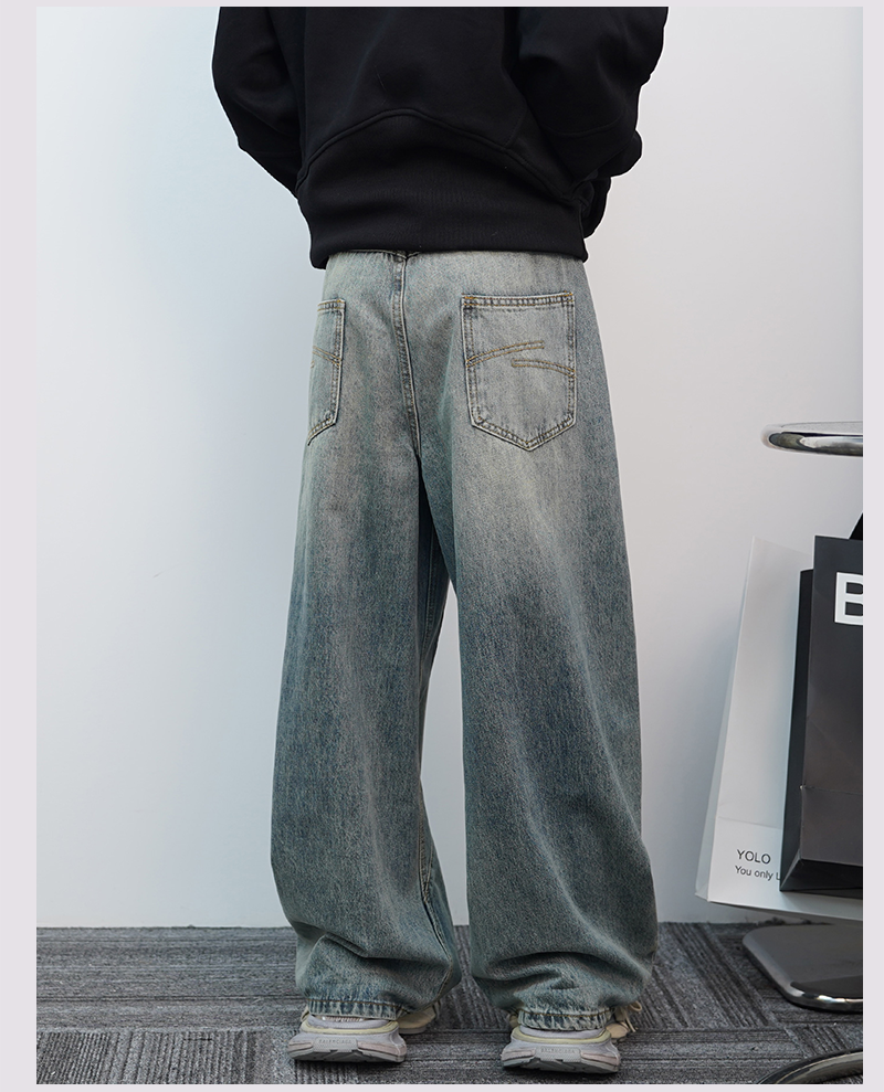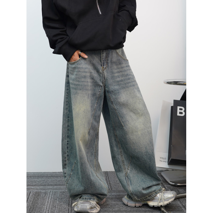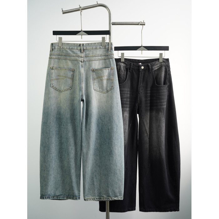 美式彎刀牛仔褲男款高街休閒濶腿褲高級潮流復古水洗男女褲子冬季
