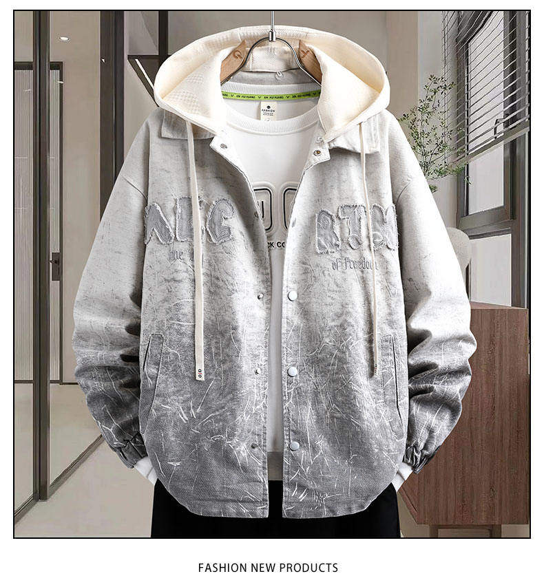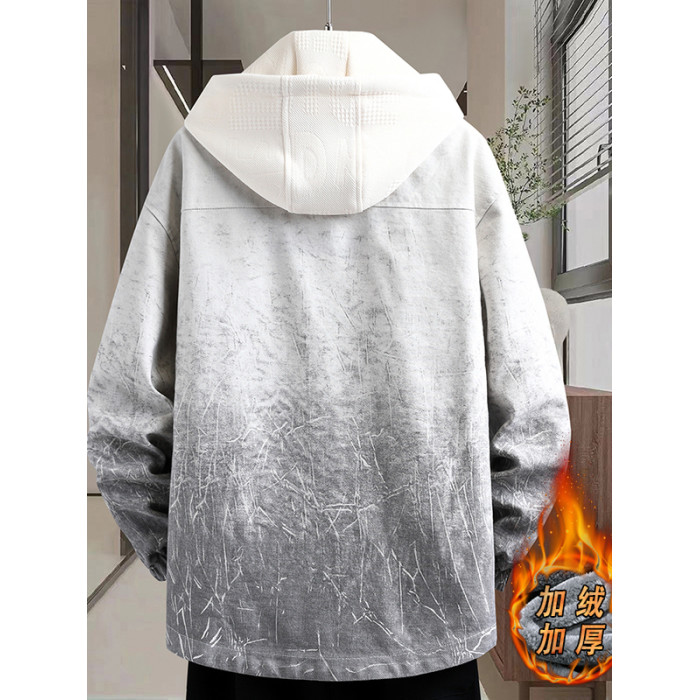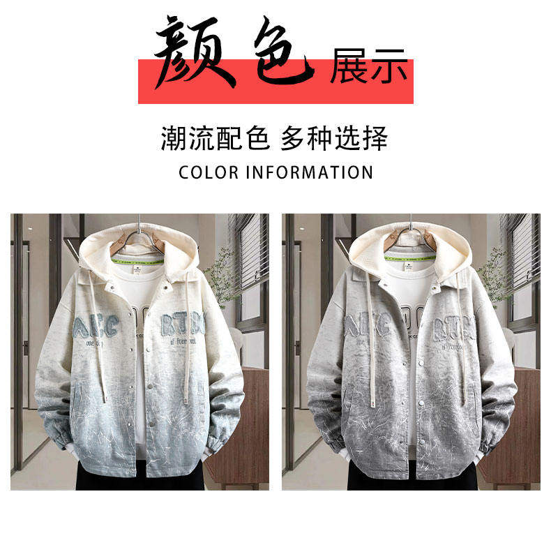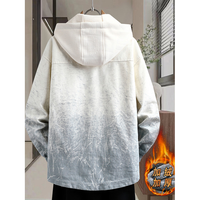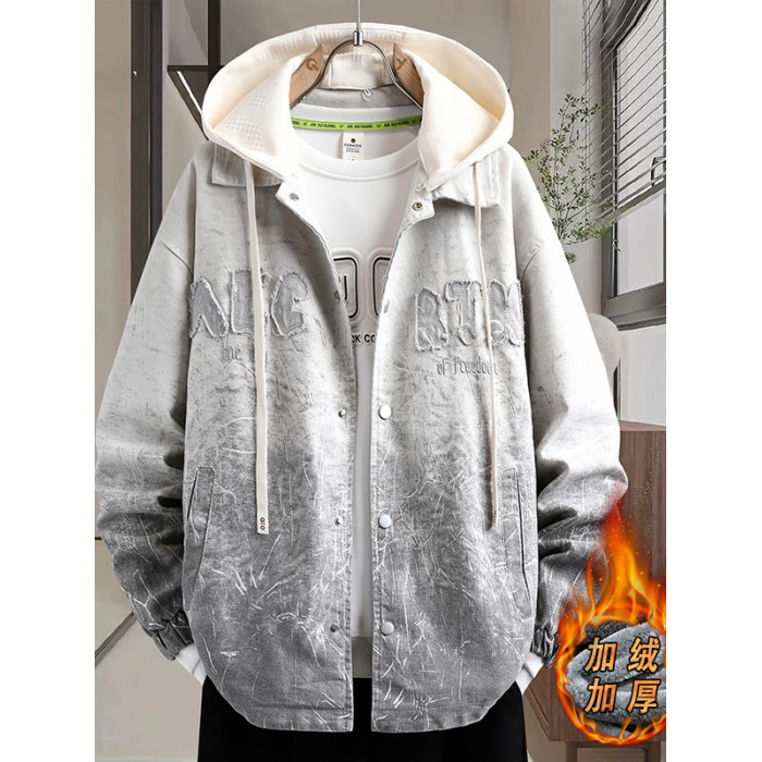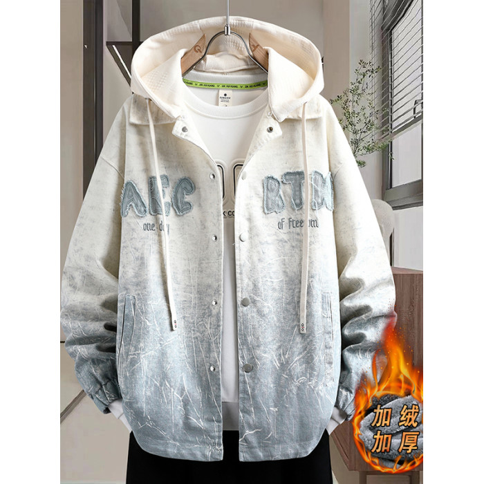加絨加厚連帽牛仔外套男秋冬季時尚潮流漸變色夾克青少年男孩褂子