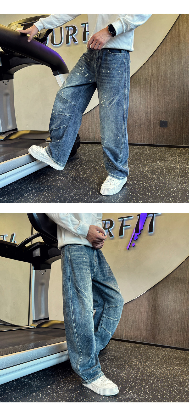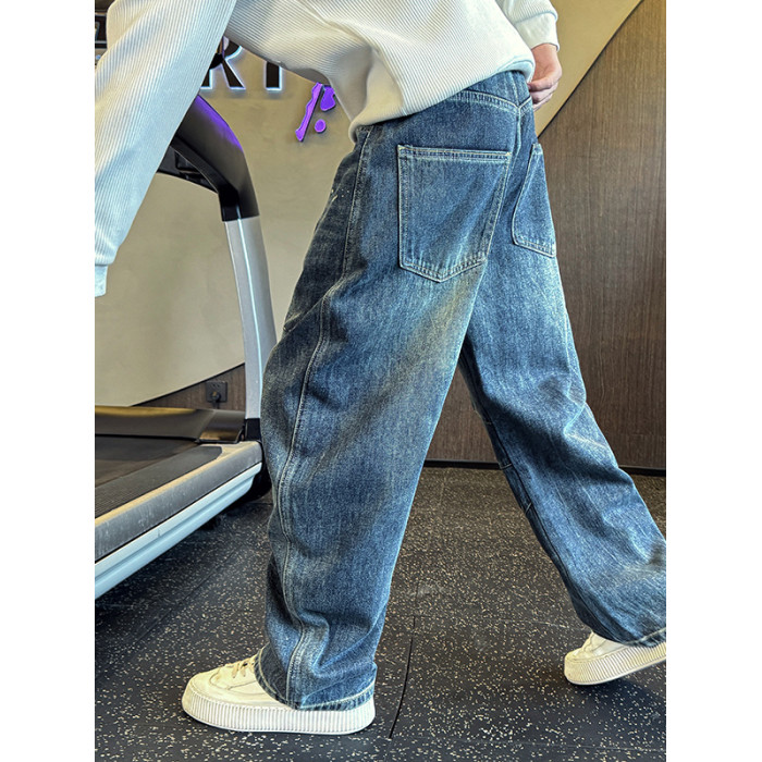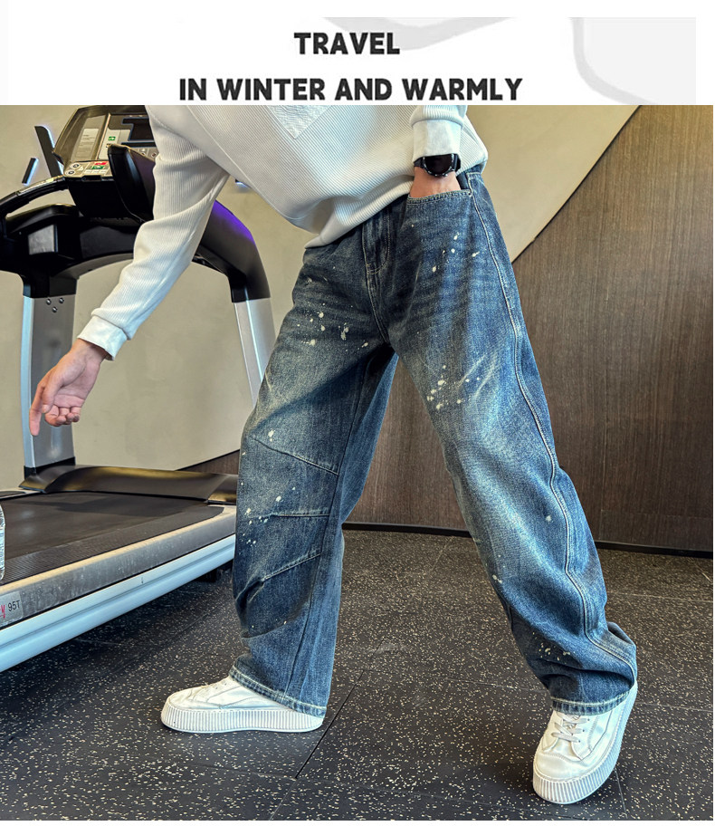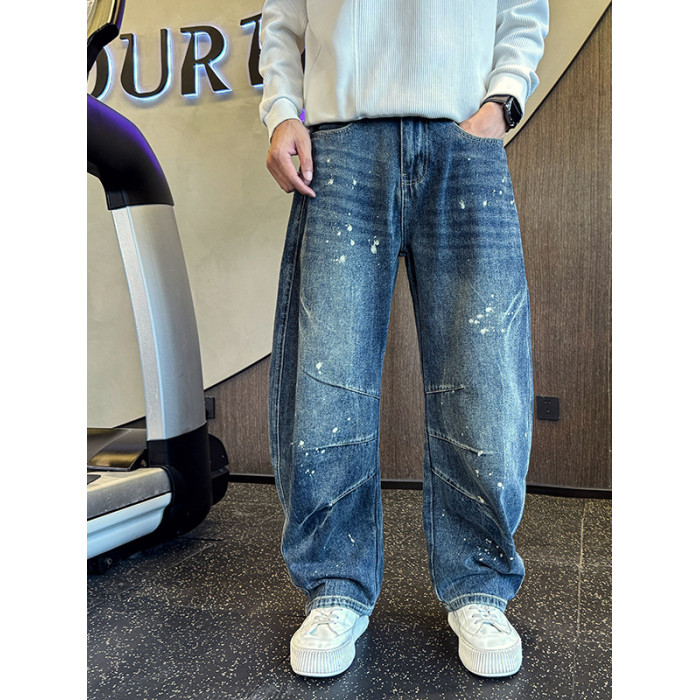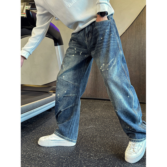 Oboy秋冬季美式高街潑墨彎刀牛仔褲男潮牌寬鬆濶腿褲痞帥直筒長褲
