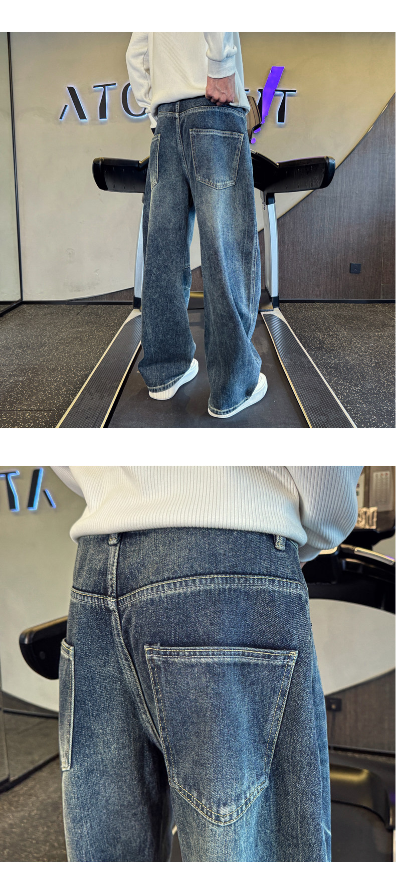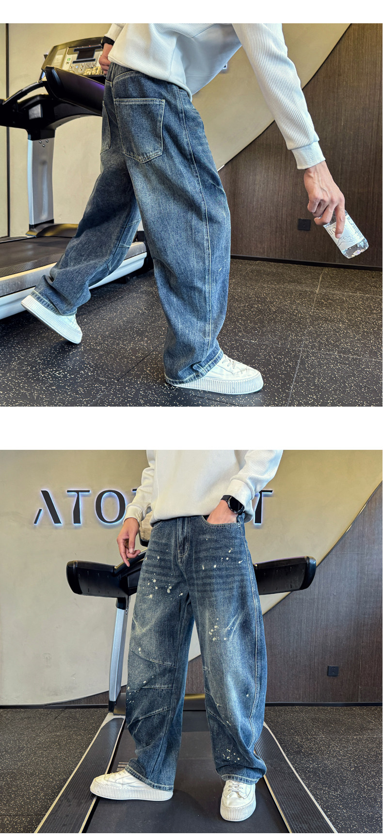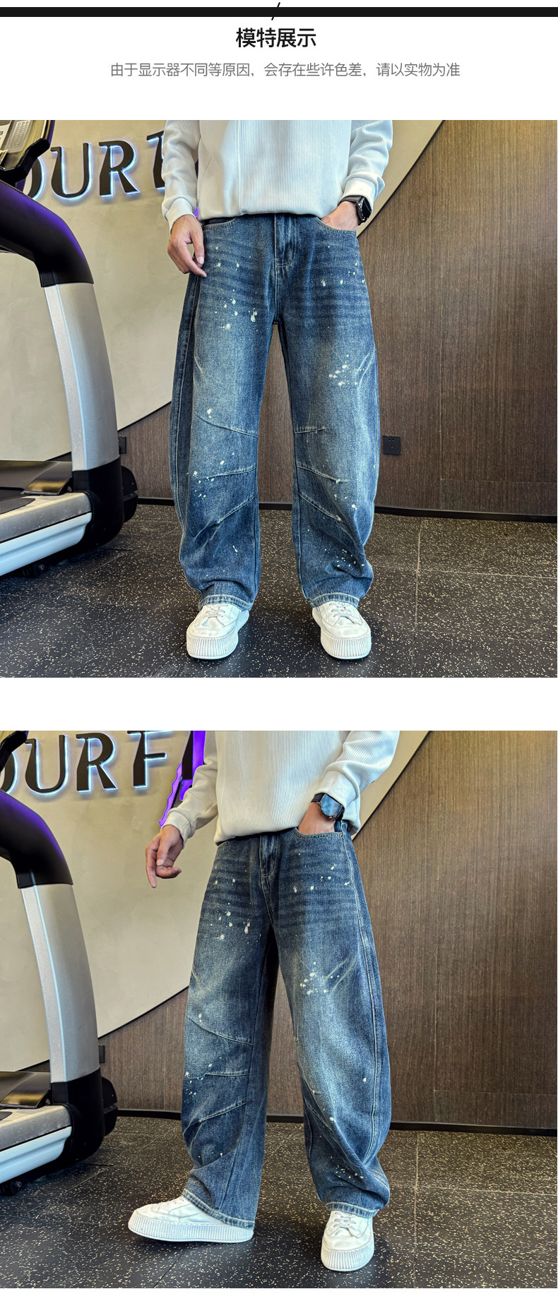 Oboy秋冬季美式高街潑墨彎刀牛仔褲男潮牌寬鬆濶腿褲痞帥直筒長褲