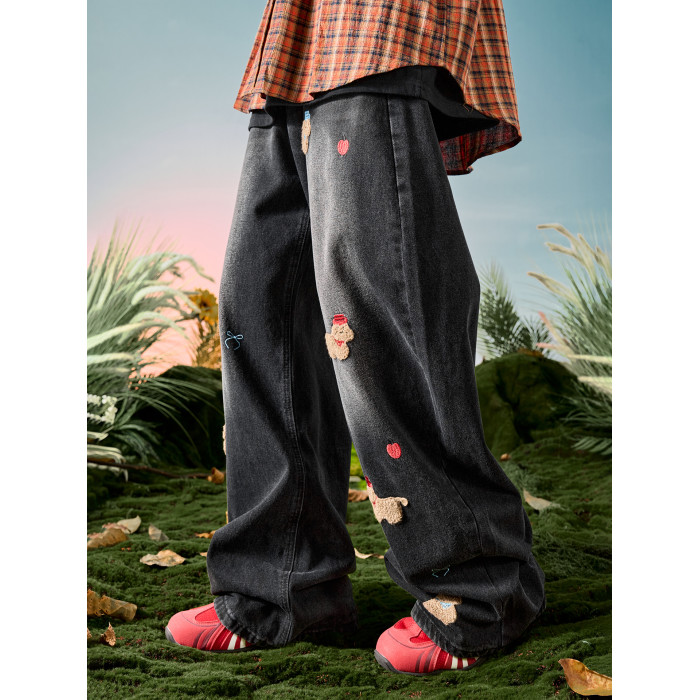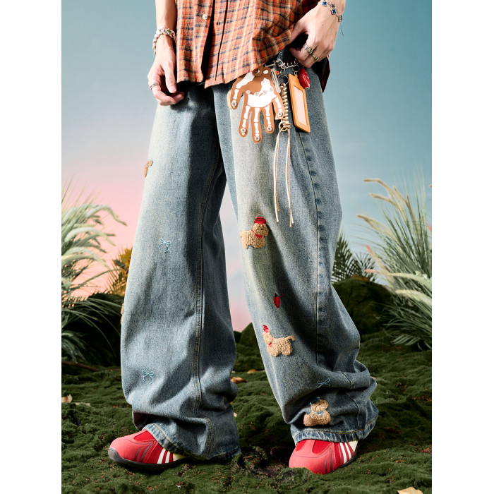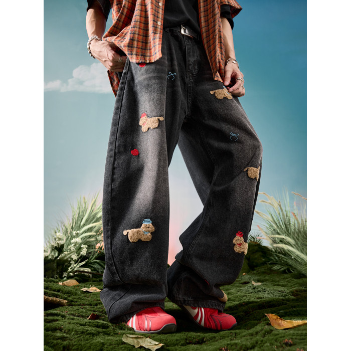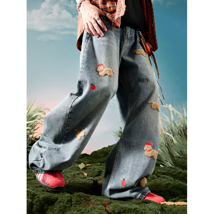 Nuthink美式刺綉小狗牛仔褲水洗復古加絨長褲男款褲子2026年春季
