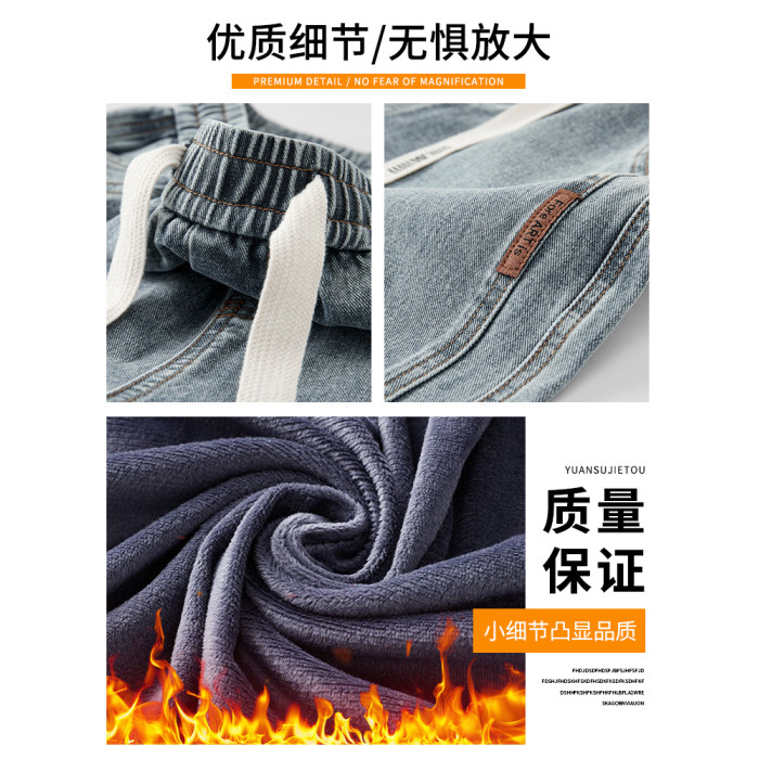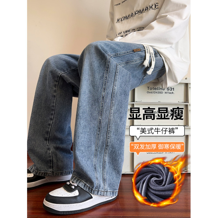 秋冬季新款加絨牛仔褲男款水洗寬鬆直筒休閒長褲潮流美式高街褲子