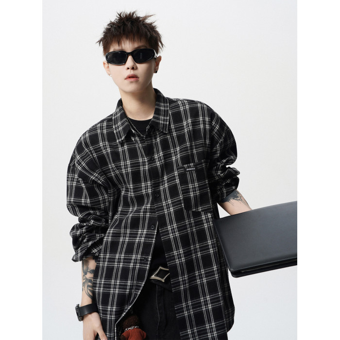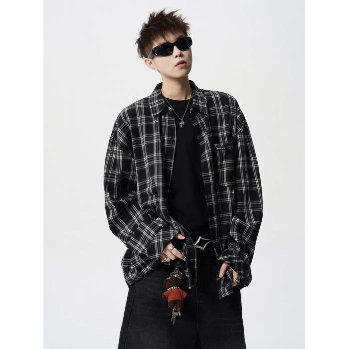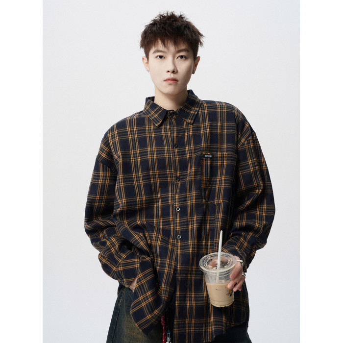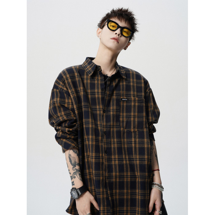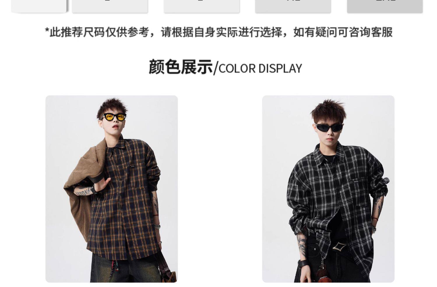 潮牌撞色格子襯衣男冬美式街頭休閒長袖襯衫復古oversize情侶上衣