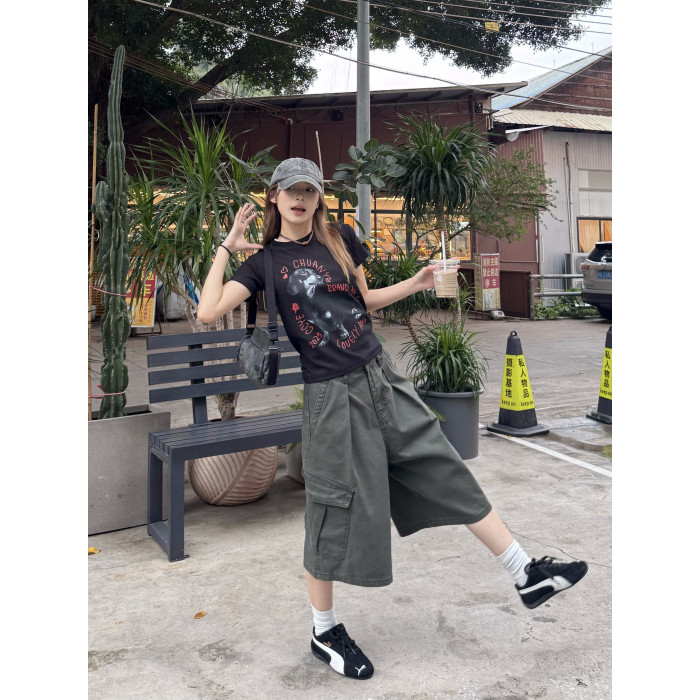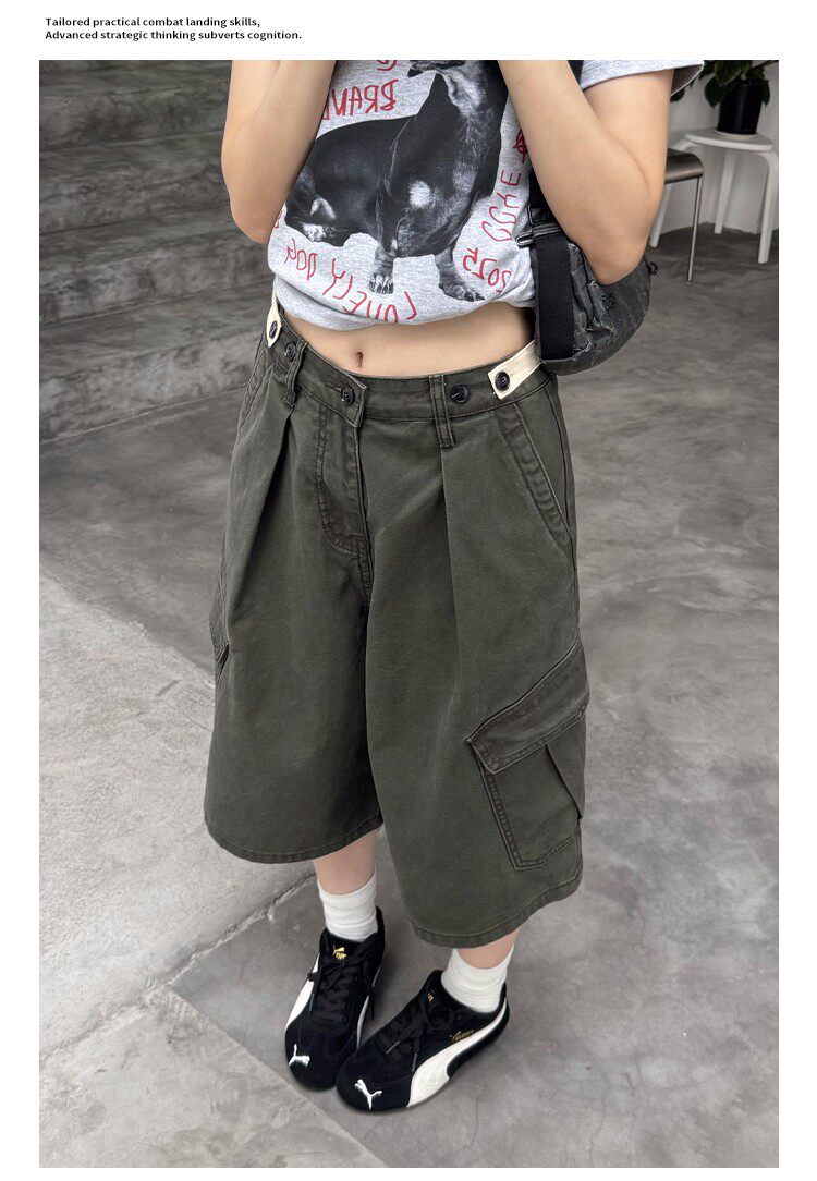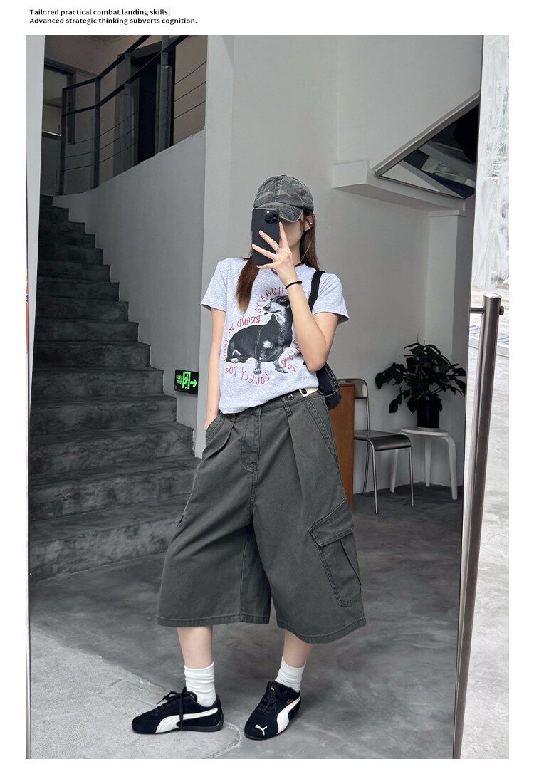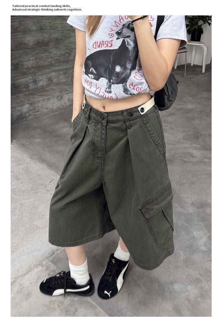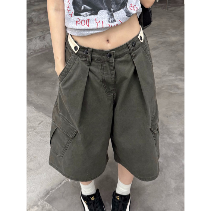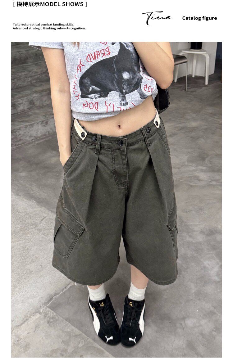 美式復古可調節腰圍工裝七分褲男女寬鬆百搭多口袋cleanfit短褲