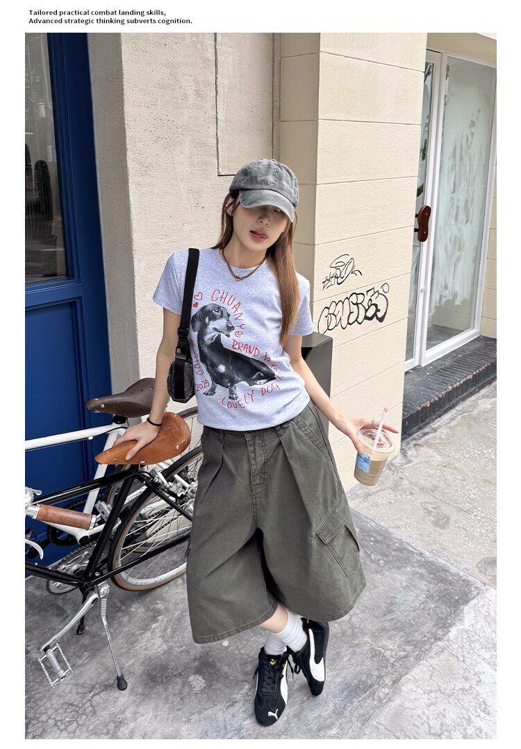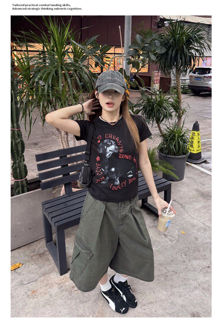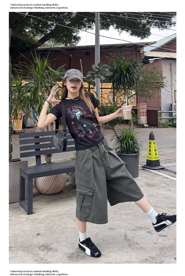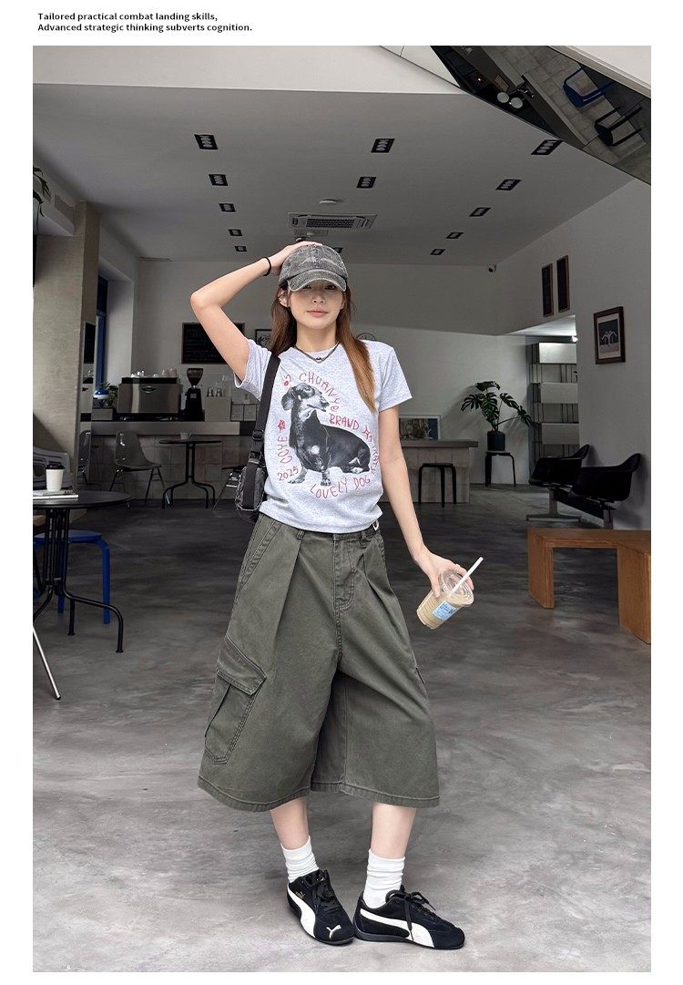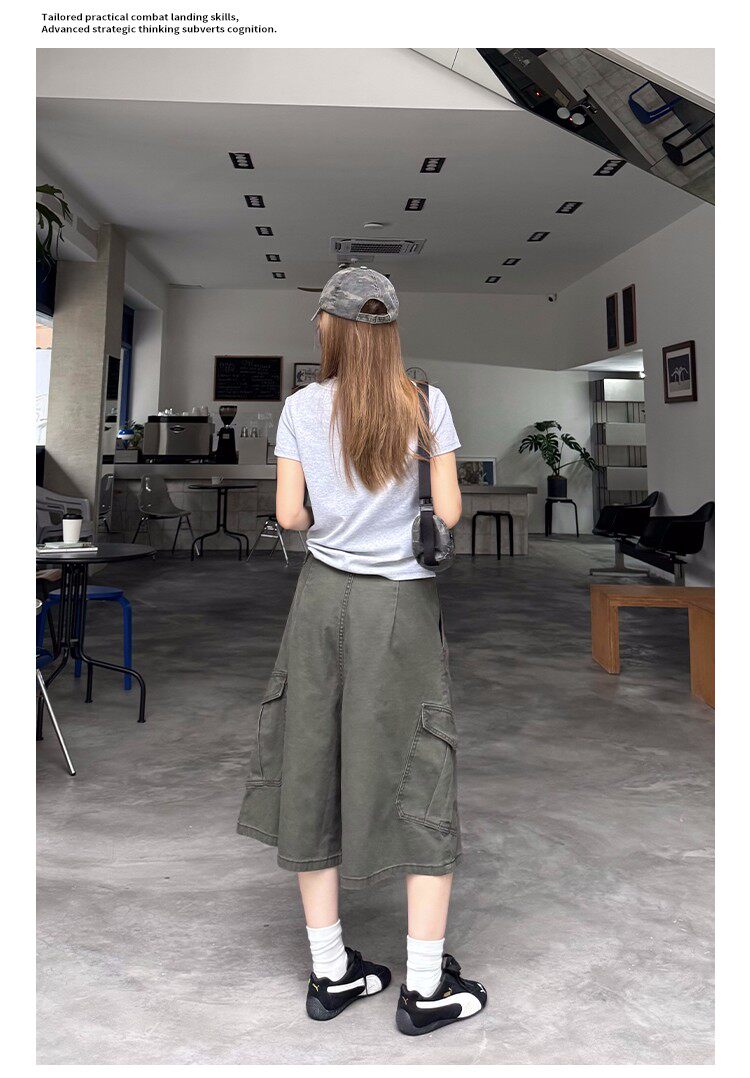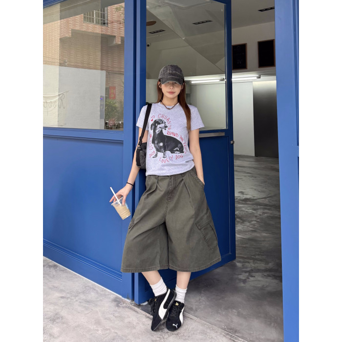 美式復古可調節腰圍工裝七分褲男女寬鬆百搭多口袋cleanfit短褲