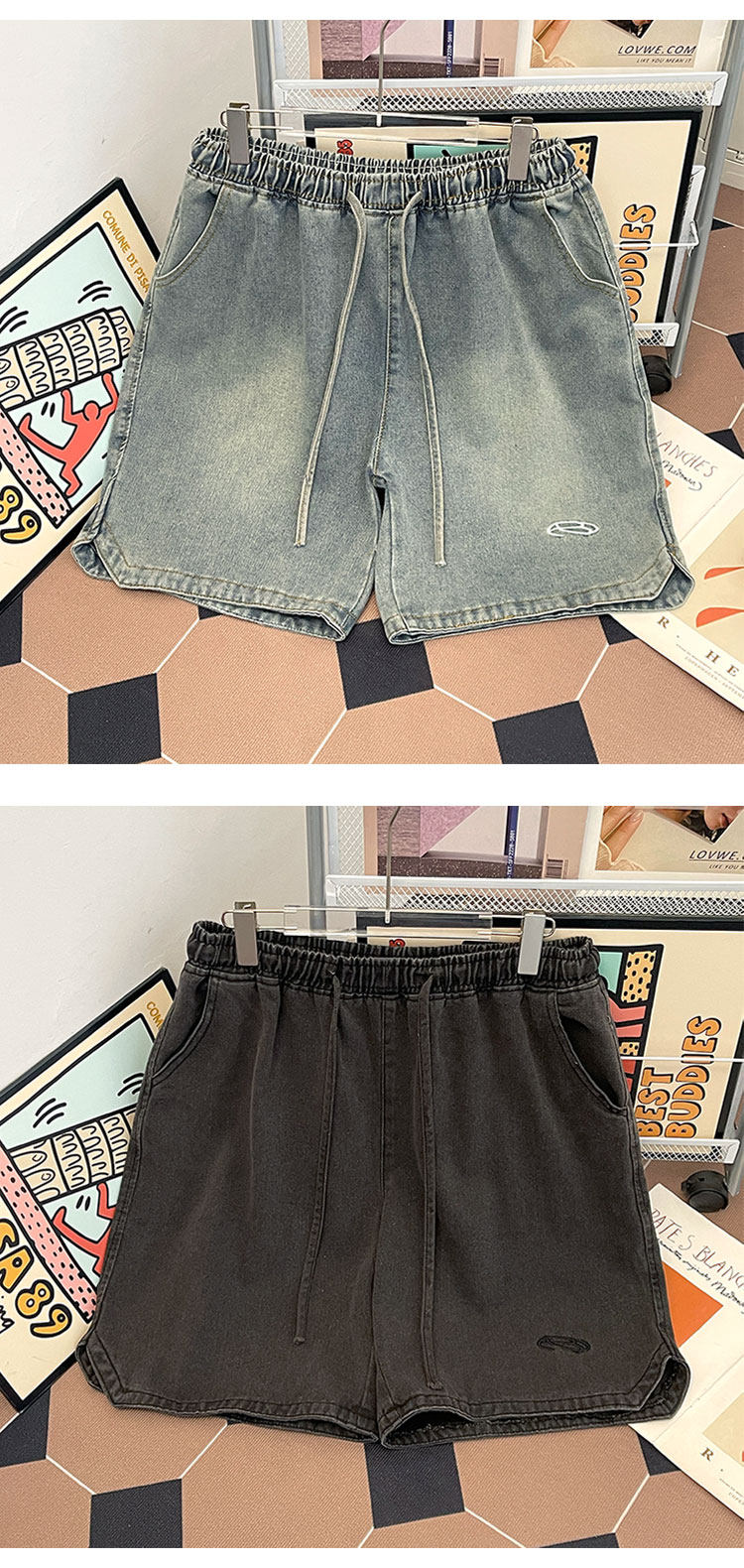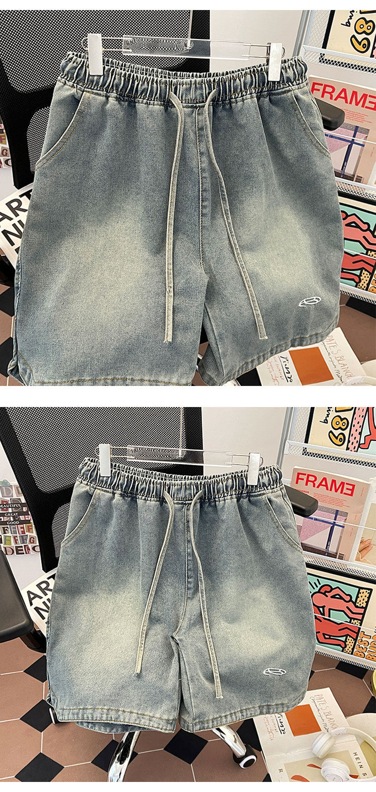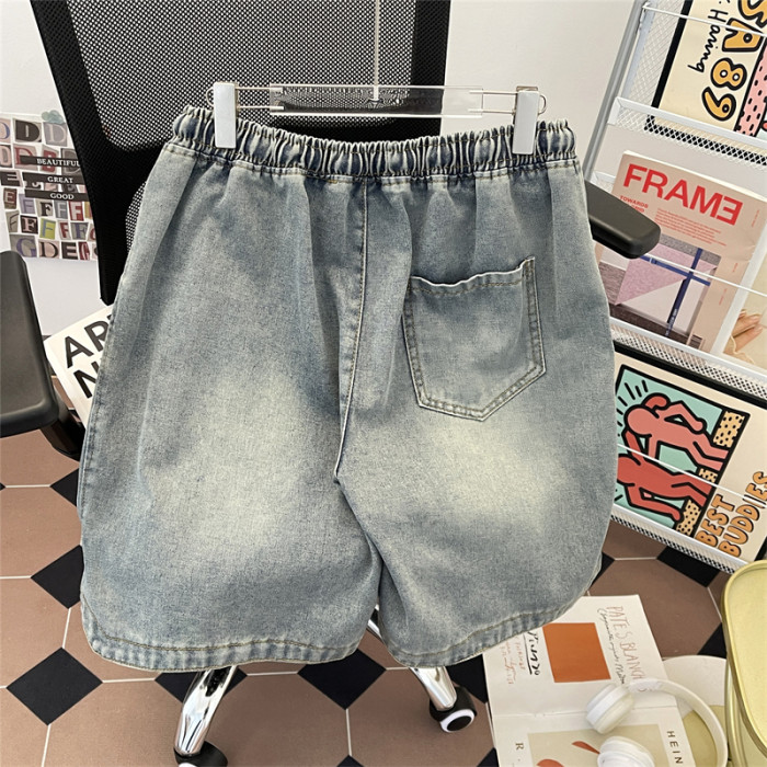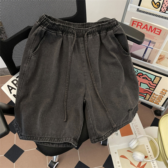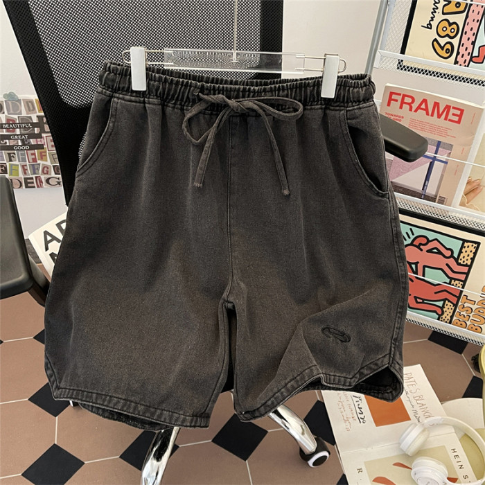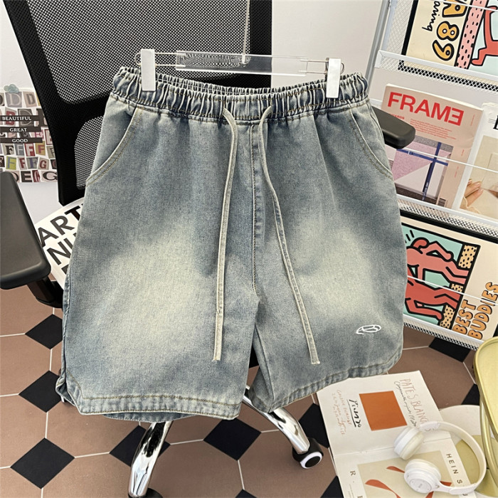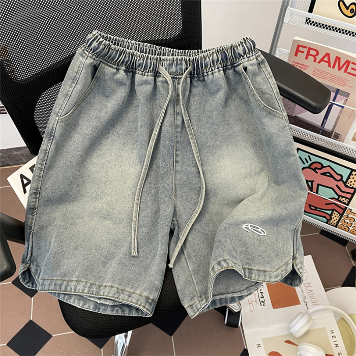 夏季水洗做舊牛仔短褲男美式街頭復古潮牌寬鬆休閒刺綉抽繩五分褲