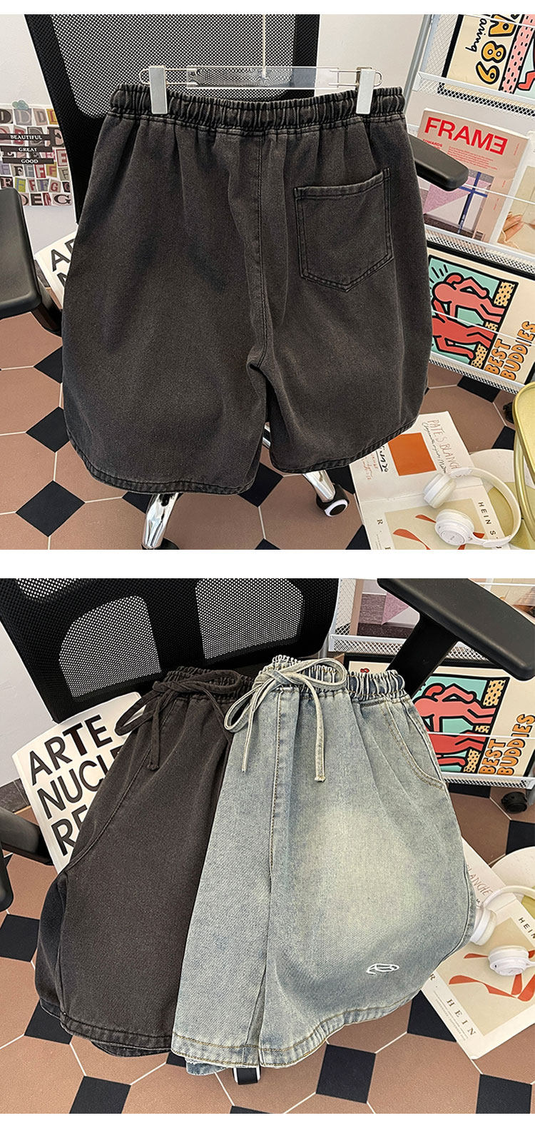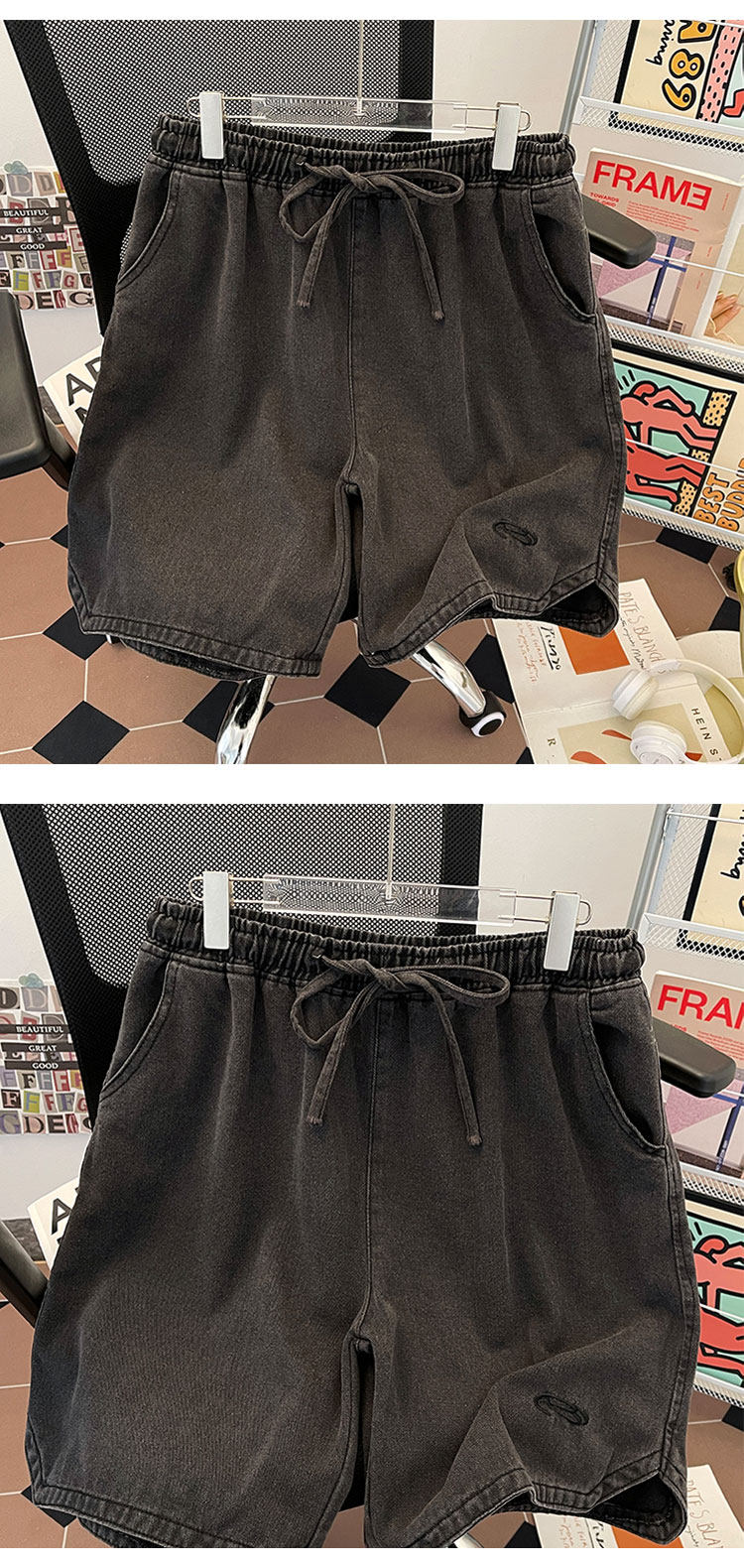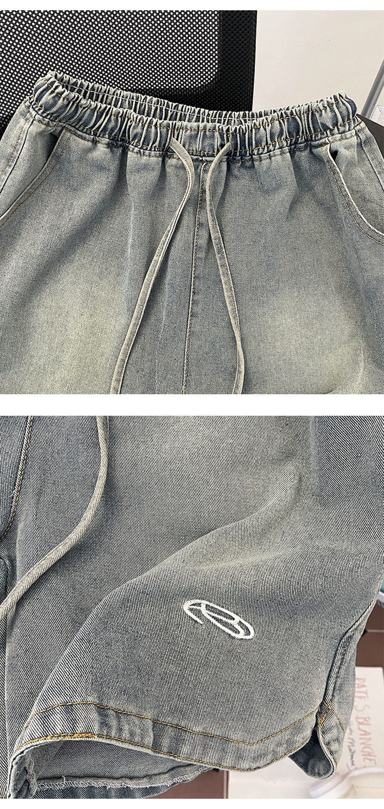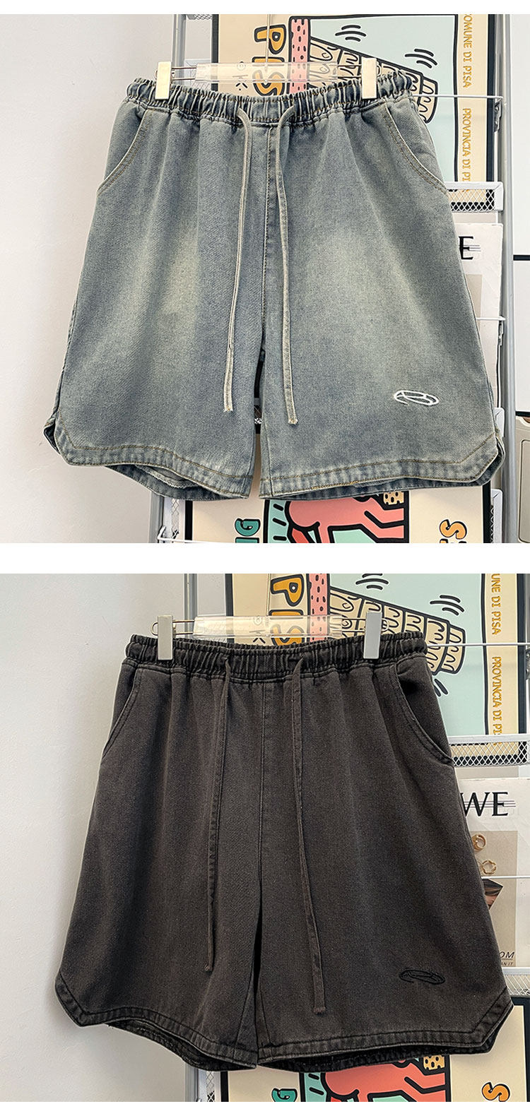 夏季水洗做舊牛仔短褲男美式街頭復古潮牌寬鬆休閒刺綉抽繩五分褲