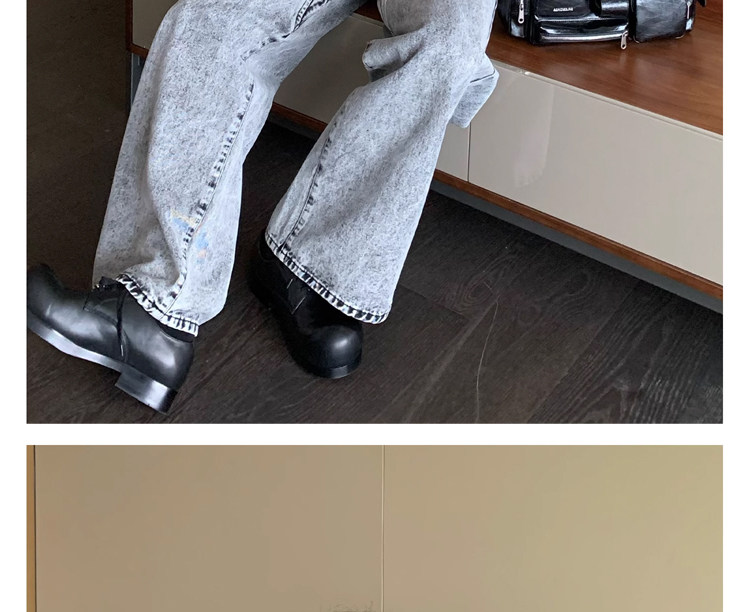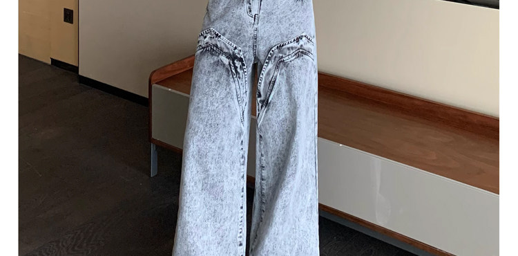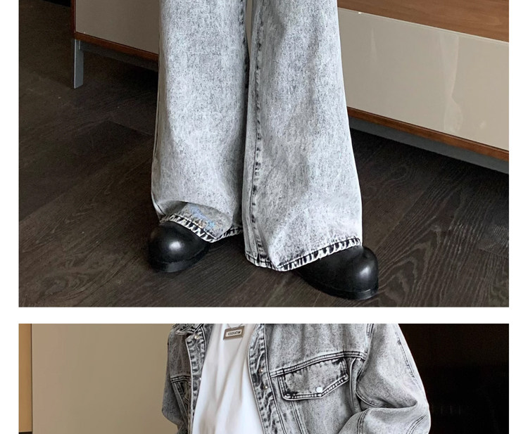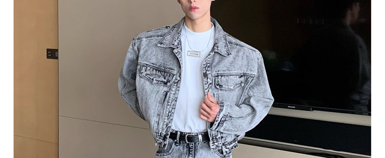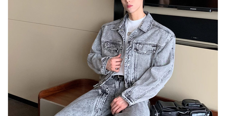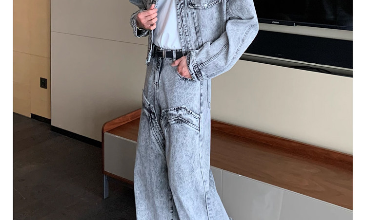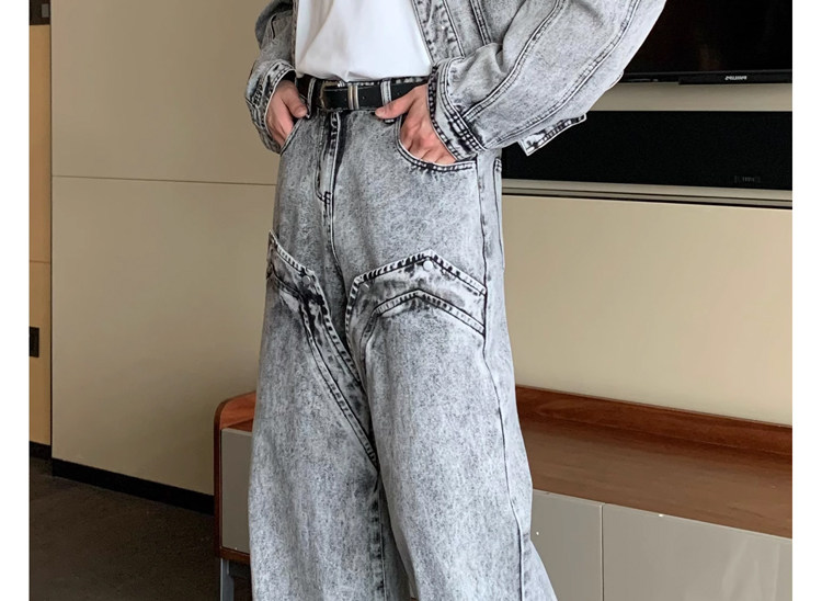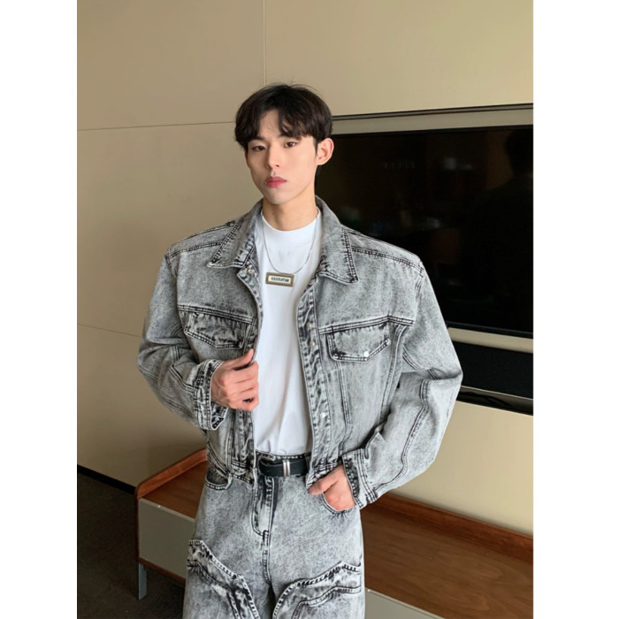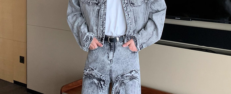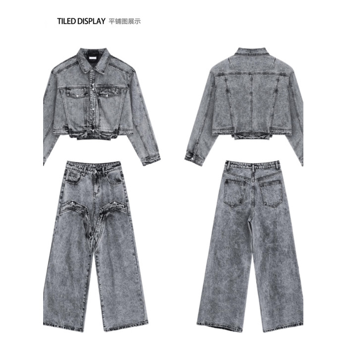 美式高街復古小衆水洗做舊短款墊肩牛仔外套拼接設計牛仔褲套裝潮