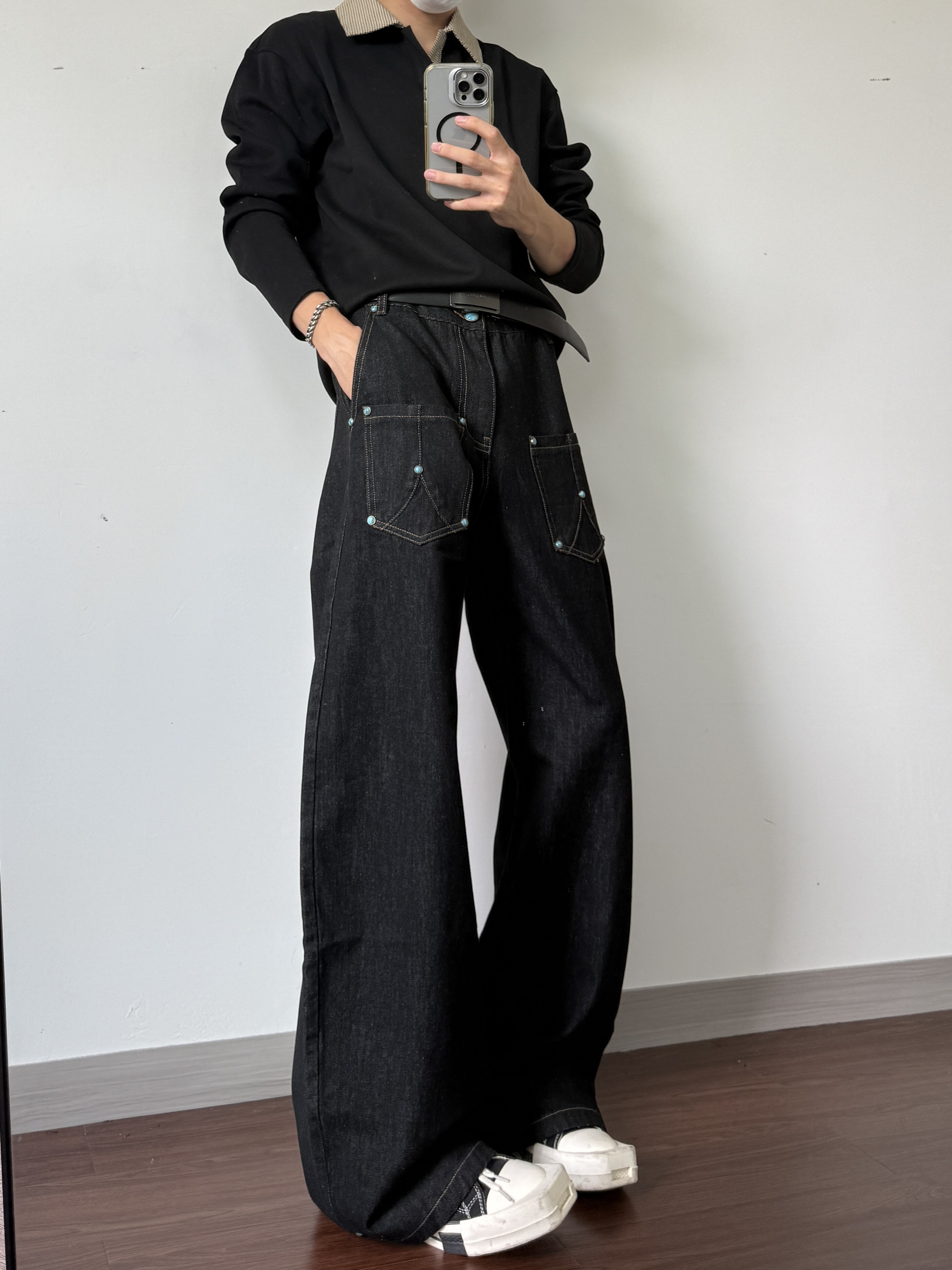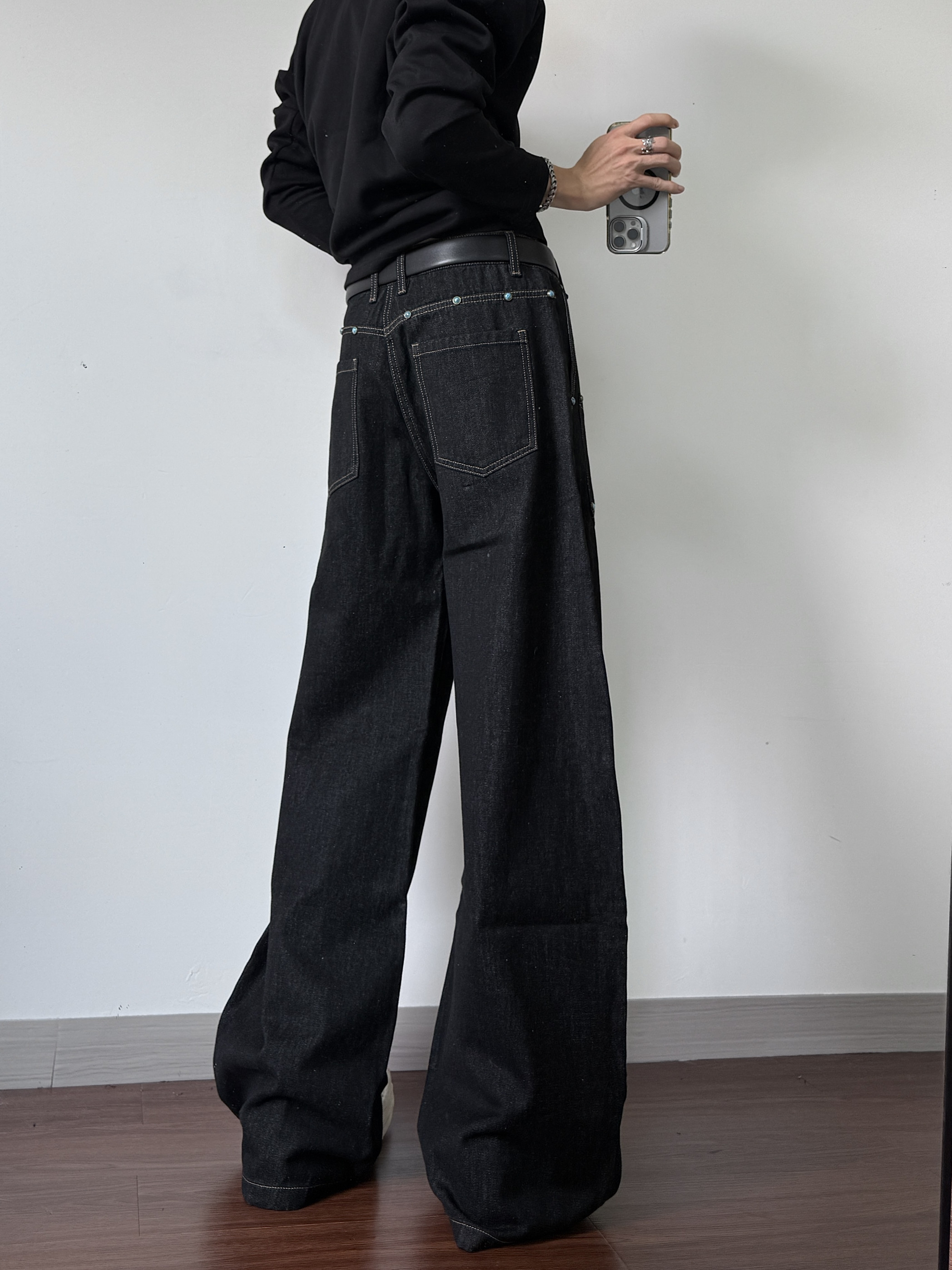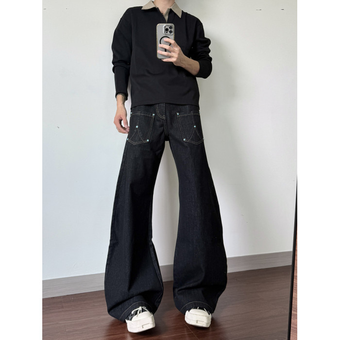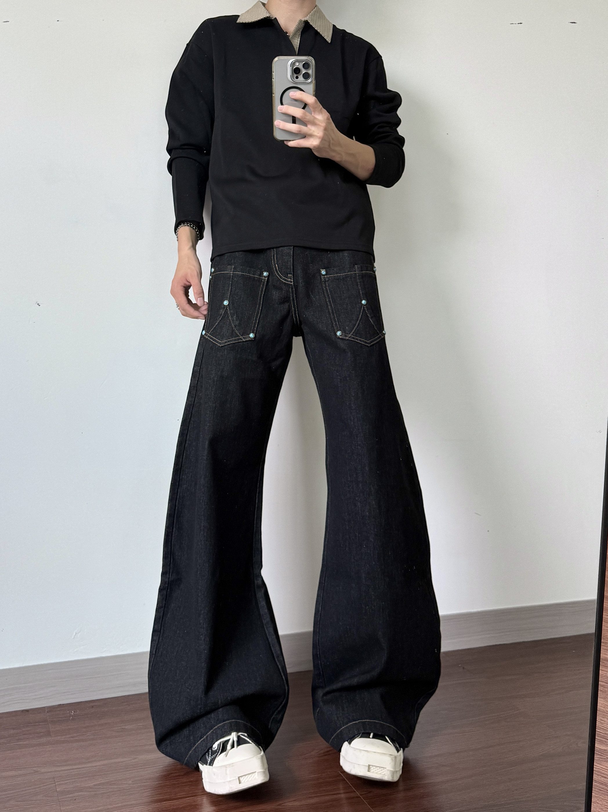 GMCS美式綠松石撞釘廓形黑色原牛彎刀褲男cleanfit直筒微喇長褲子