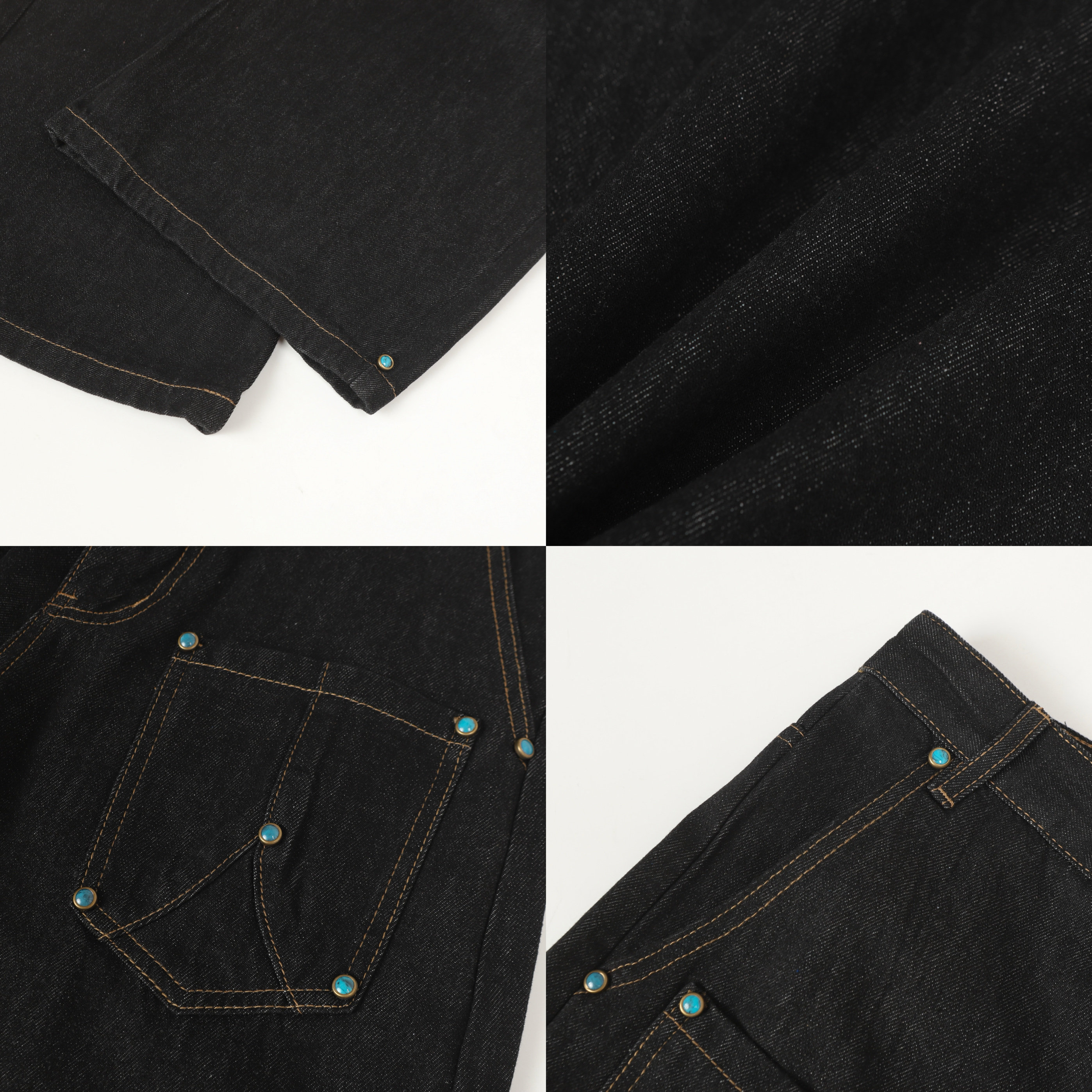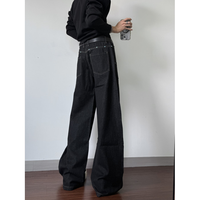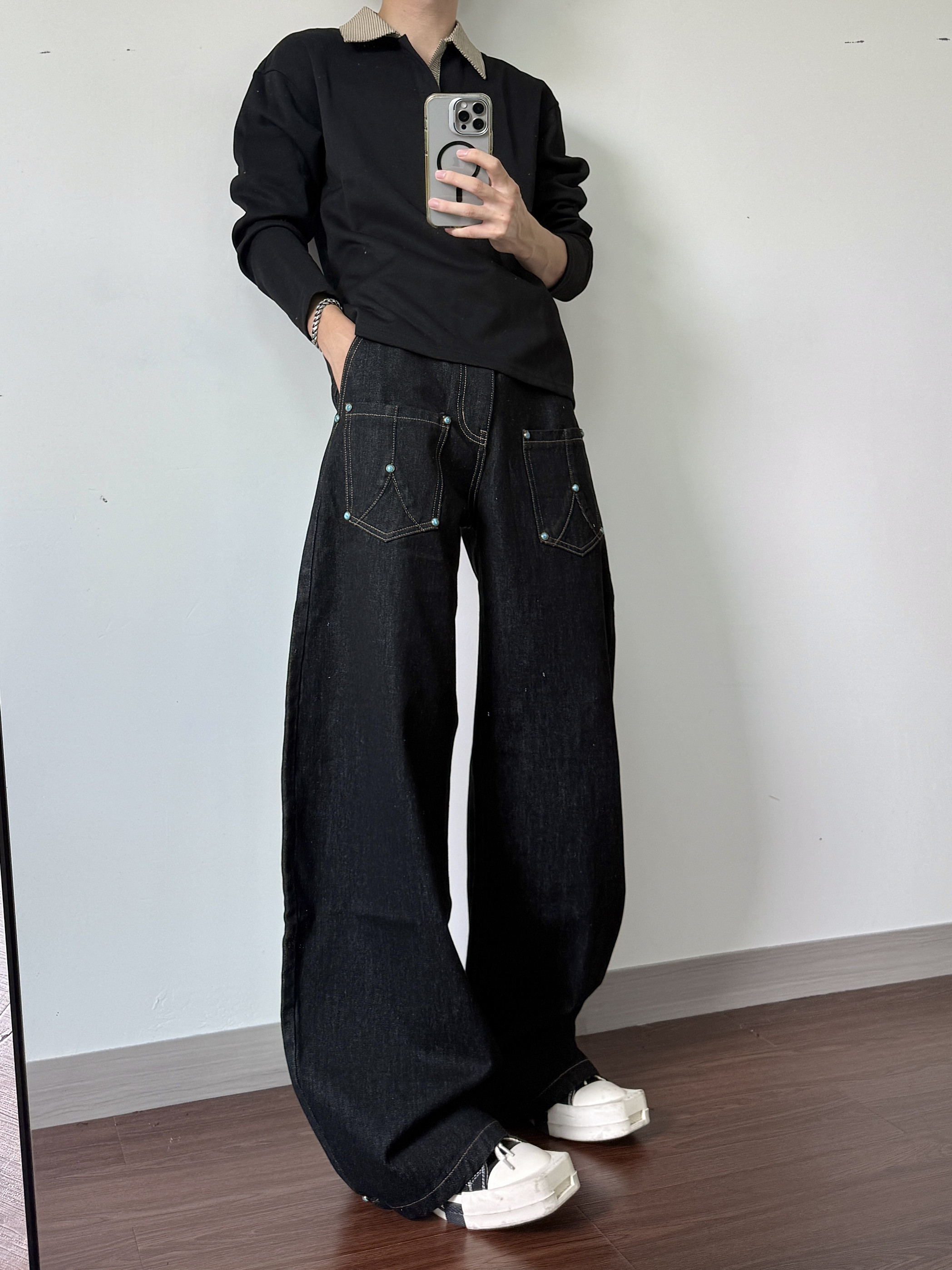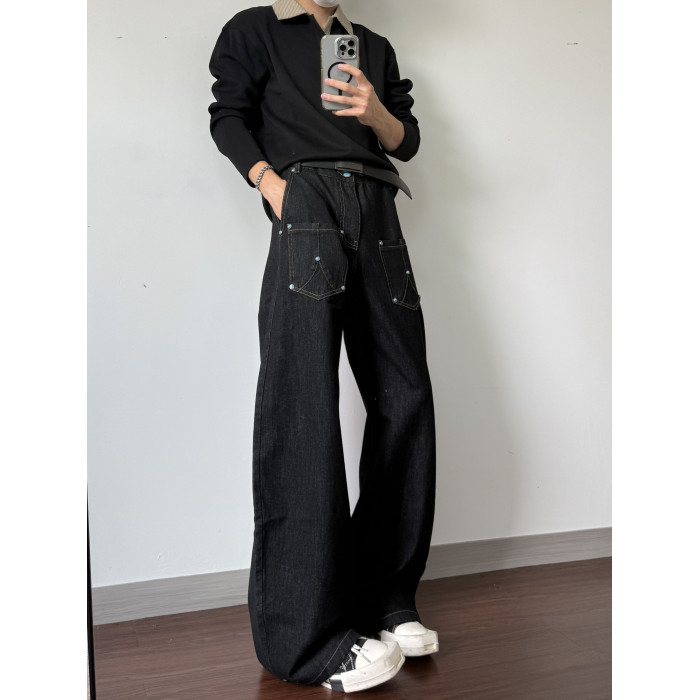 GMCS美式綠松石撞釘廓形黑色原牛彎刀褲男cleanfit直筒微喇長褲子
