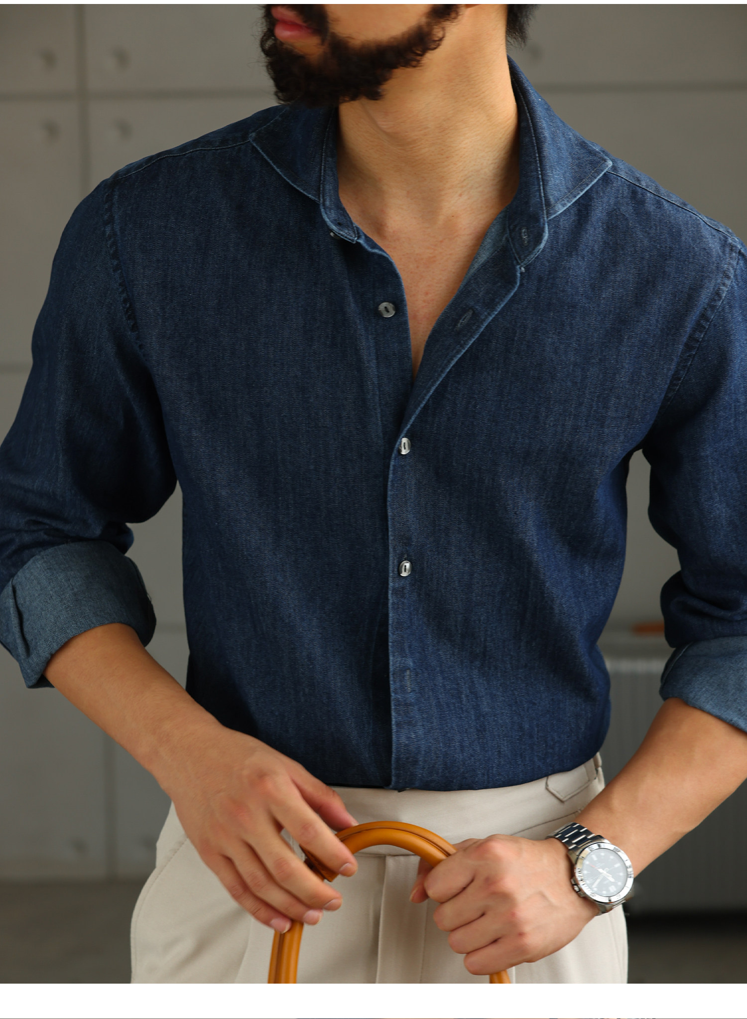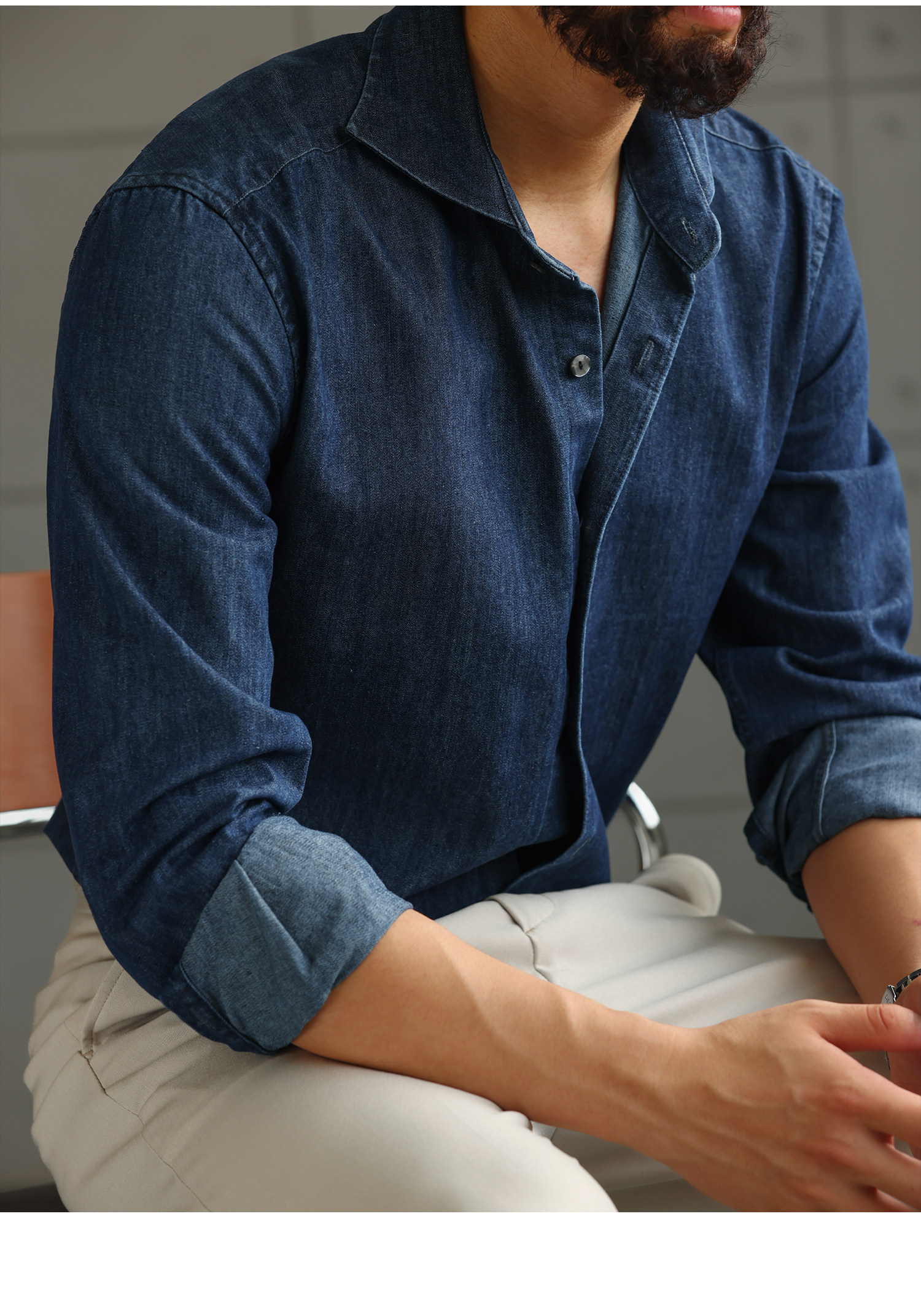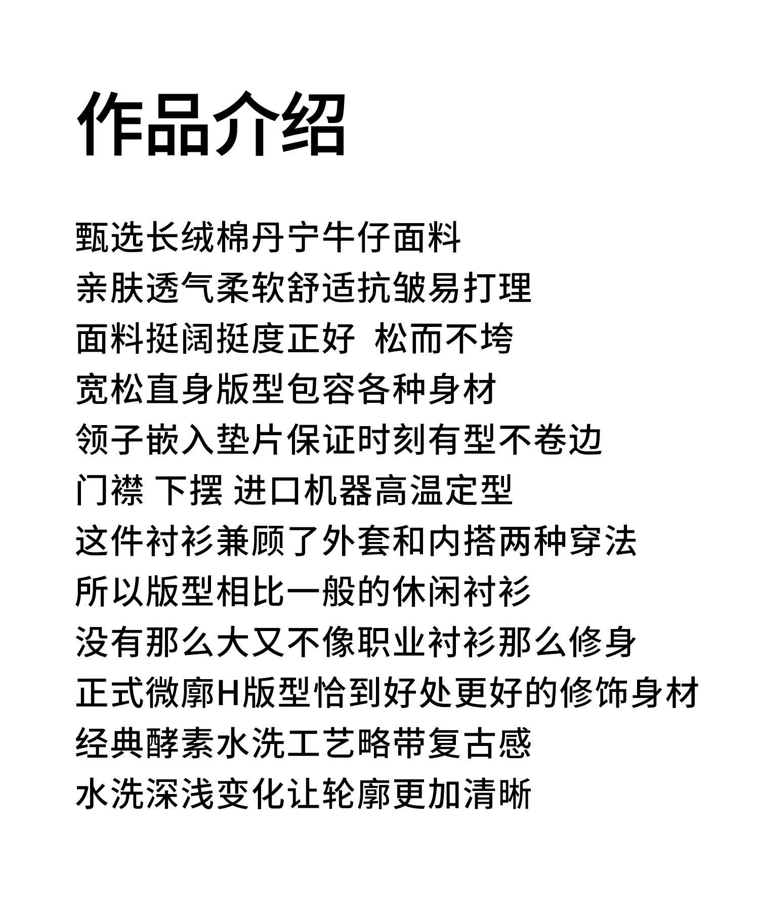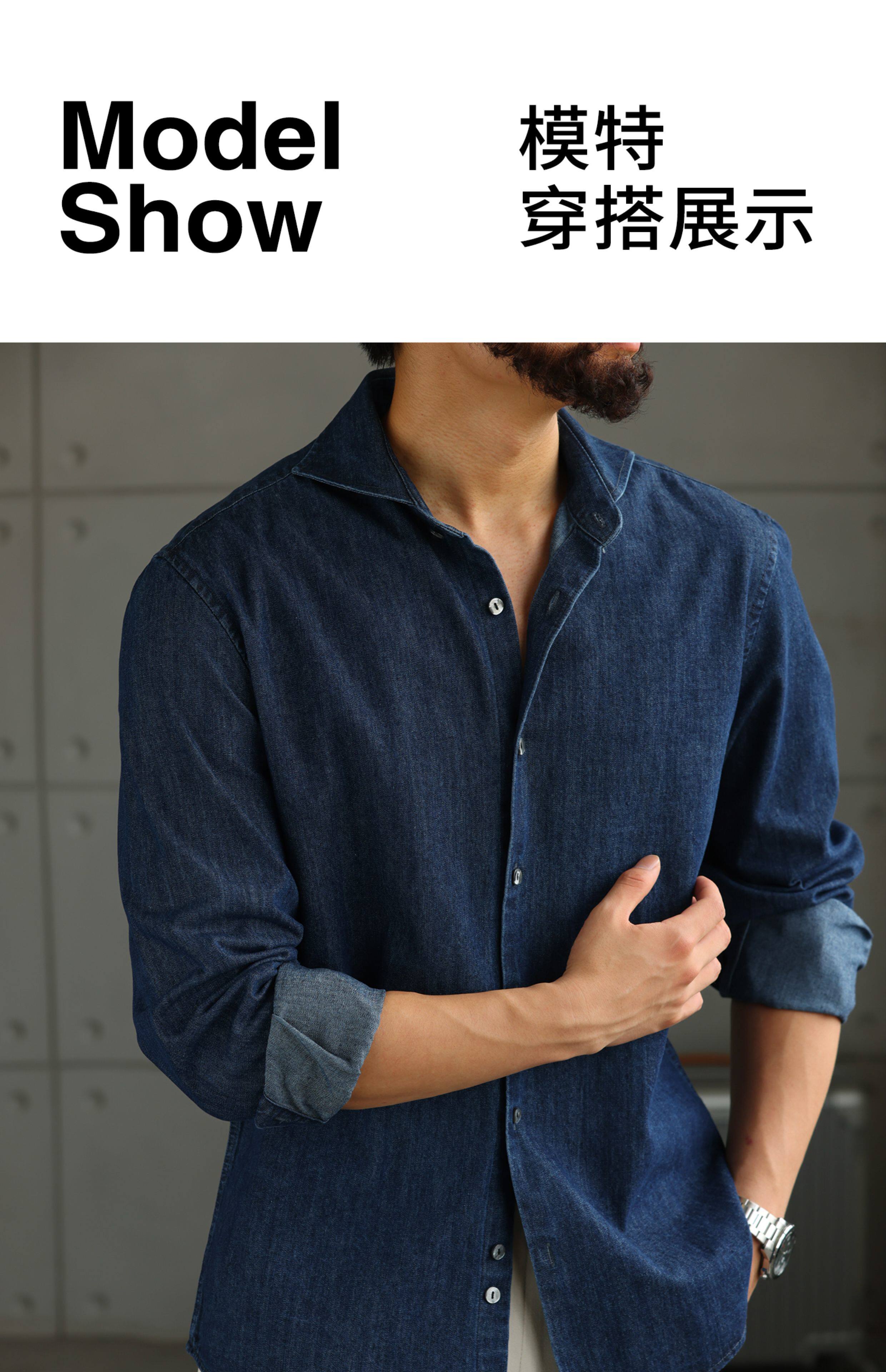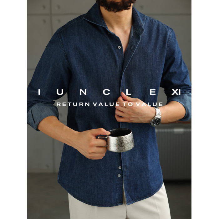 IUNCLEXI【西部皮卡】經典丹甯酵素洗牛仔襯衫男士一字領長袖襯衣