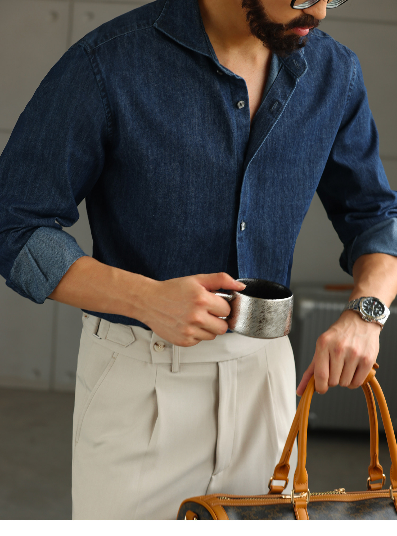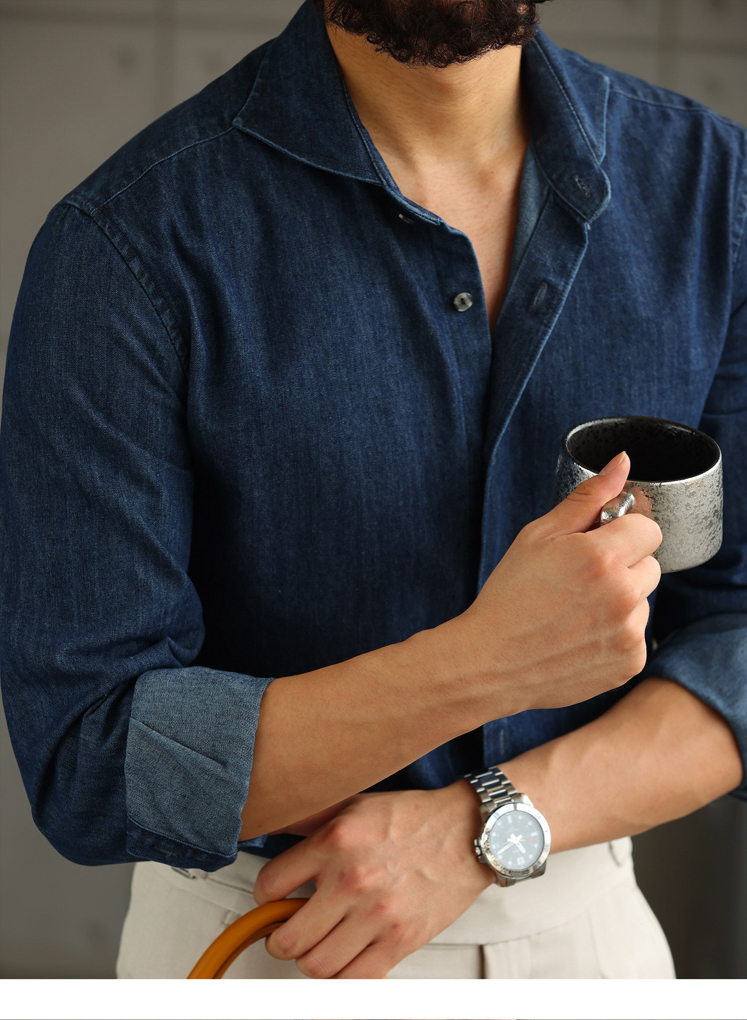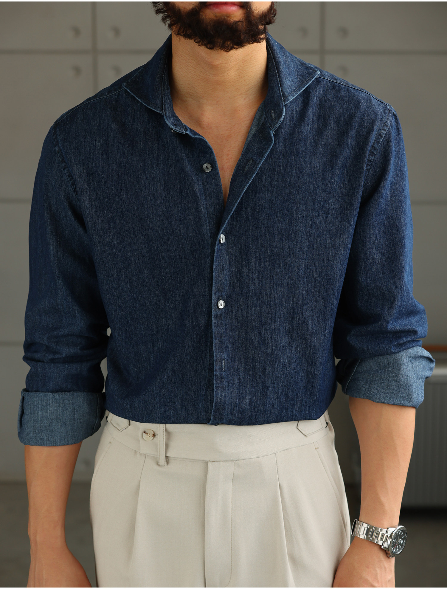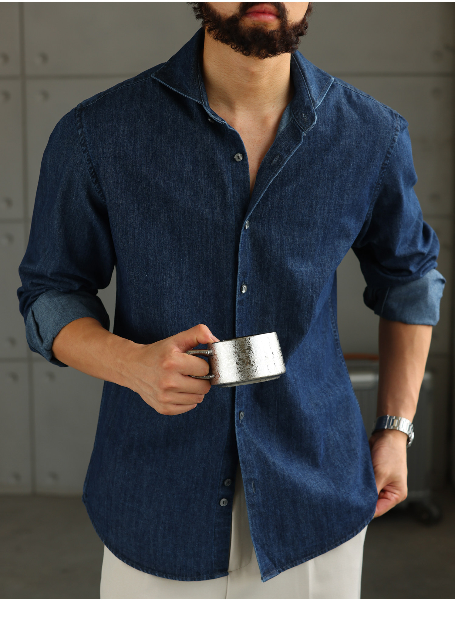 IUNCLEXI【西部皮卡】經典丹甯酵素洗牛仔襯衫男士一字領長袖襯衣