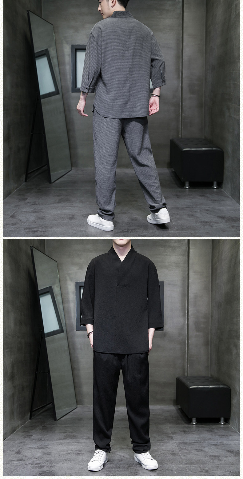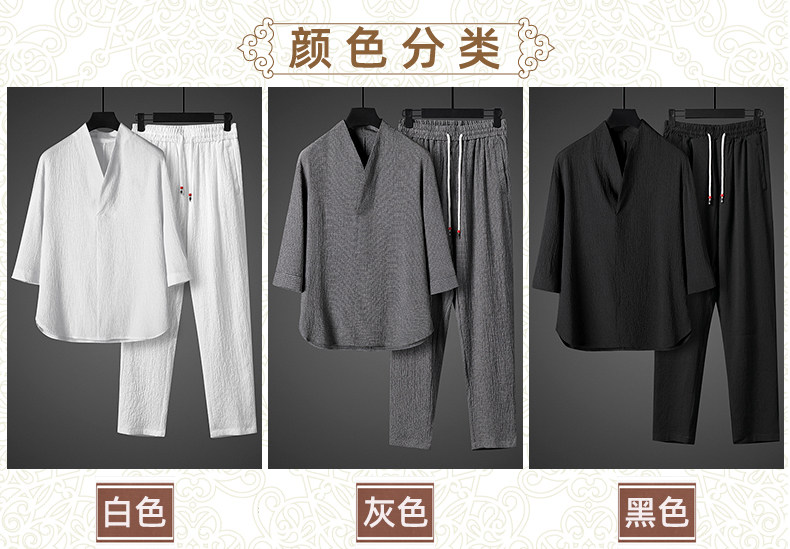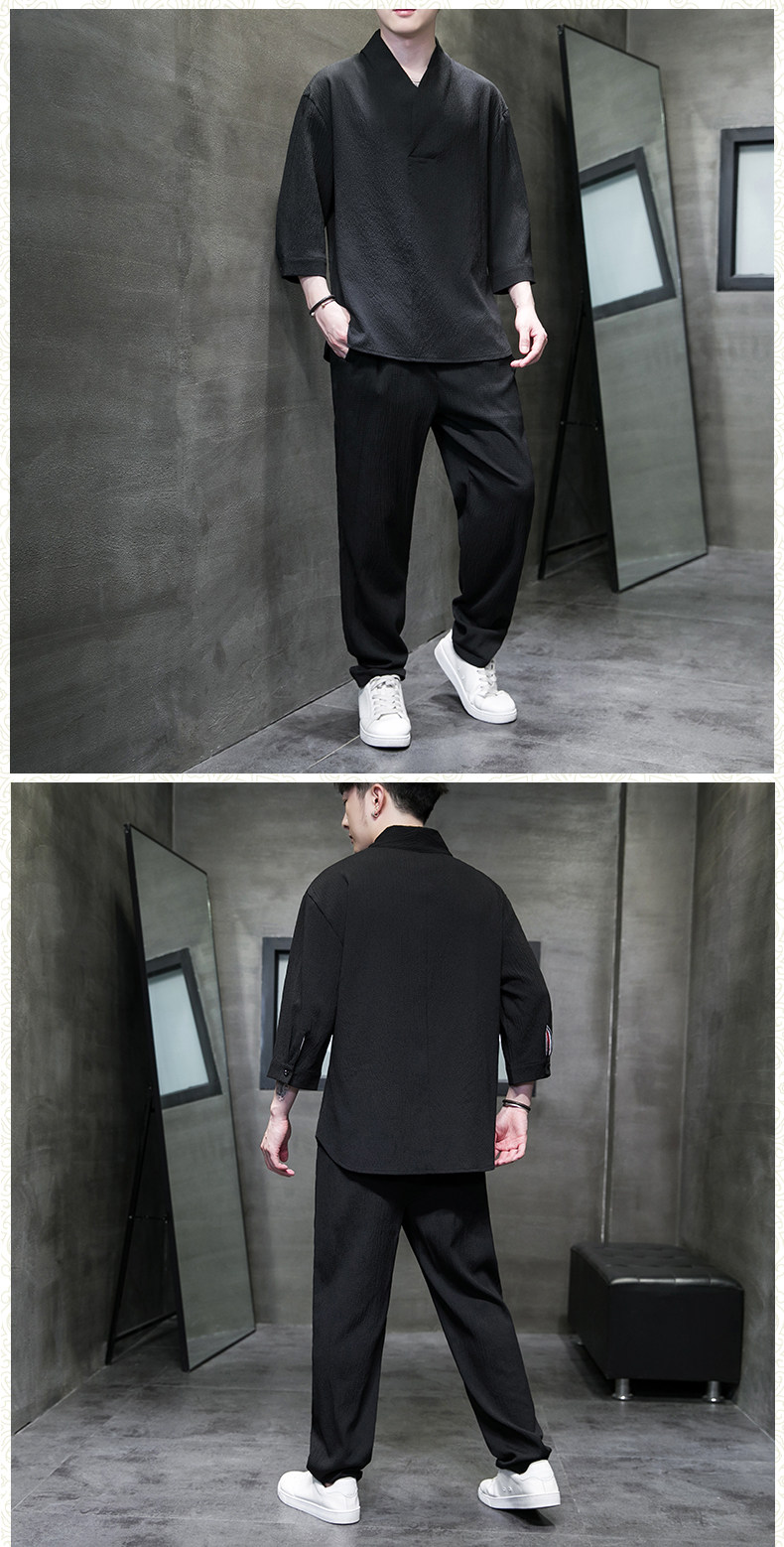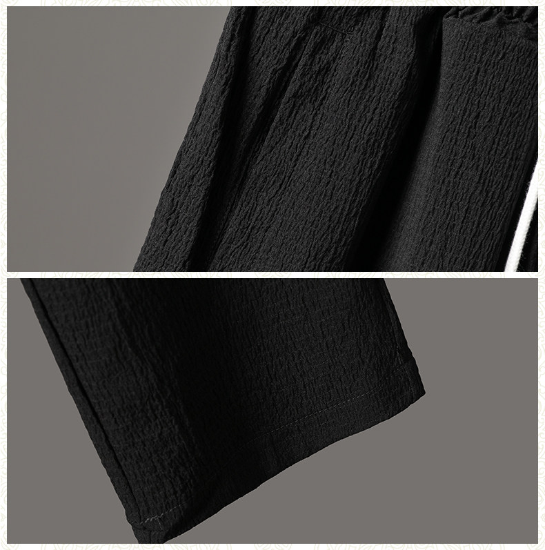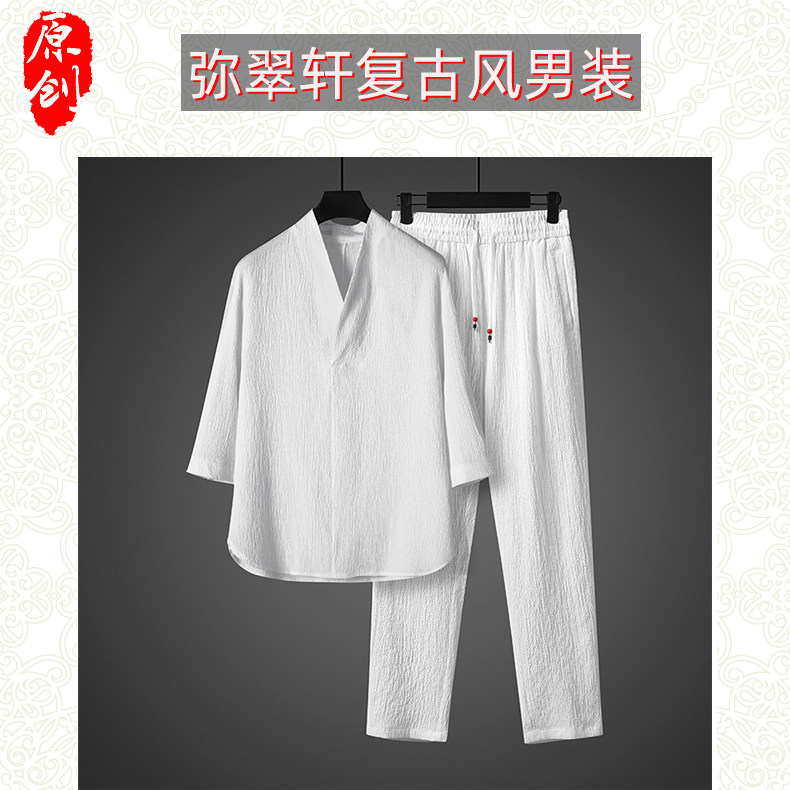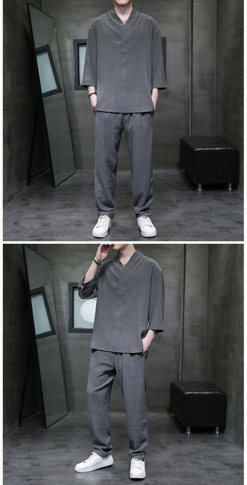 中式夏季男復古T恤寬鬆大碼褶皺上衣薄款透氣休閒兩件套百搭長褲