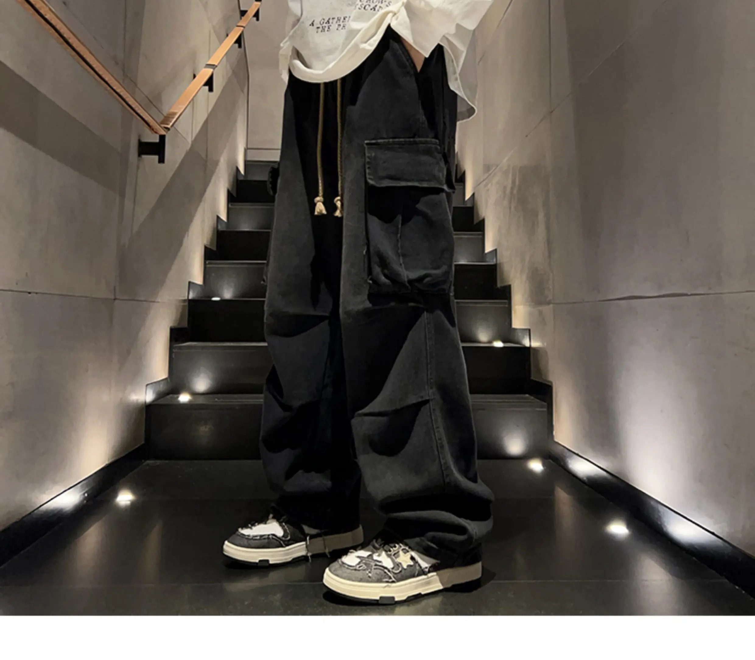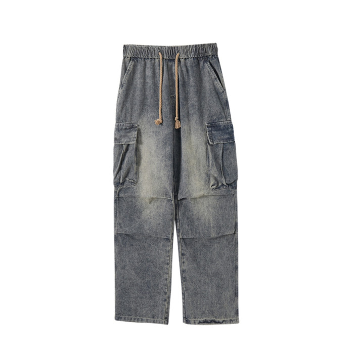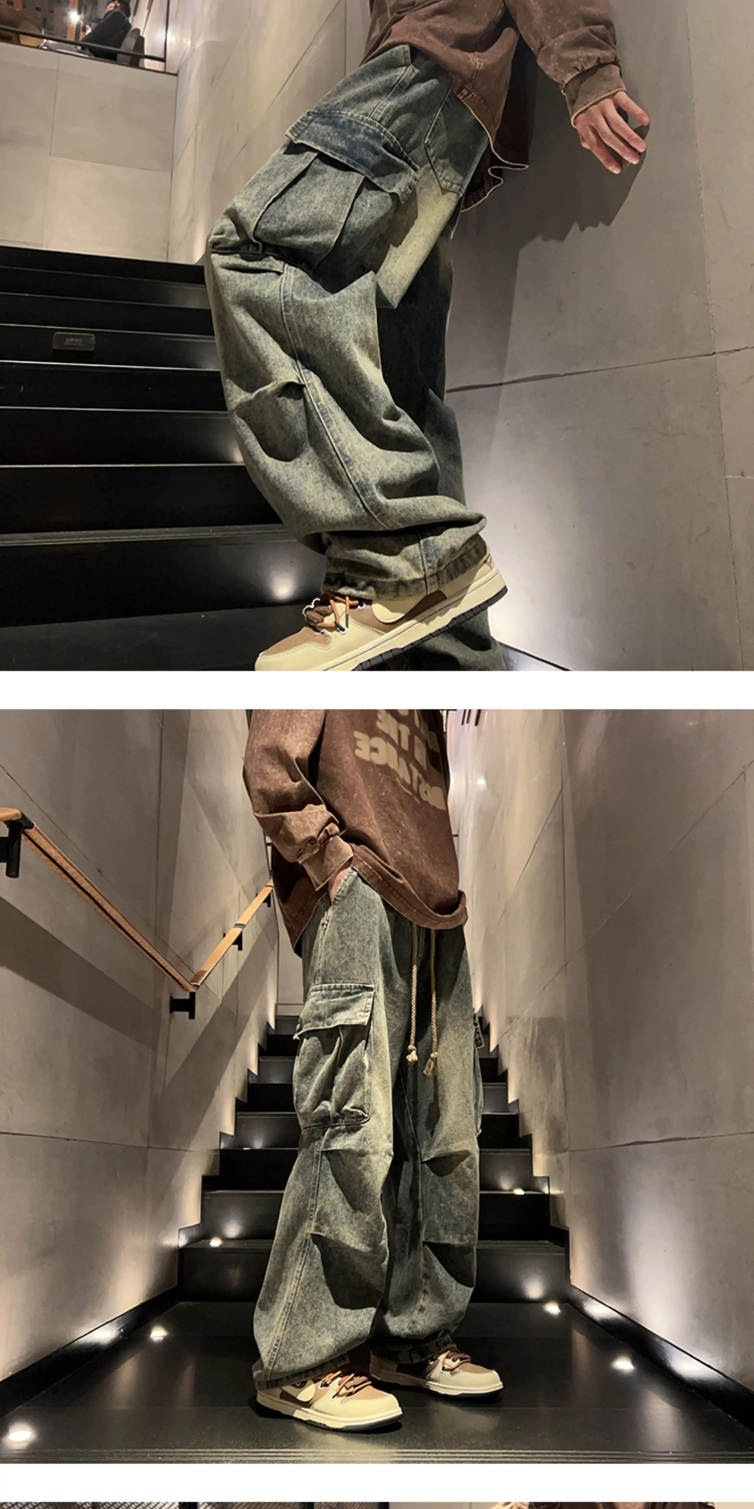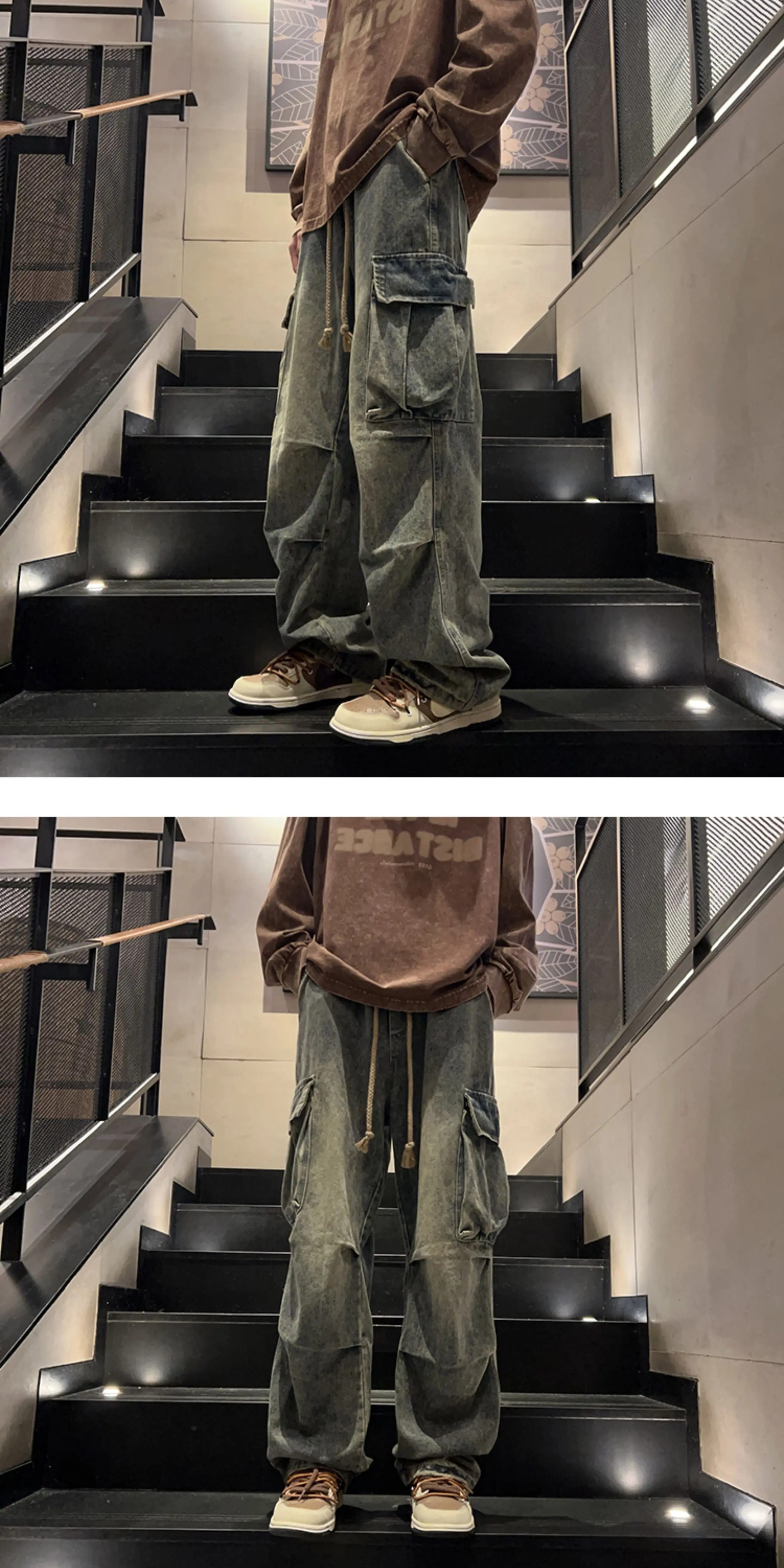 麻花抽繩牛仔褲男秋冬美式水洗濶腿褲工裝褲直筒寬鬆休閒高街褲子