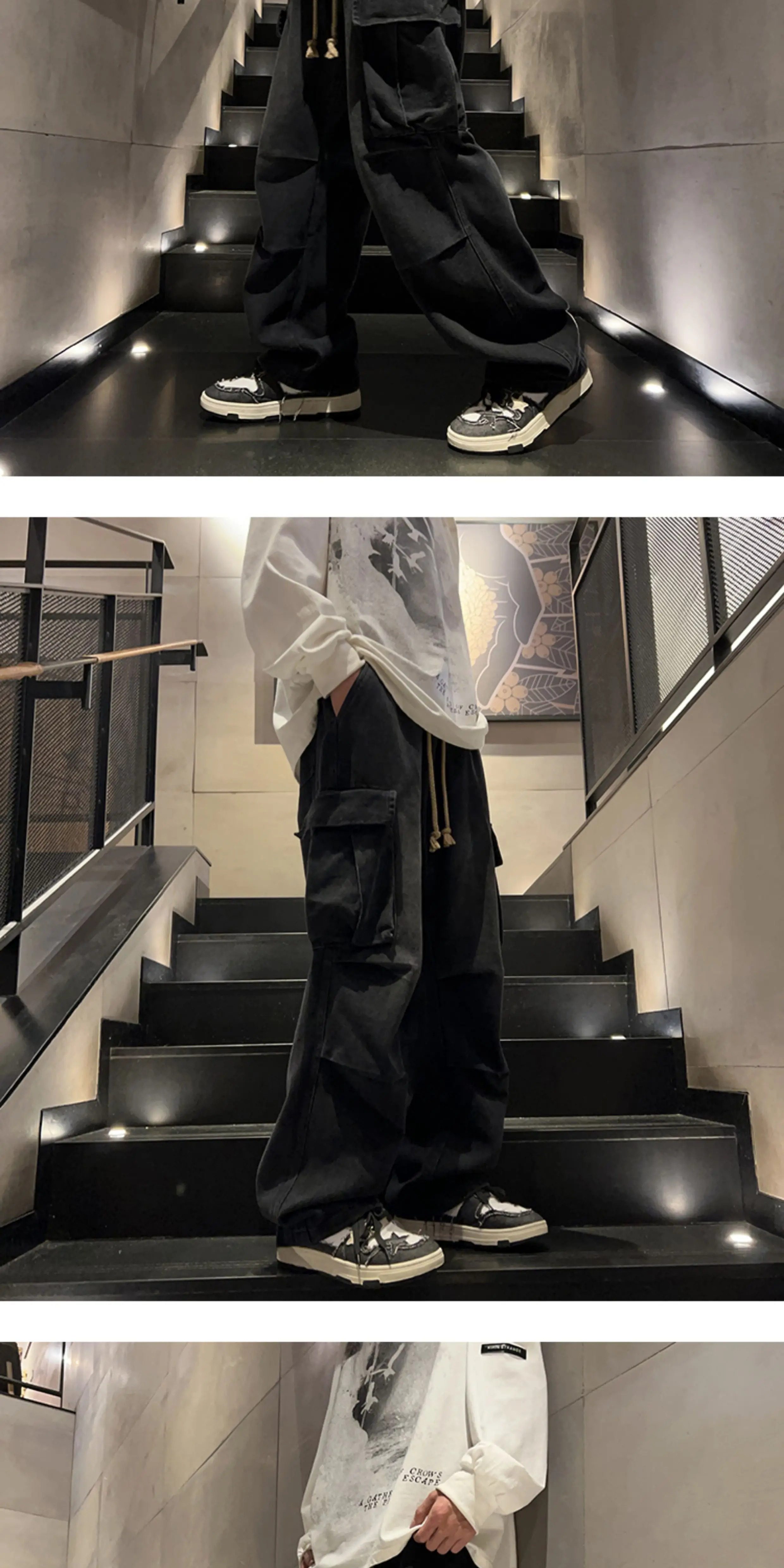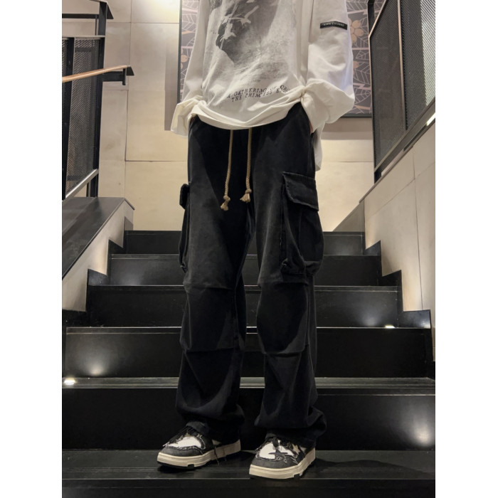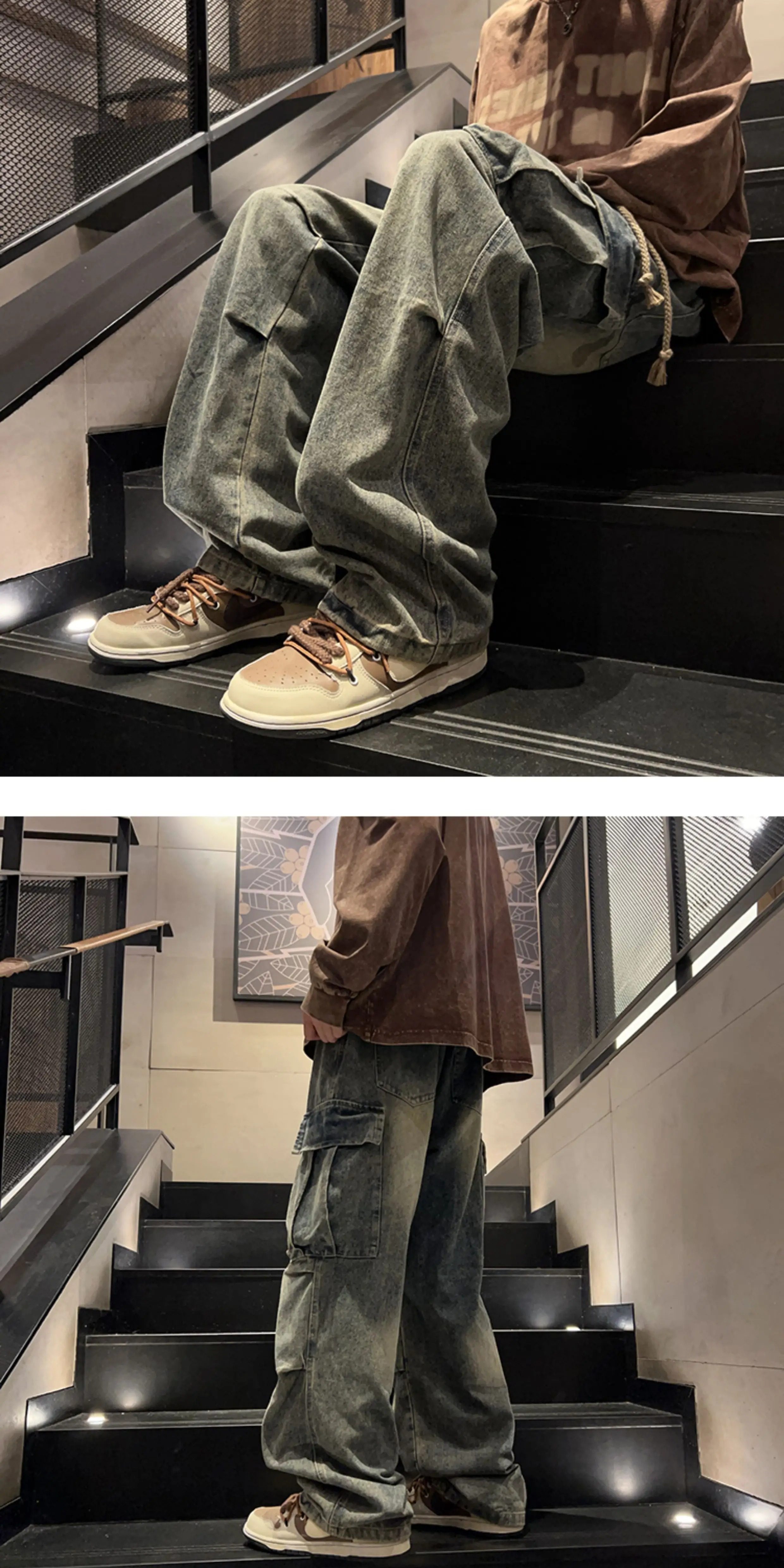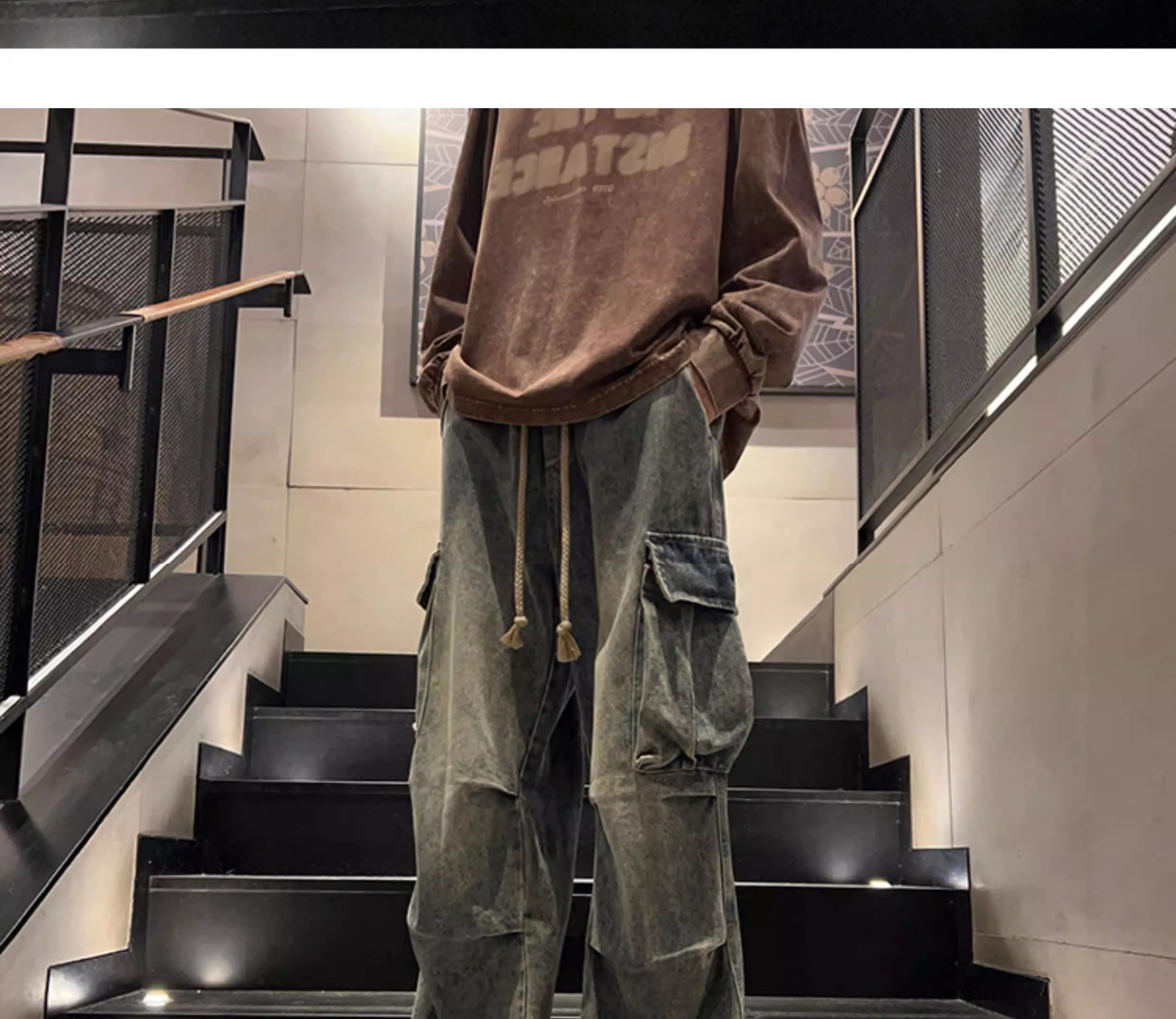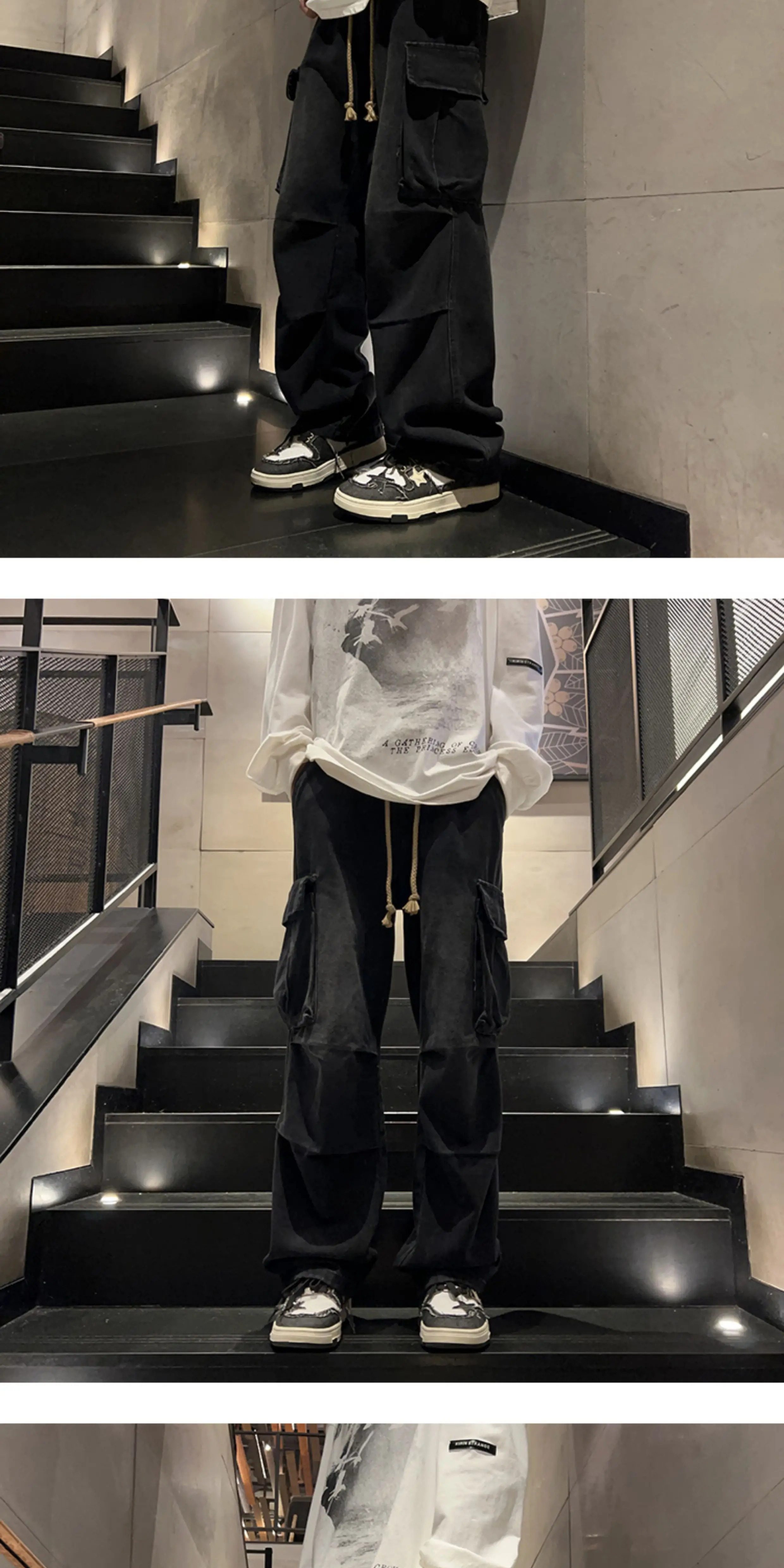 麻花抽繩牛仔褲男秋冬美式水洗濶腿褲工裝褲直筒寬鬆休閒高街褲子