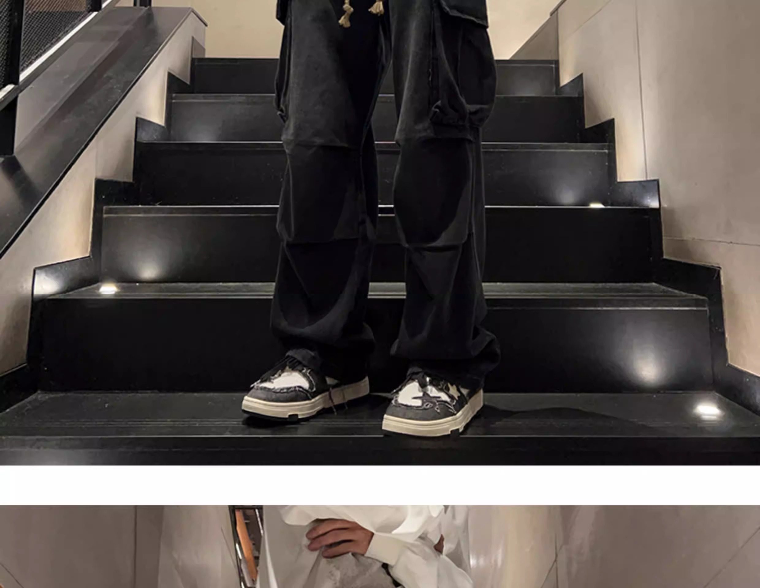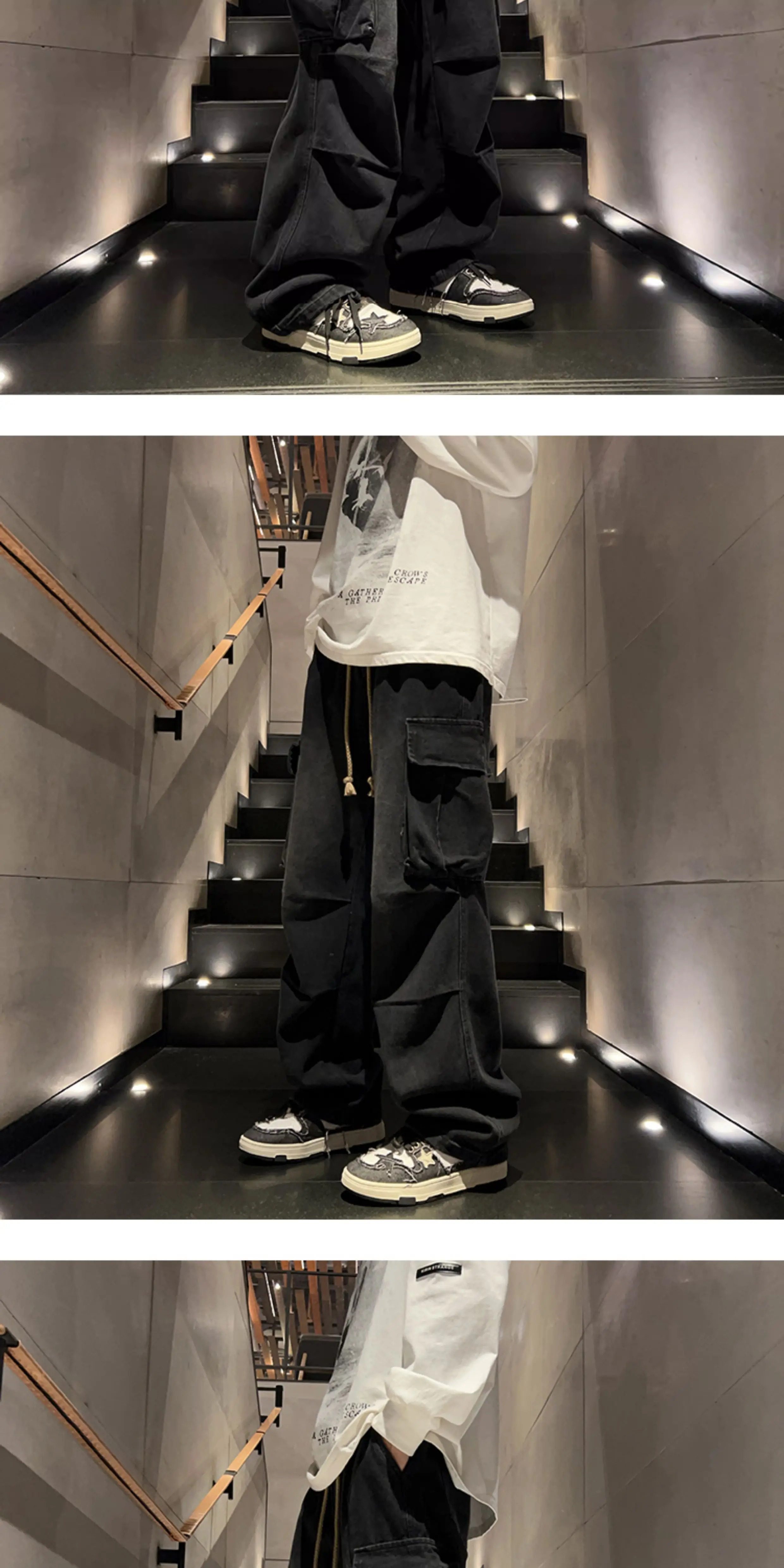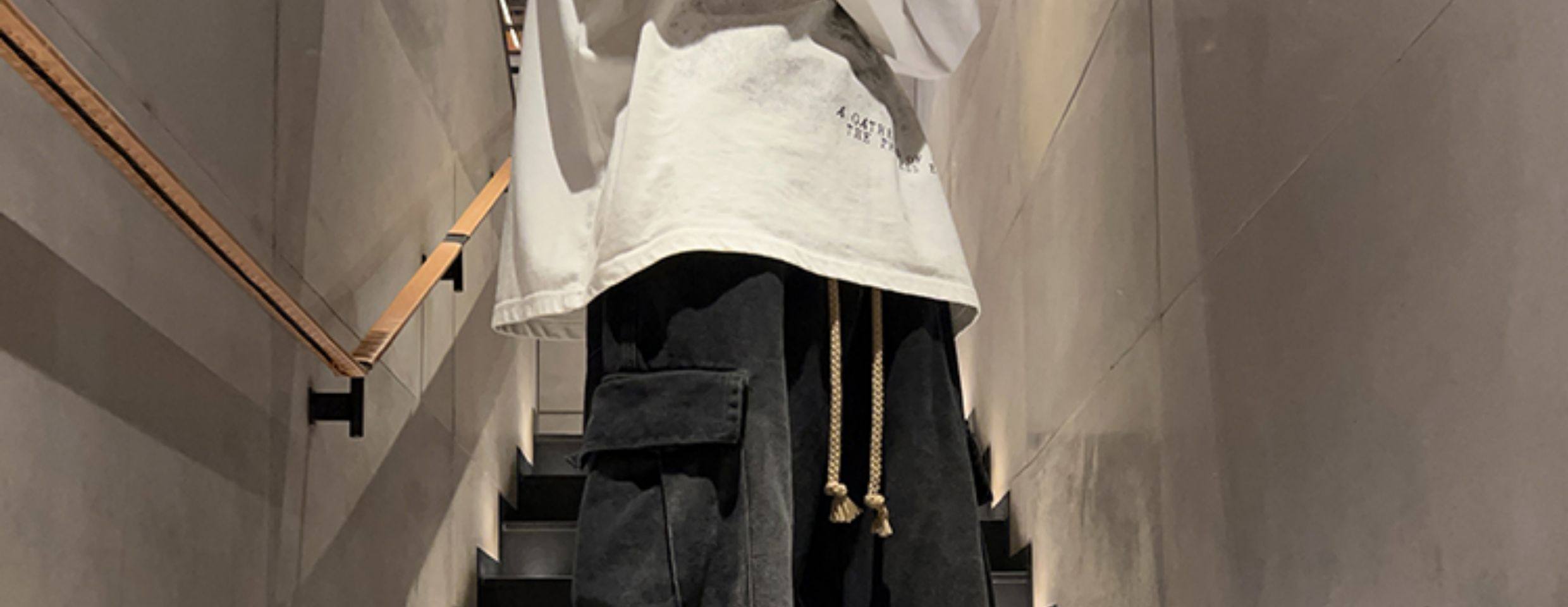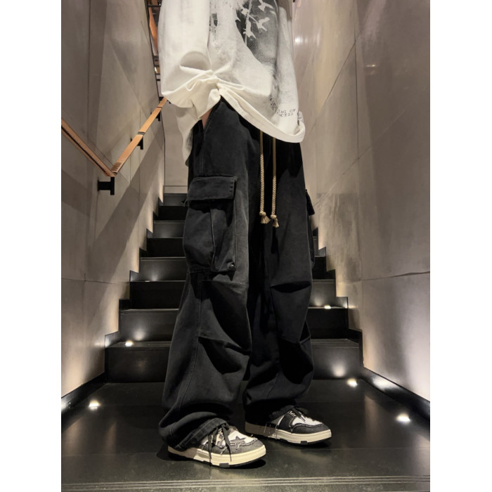麻花抽繩牛仔褲男秋冬美式水洗濶腿褲工裝褲直筒寬鬆休閒高街褲子