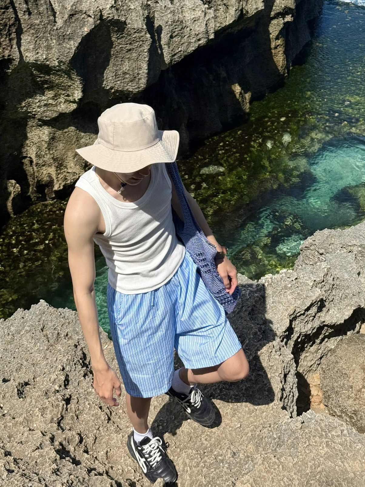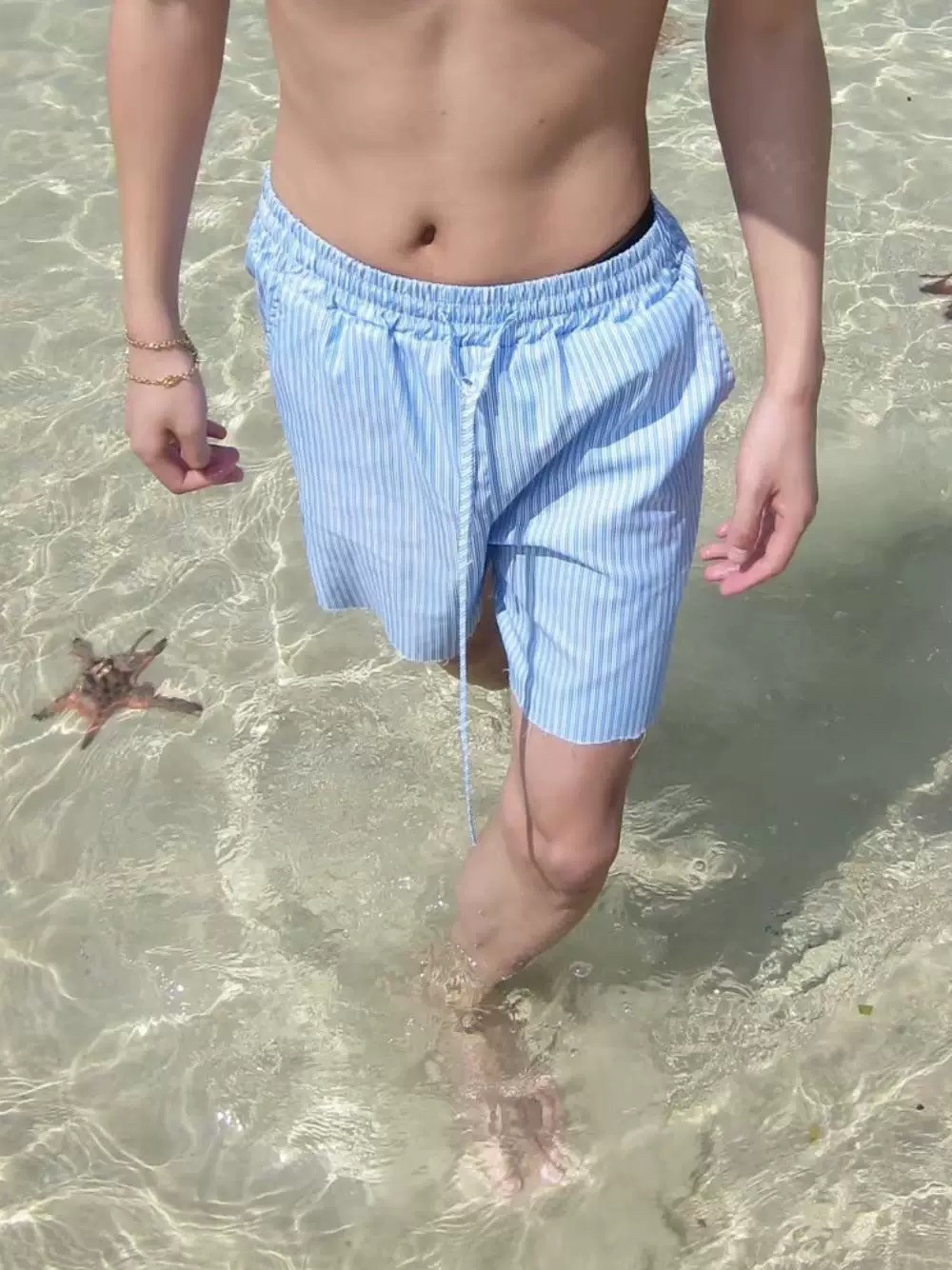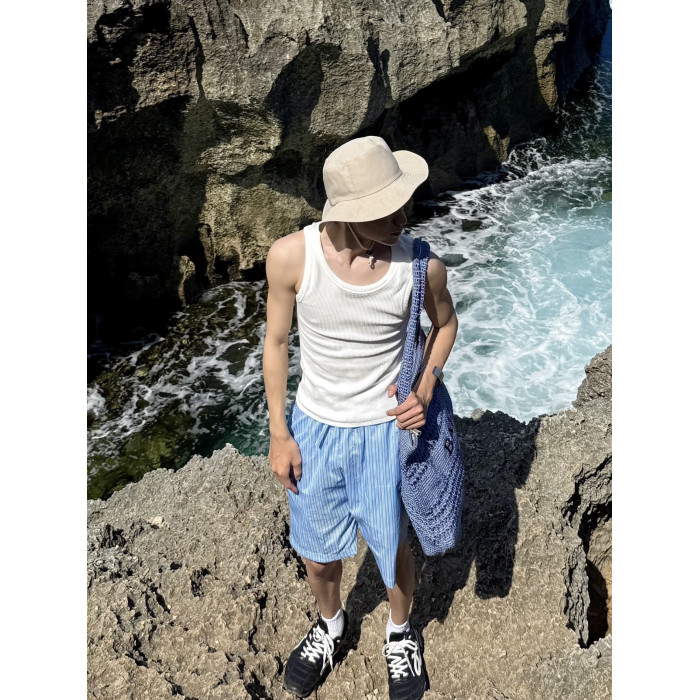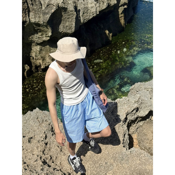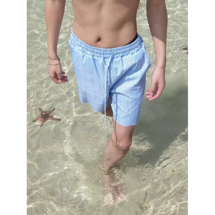 夏季清新藍色條紋抽繩短褲男寬鬆休閒沙灘濶腿度假百搭五分褲情侶