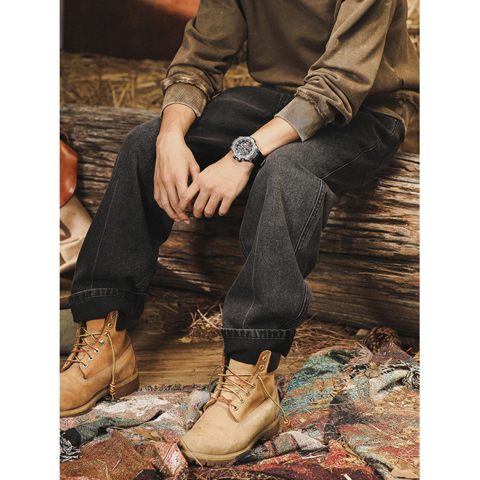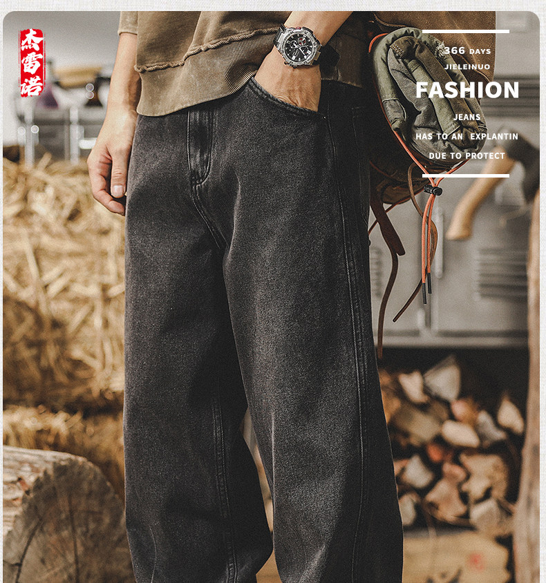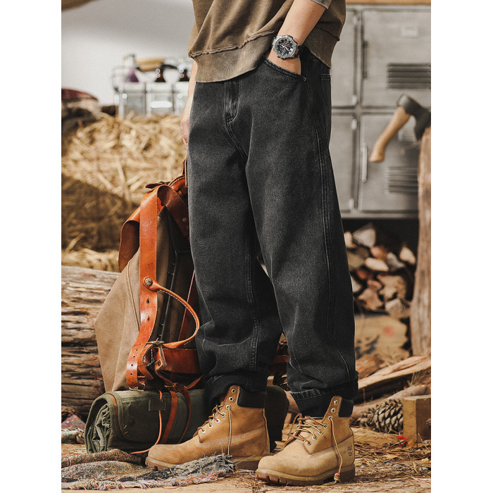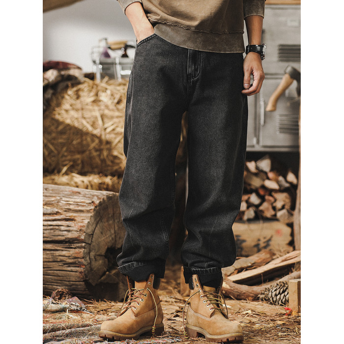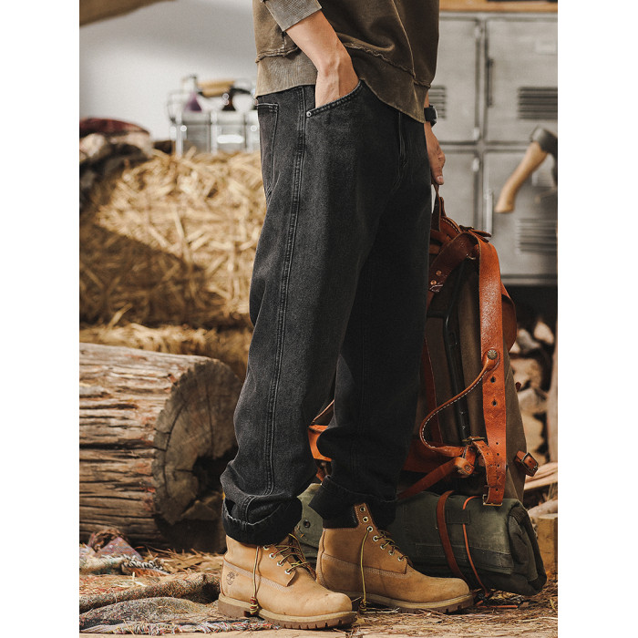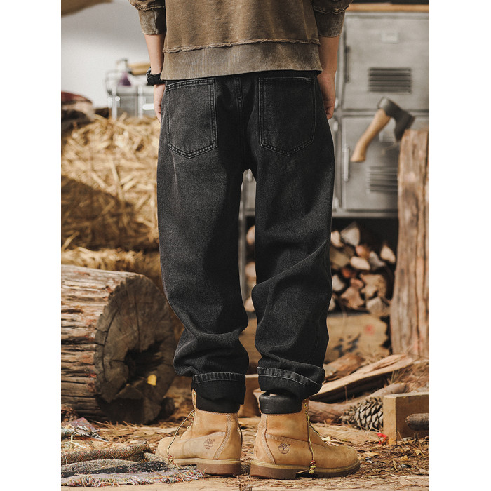 美式復古加絨黑色牛仔褲男直筒2025新款寬鬆大碼潮牌休閒男士褲子