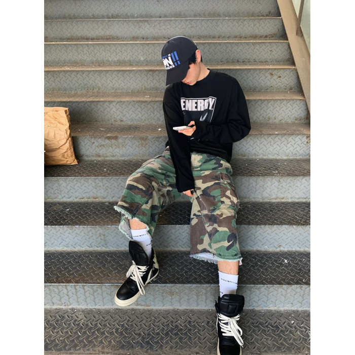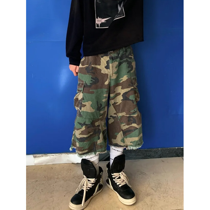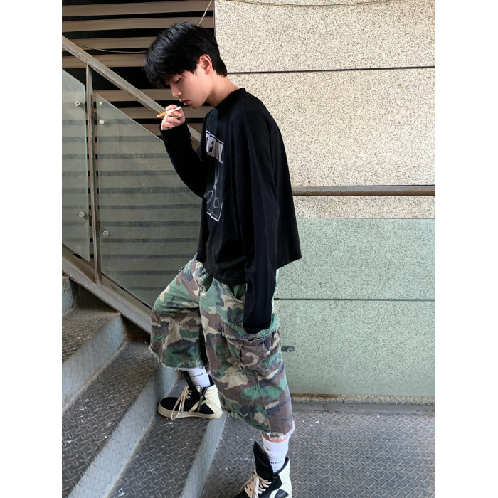 vintage街頭迷彩風格牛仔短褲男款夏季美式復古寬鬆濶腿七分褲子