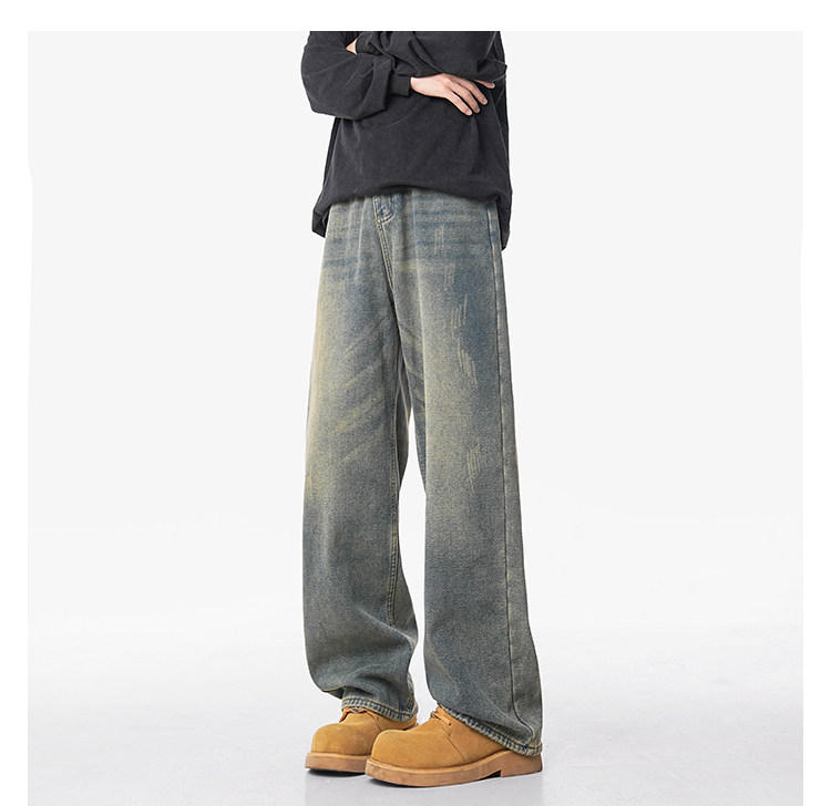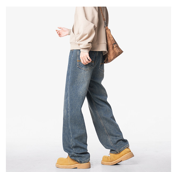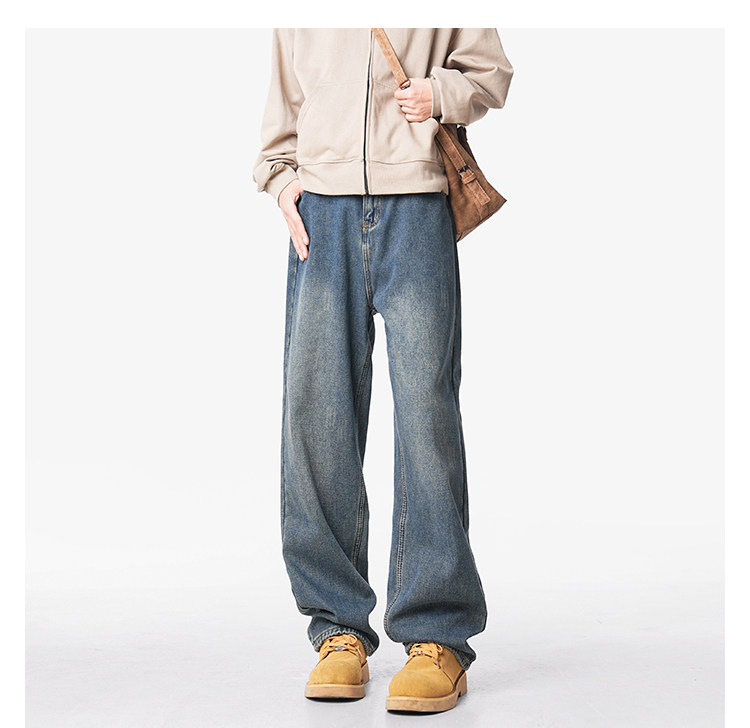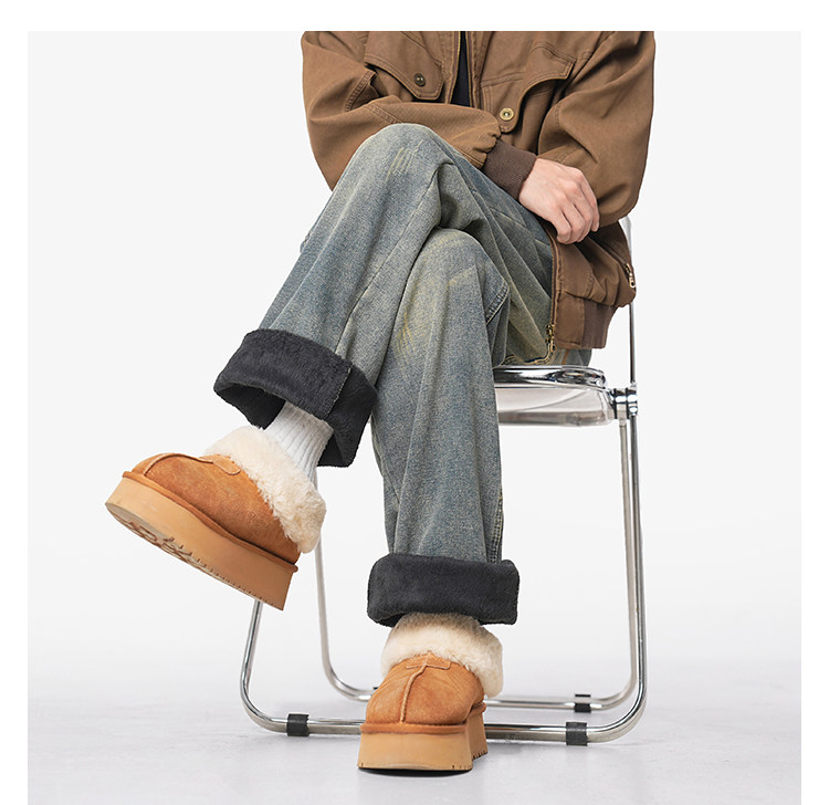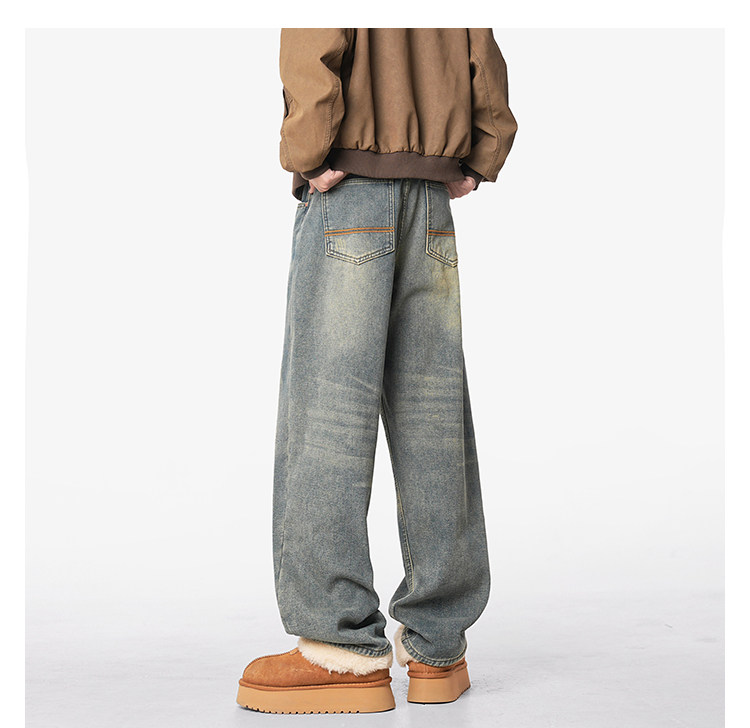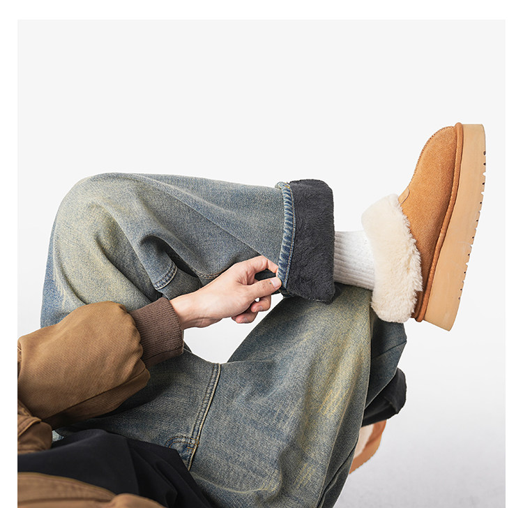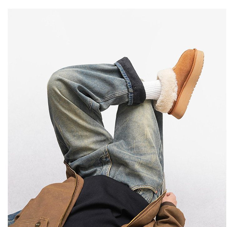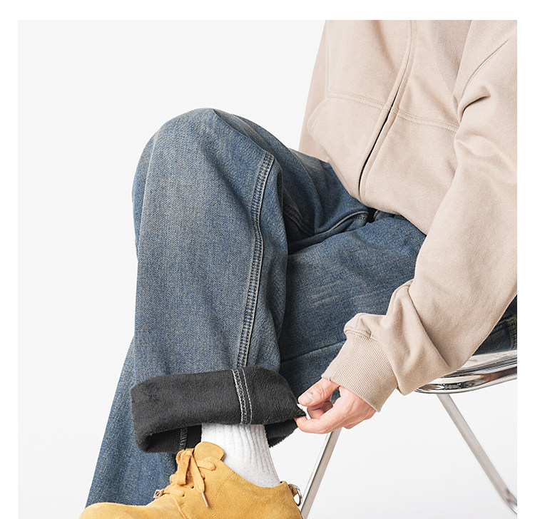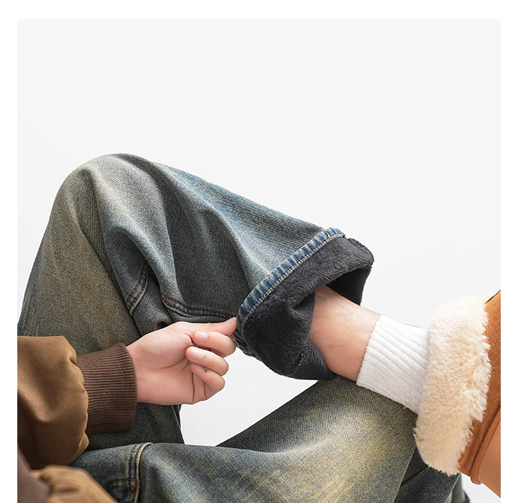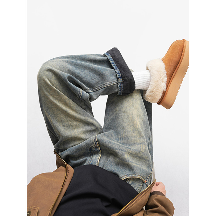 美式復古做舊加絨牛仔褲男女冬季潮水洗加厚直筒褲寬鬆保暖休閒褲