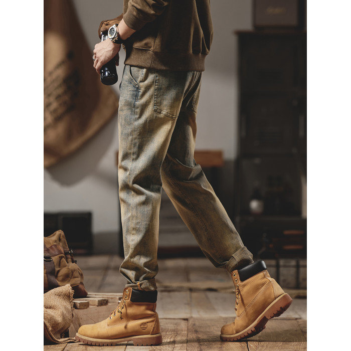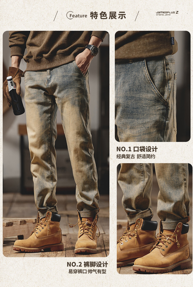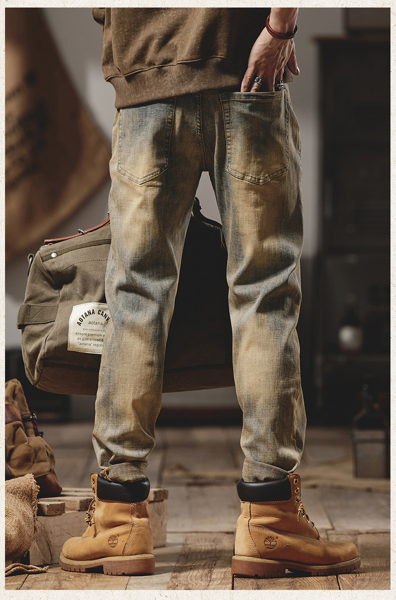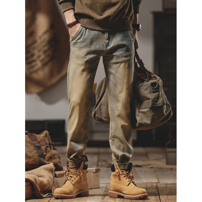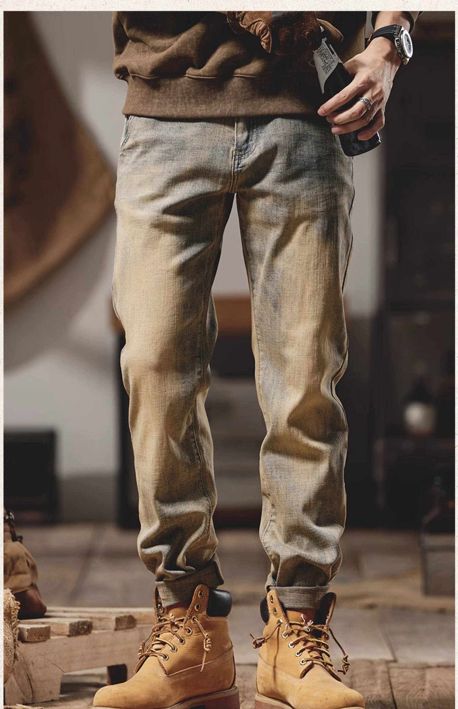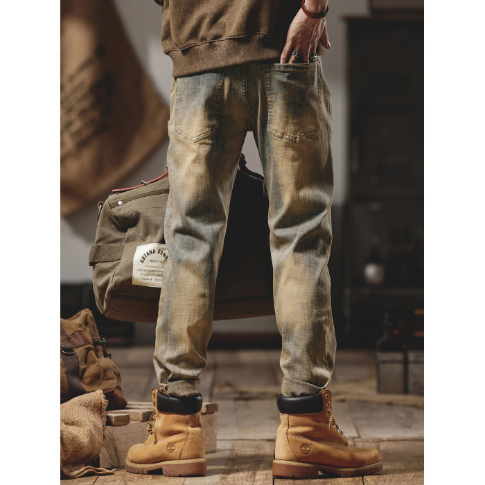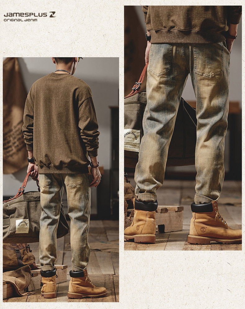 美式復古黃泥染牛仔褲男士秋冬2025新款彈力直筒加絨加厚休閒褲子