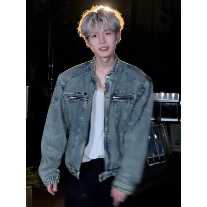 美式復古短款牛仔外套男高級感痞帥春秋cleanfit立領拉鍊墊肩夾克