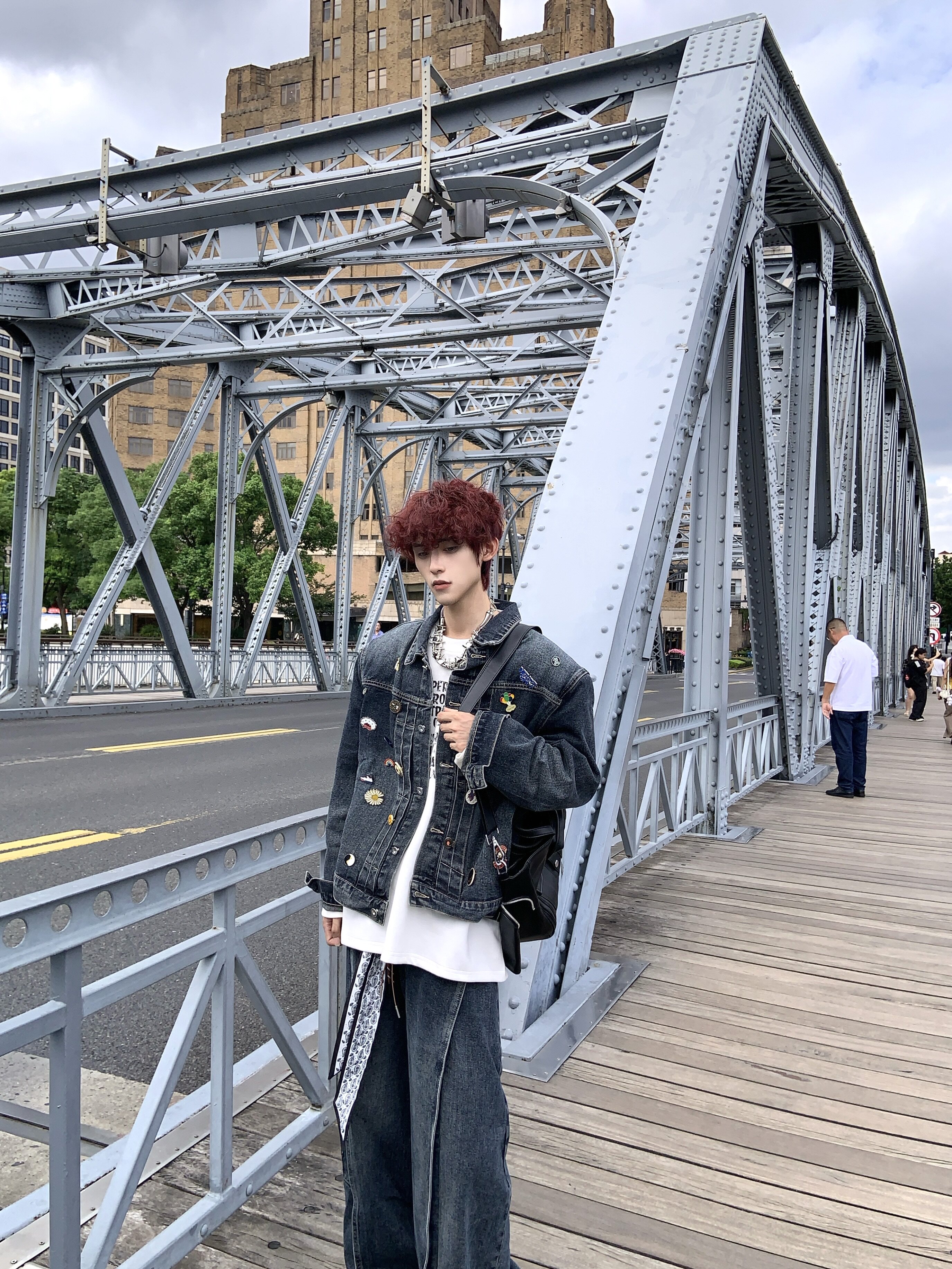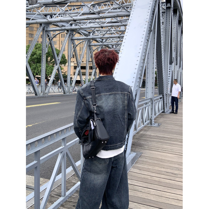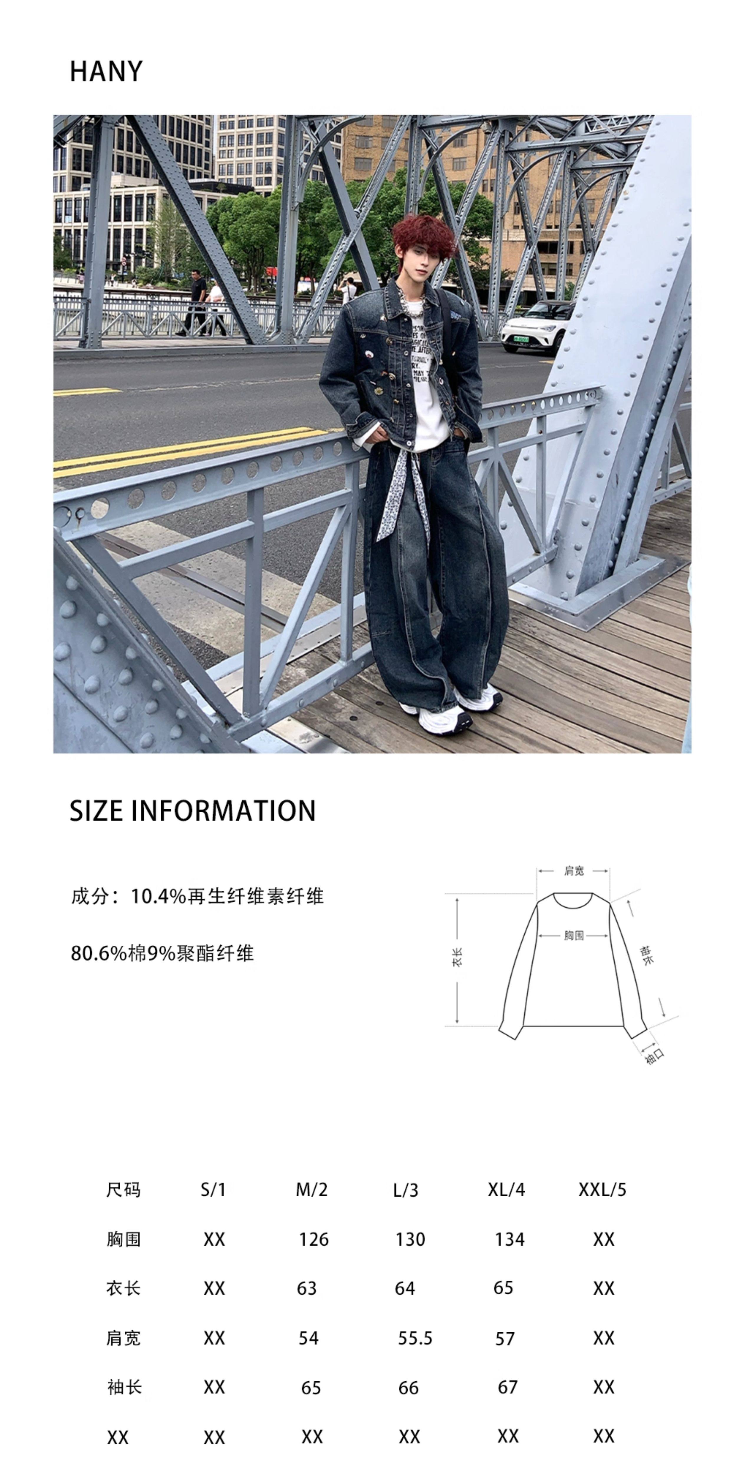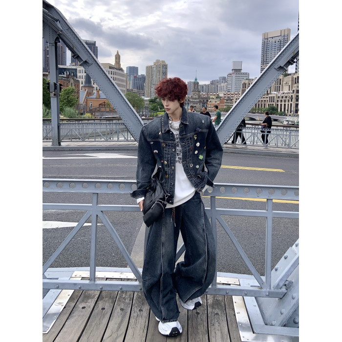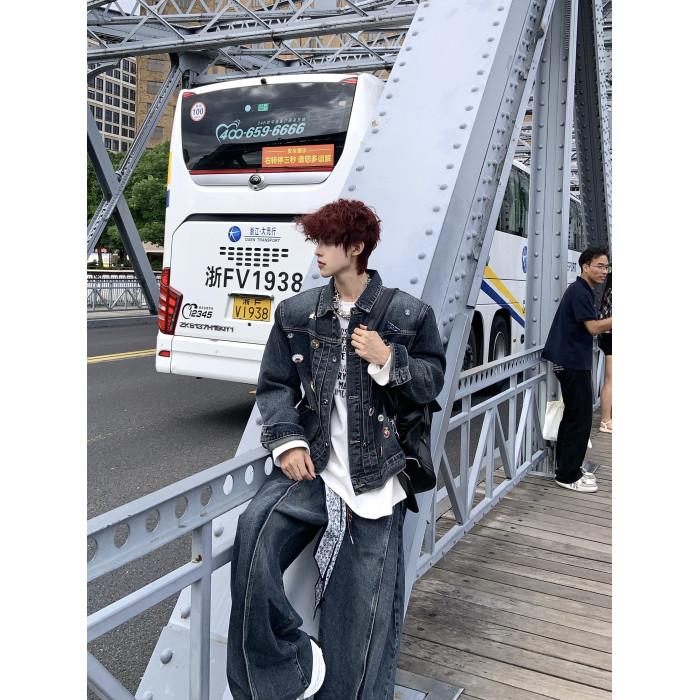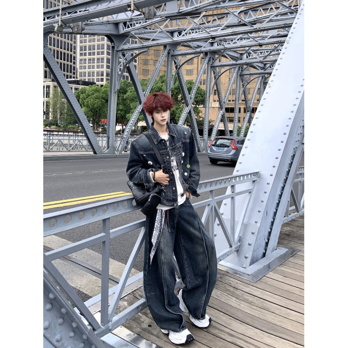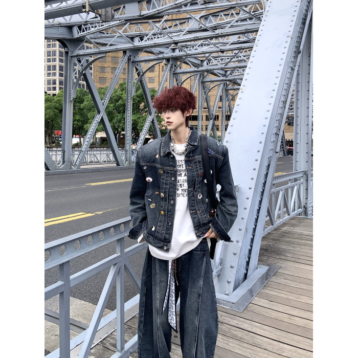 HANY復古重工水洗金屬徽章墊肩牛仔套裝男高級感做舊寬鬆夾克外套