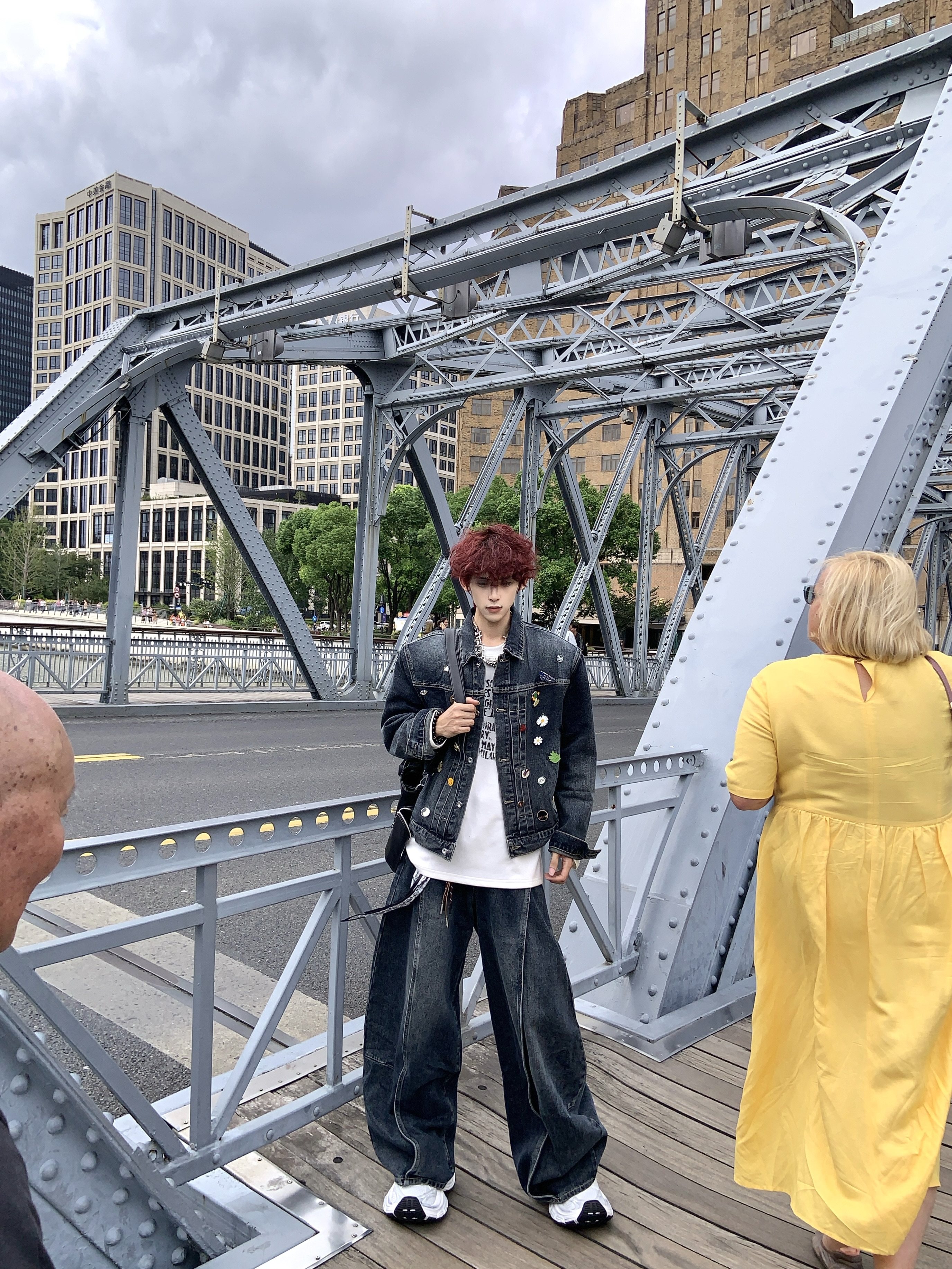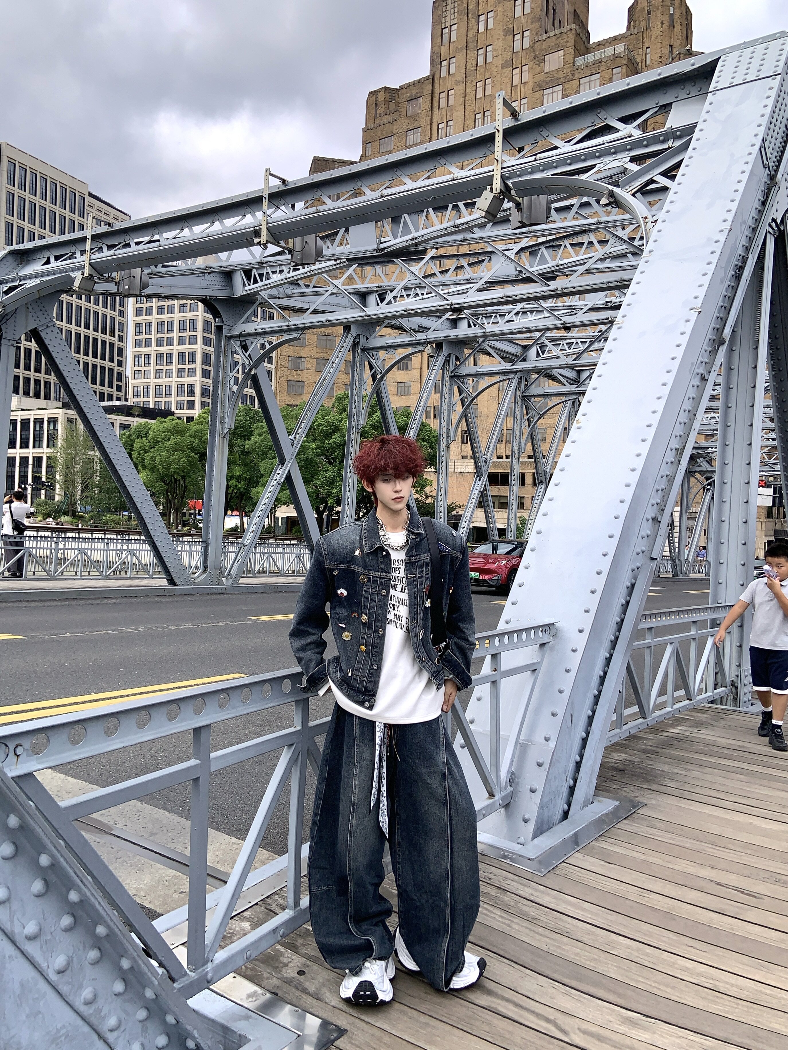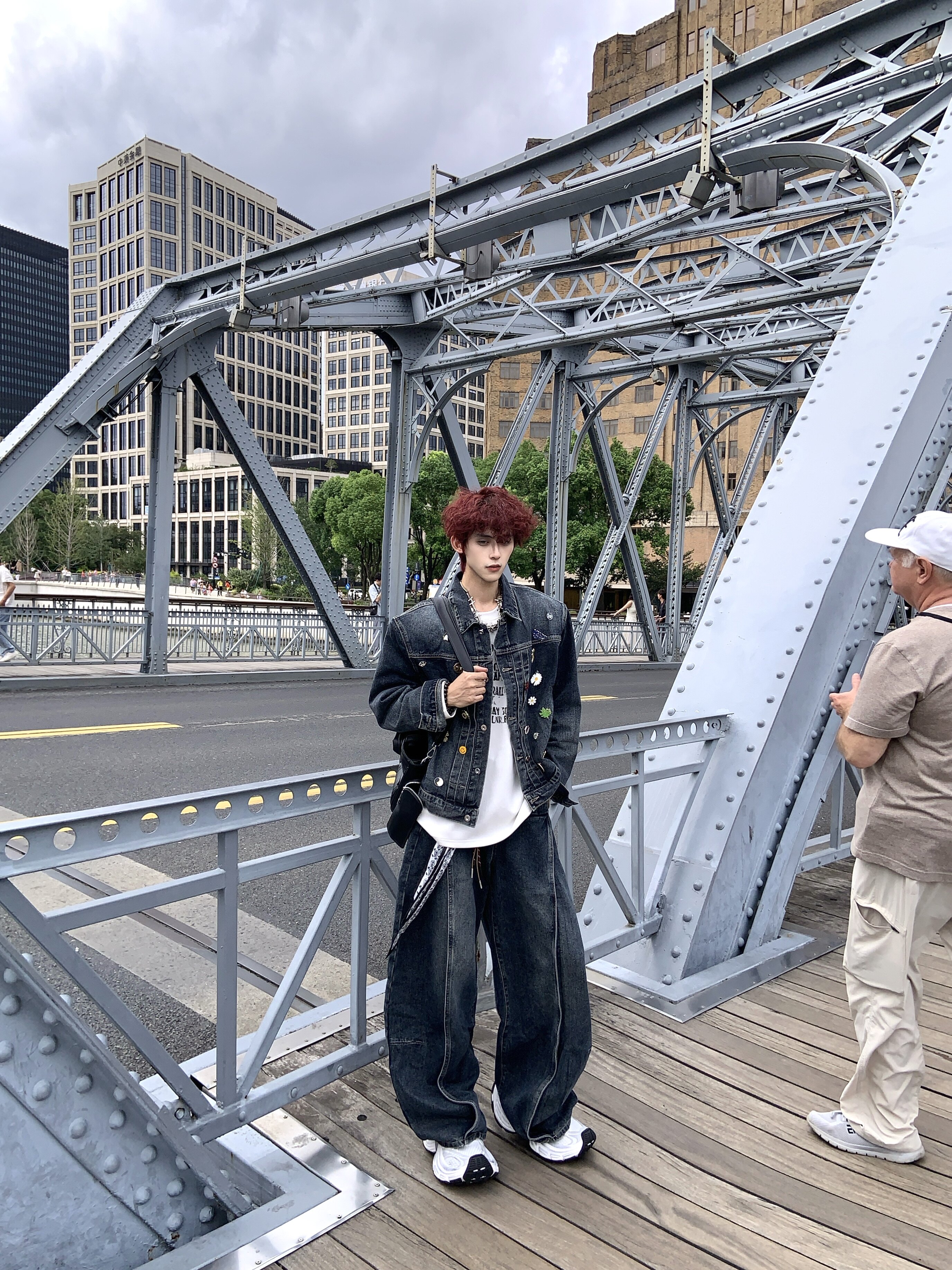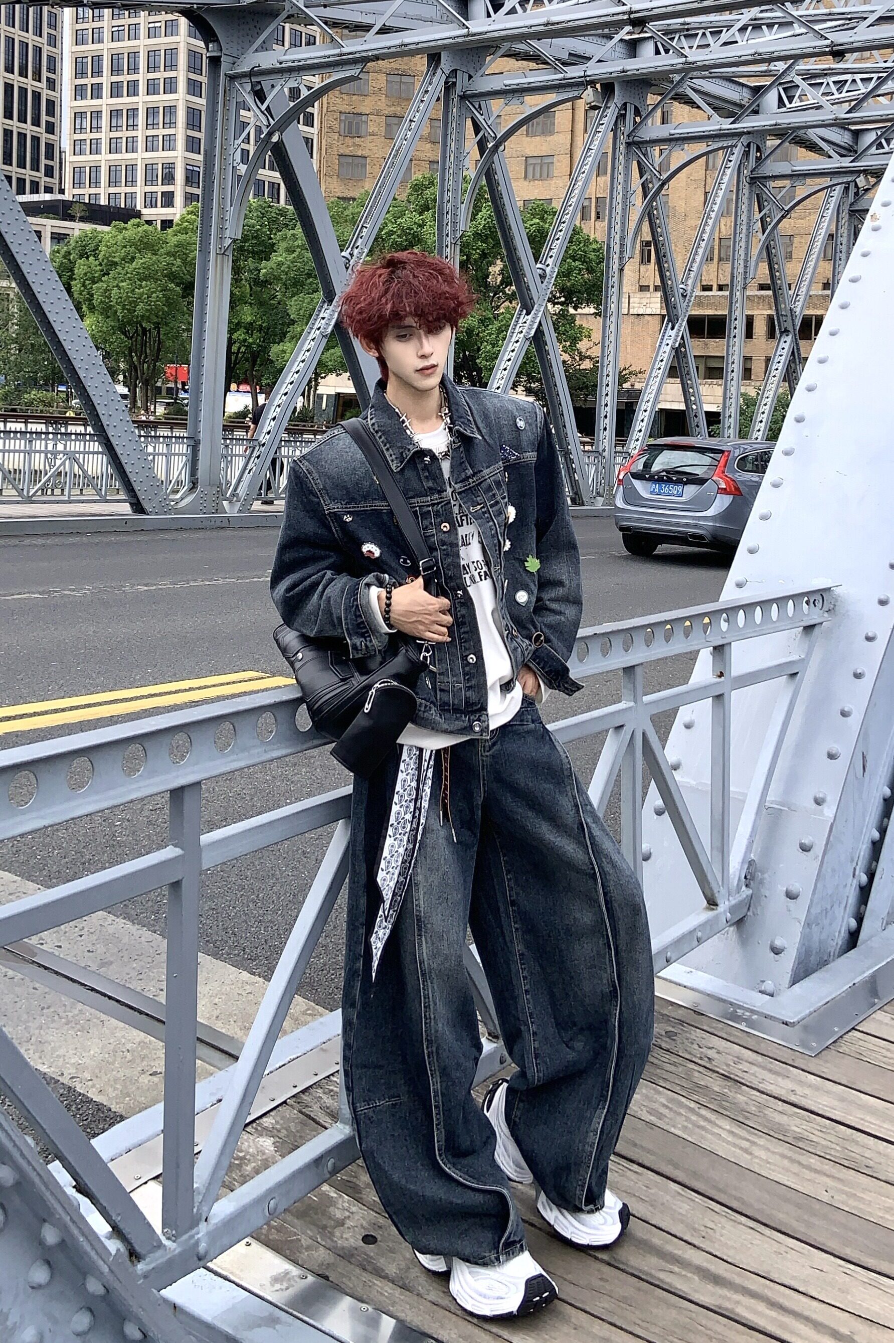 HANY復古重工水洗金屬徽章墊肩牛仔套裝男高級感做舊寬鬆夾克外套