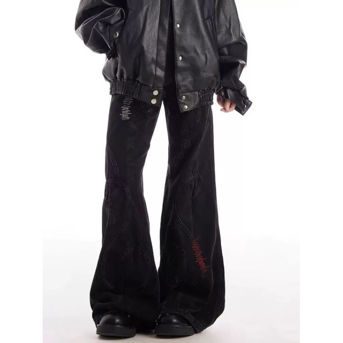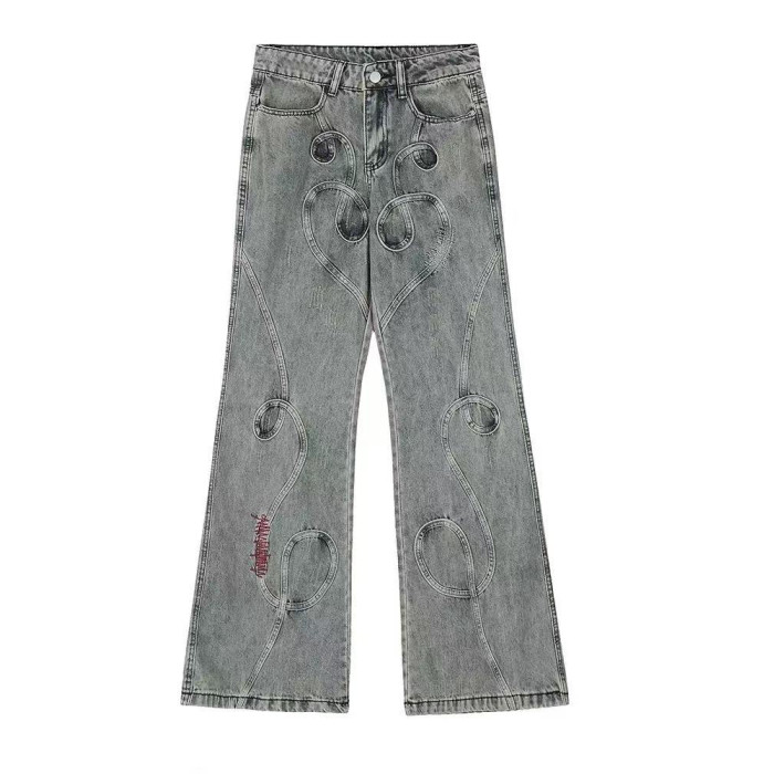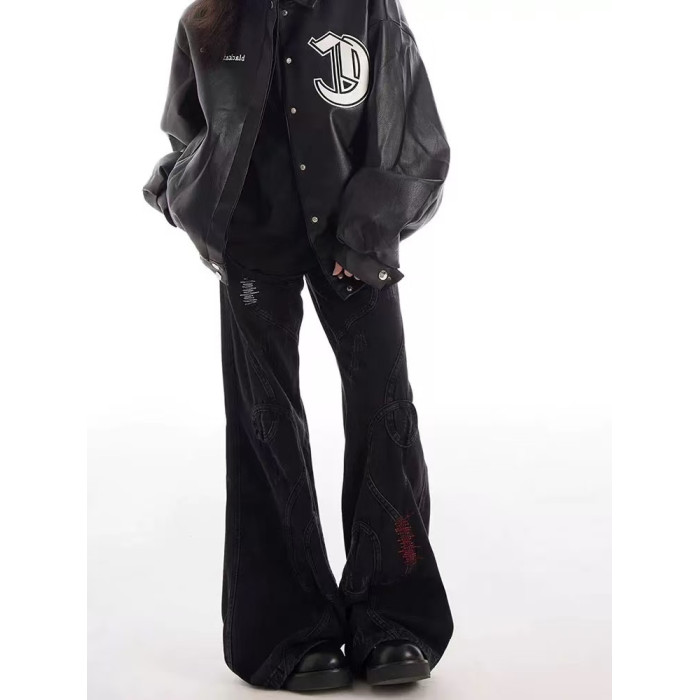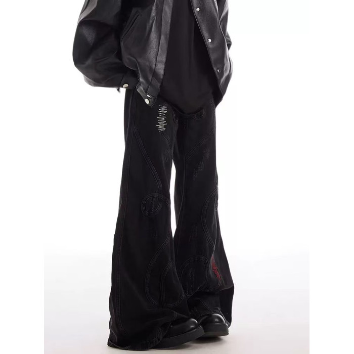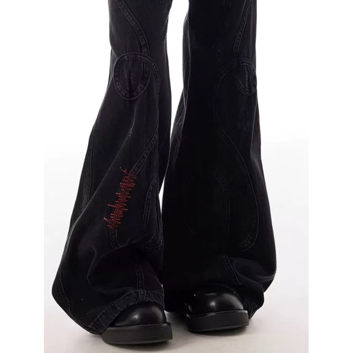 美式復古刺綉拼接亞比做舊微喇牛仔褲男女重工小衆拖地濶腿長褲子