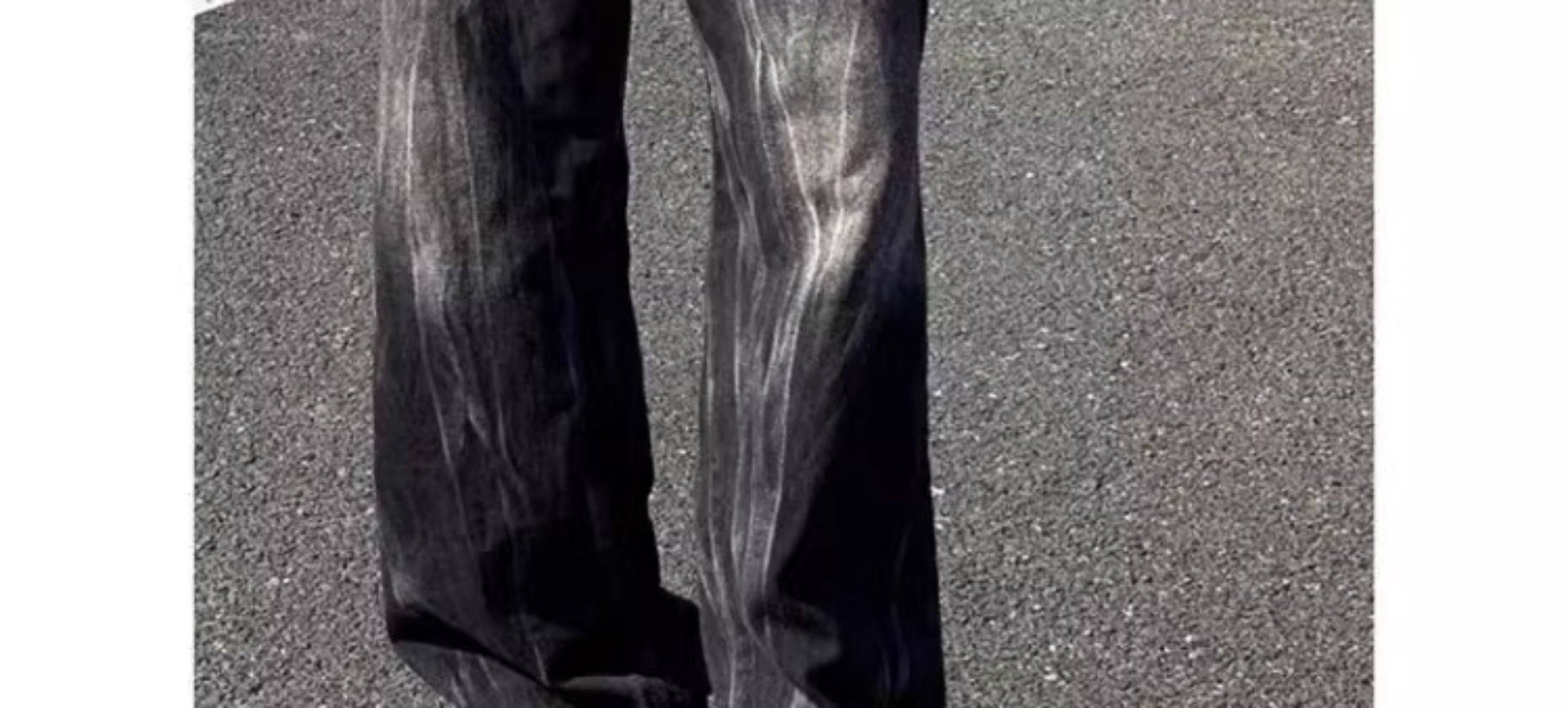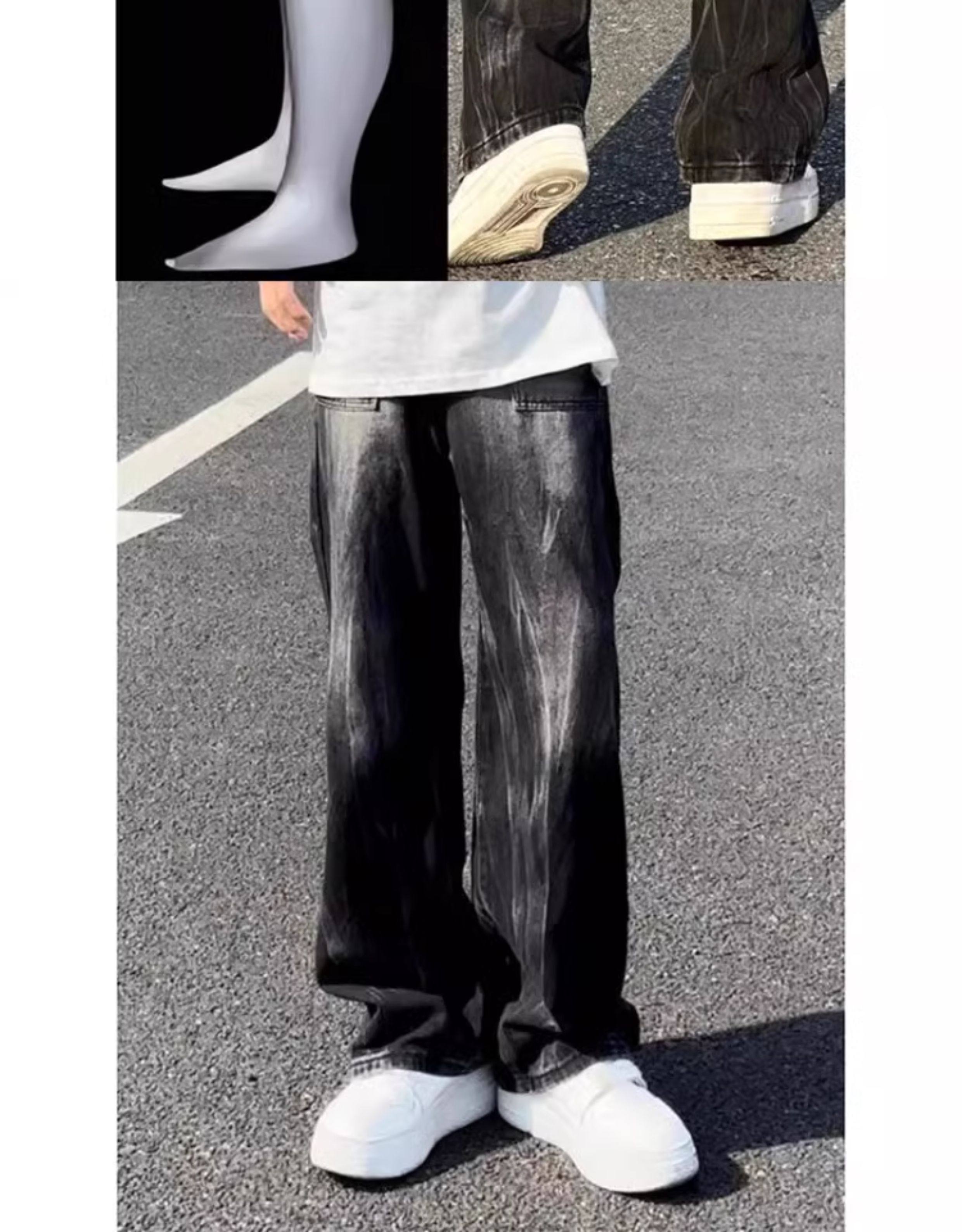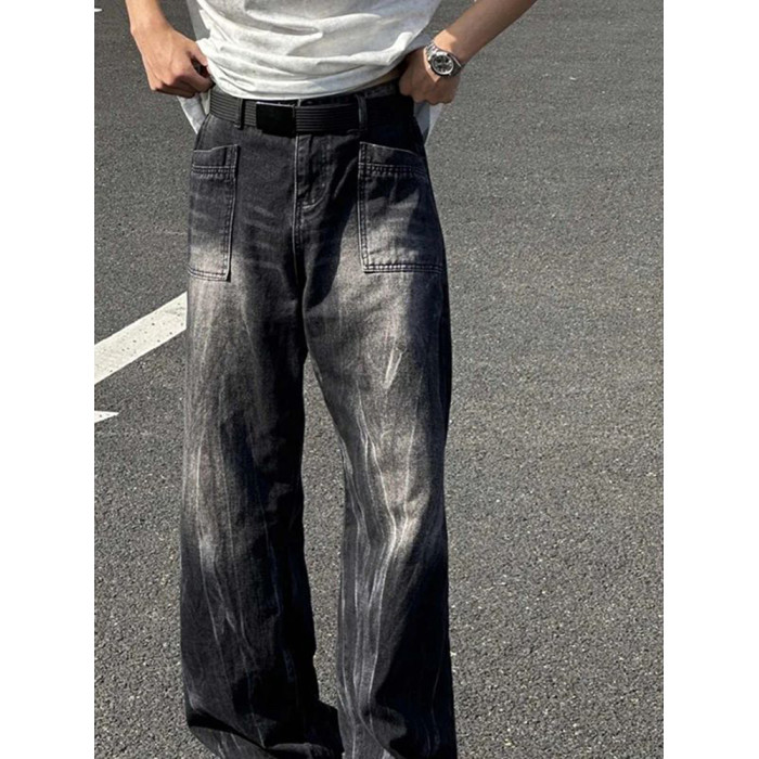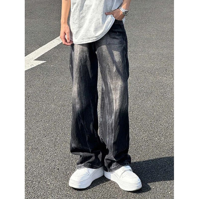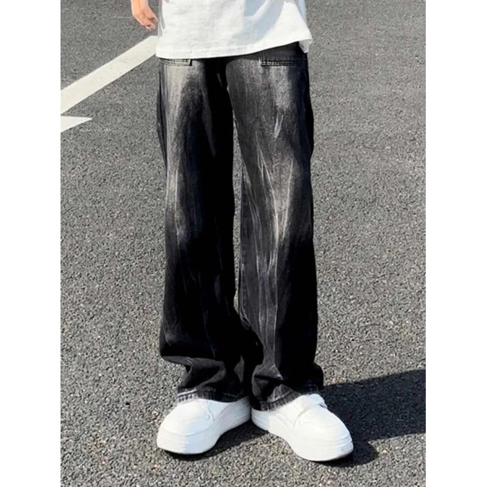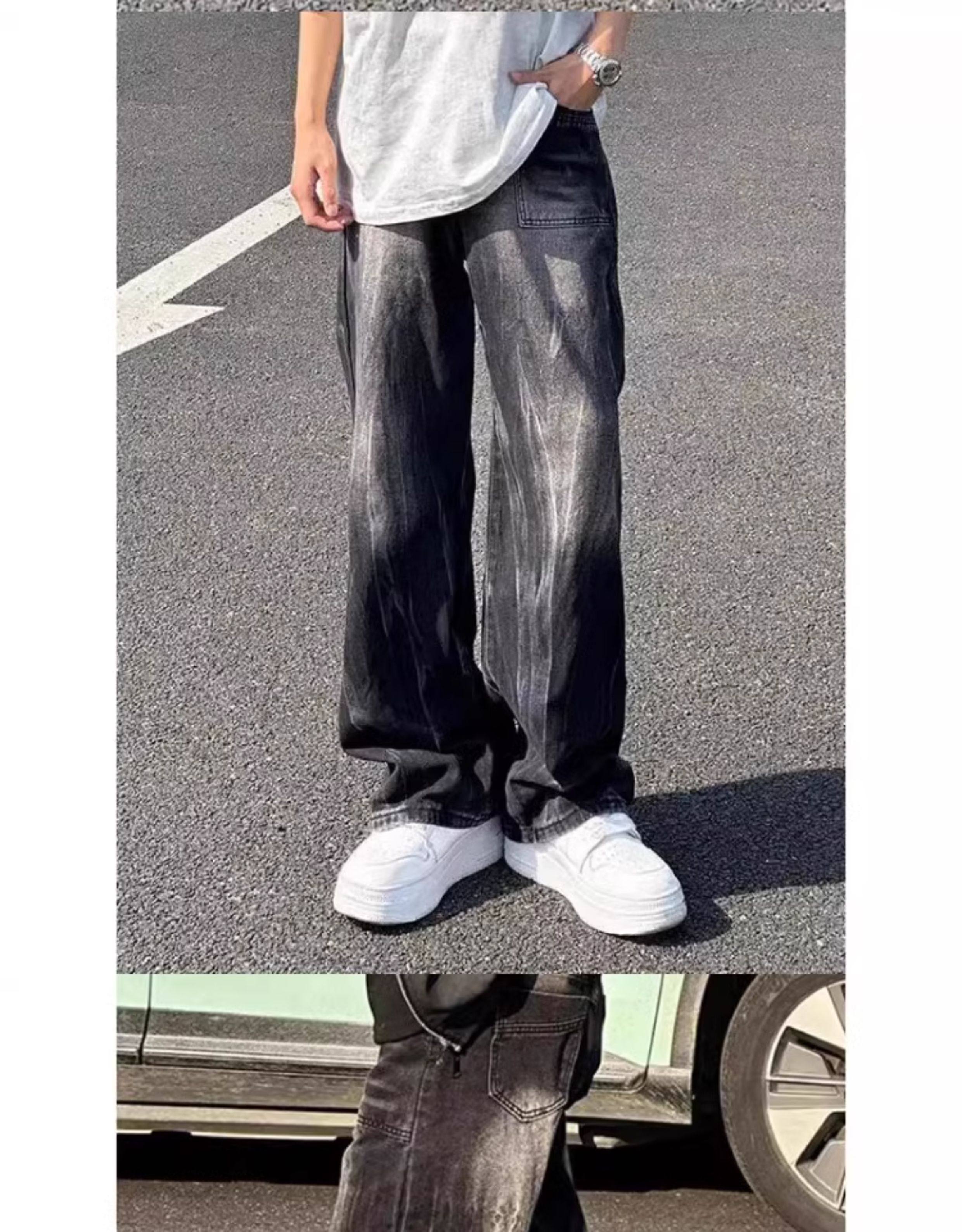 黑色閃電紋工裝牛仔褲男秋季美式高街紥染褲子直筒寬鬆彎刀微喇褲