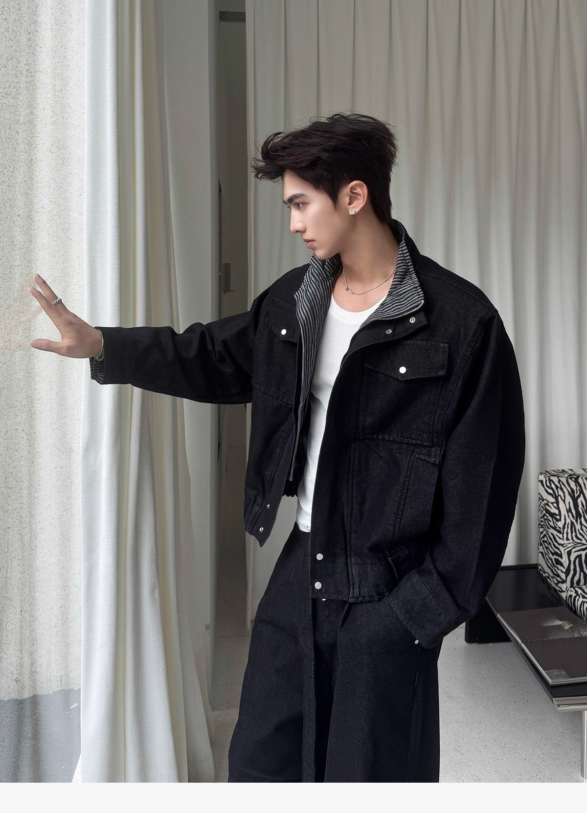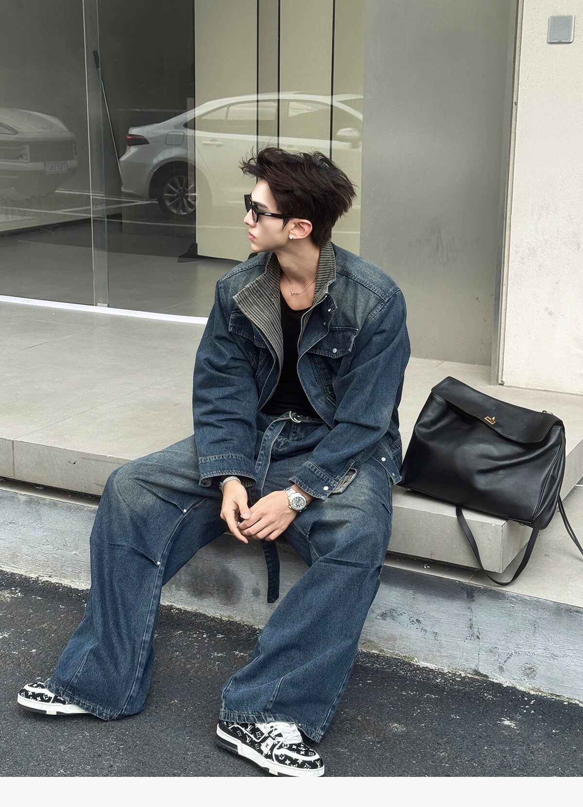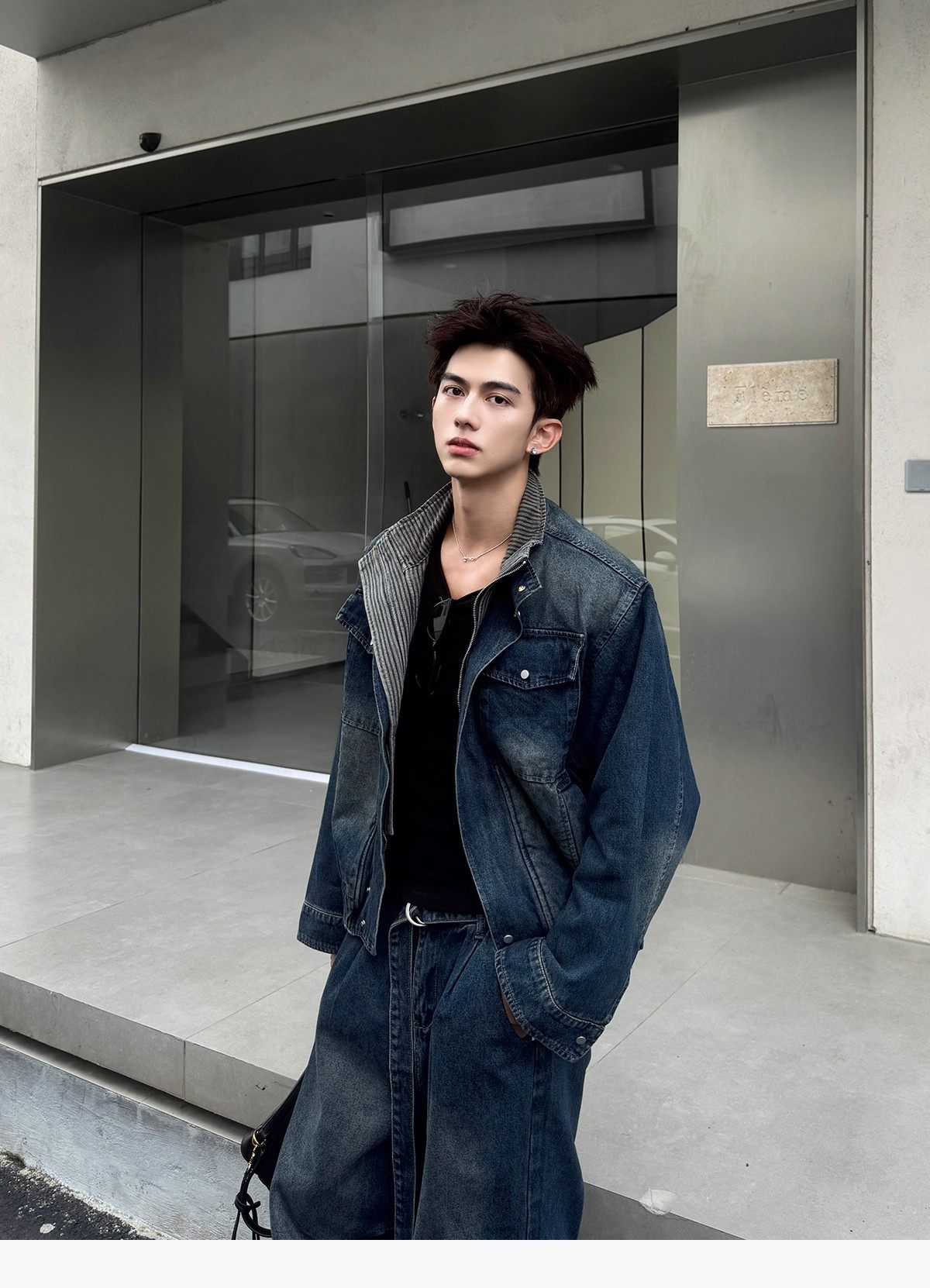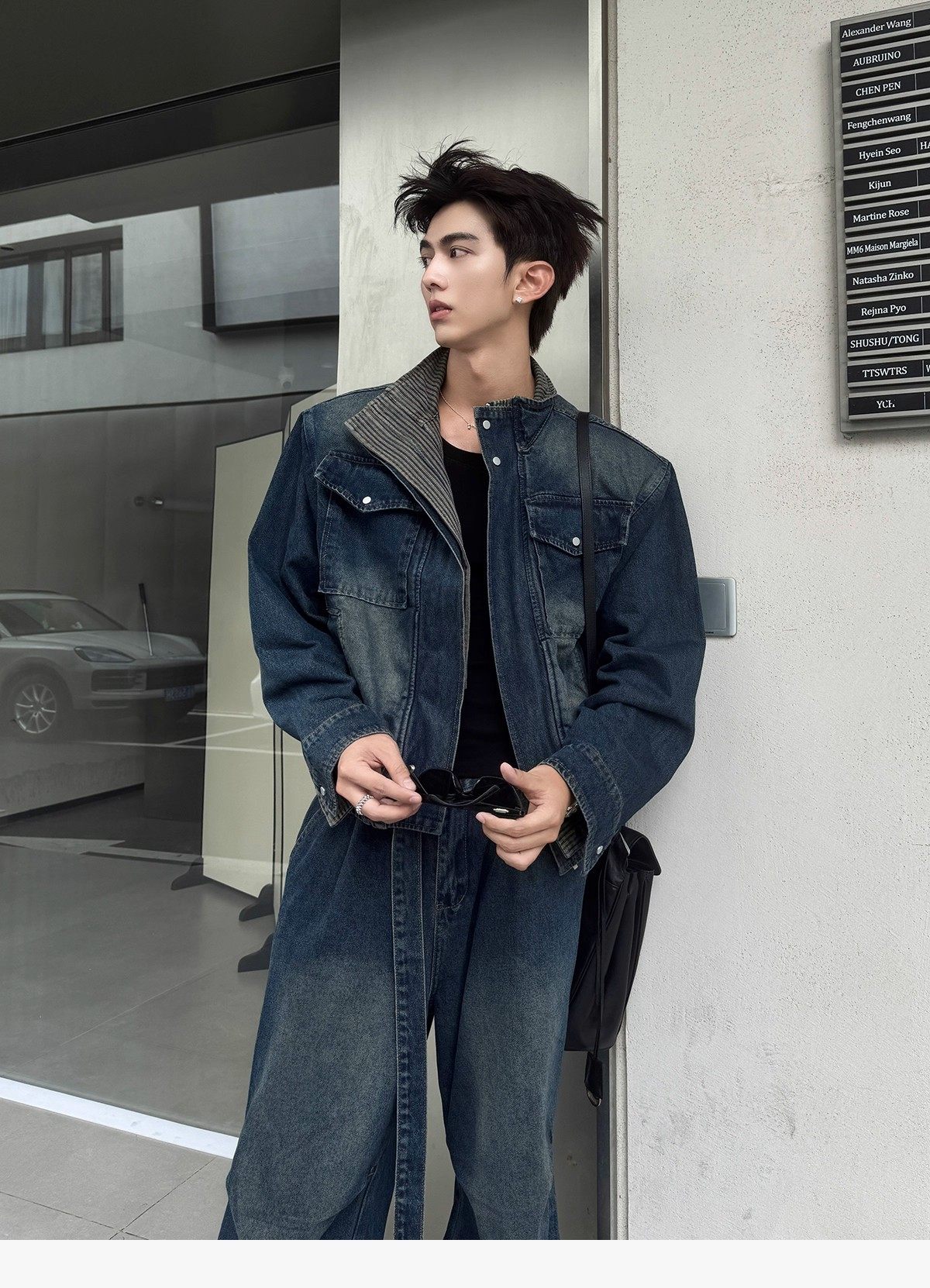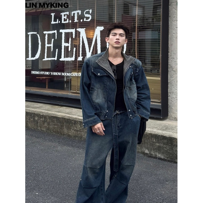 水洗做舊重工假兩件牛仔外套男潮流痞帥立領短款寬鬆工裝夾克上衣