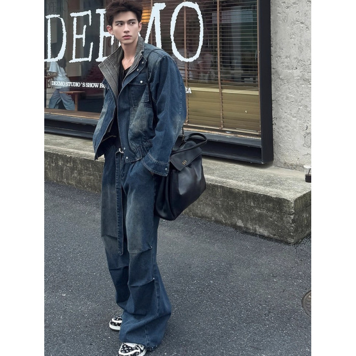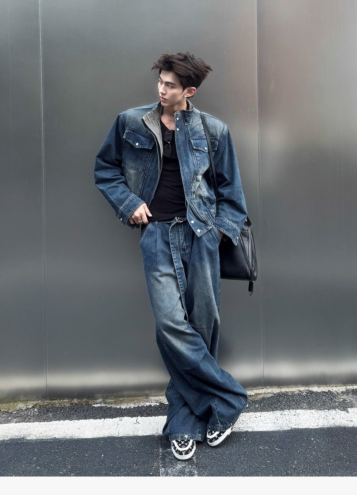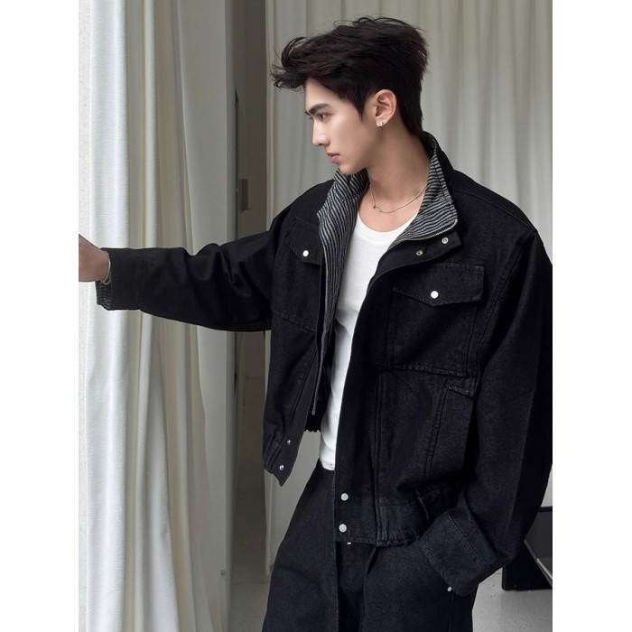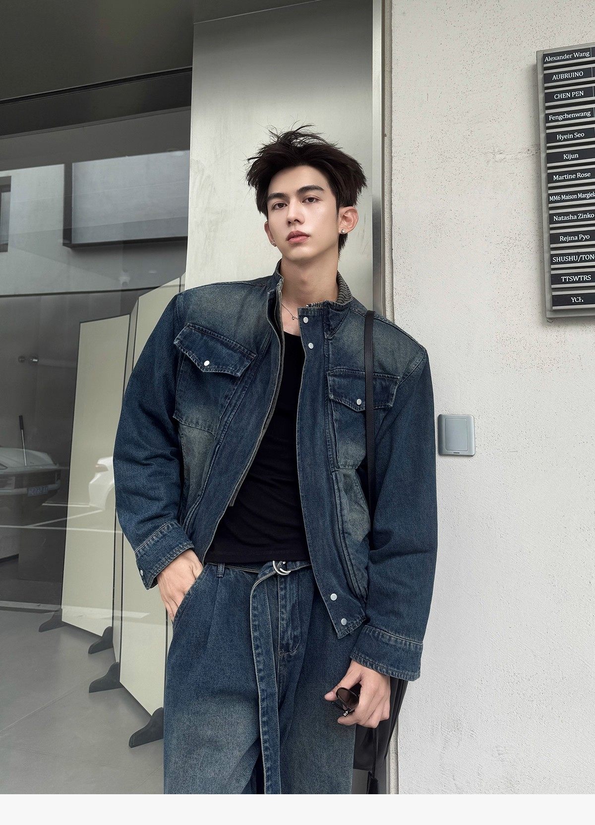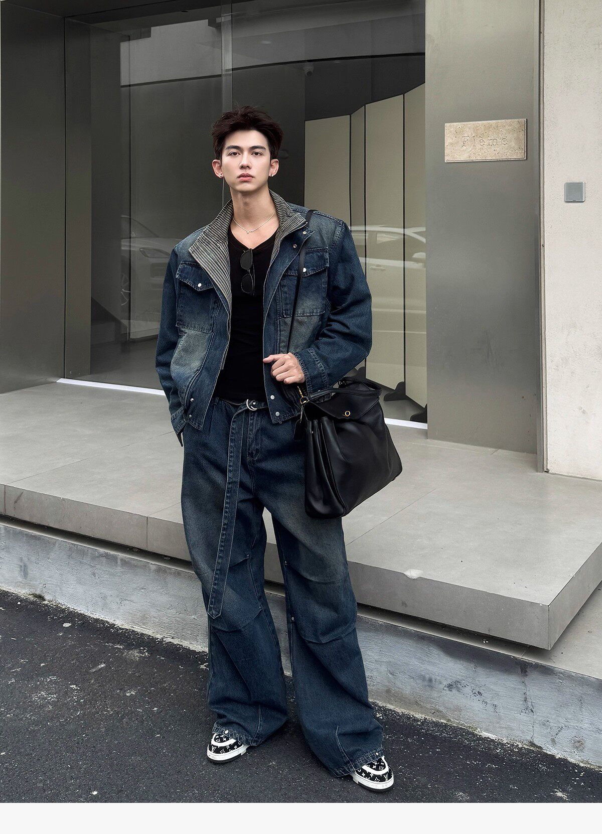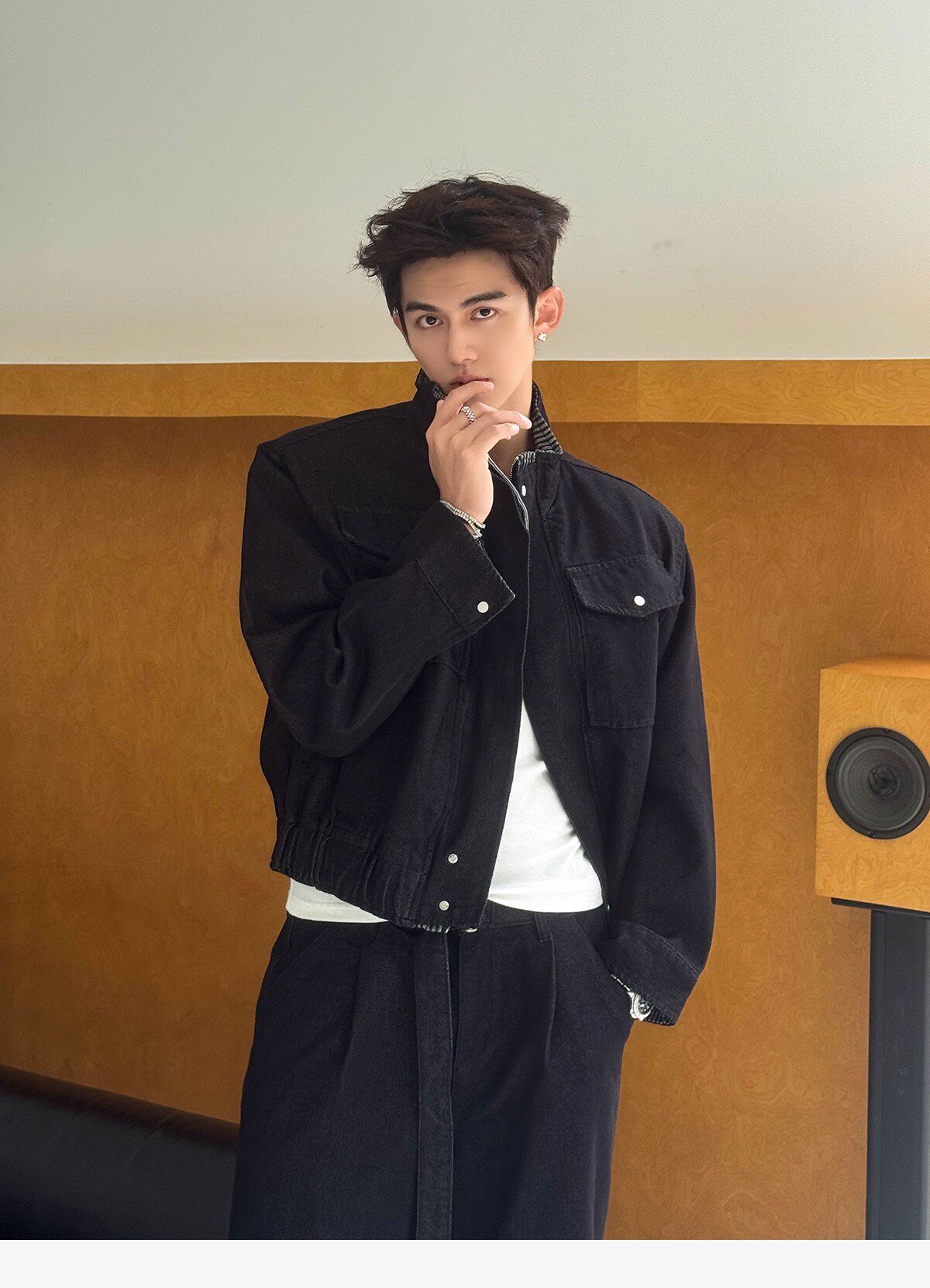 水洗做舊重工假兩件牛仔外套男潮流痞帥立領短款寬鬆工裝夾克上衣