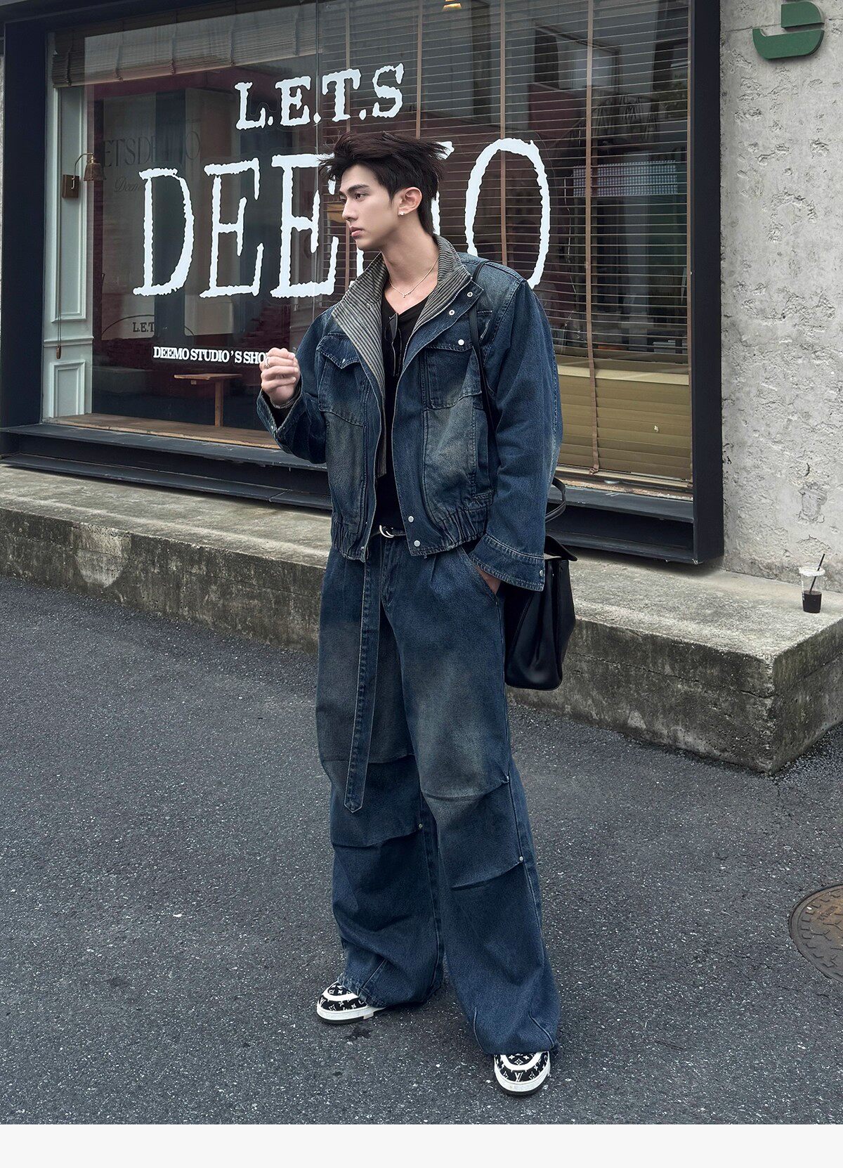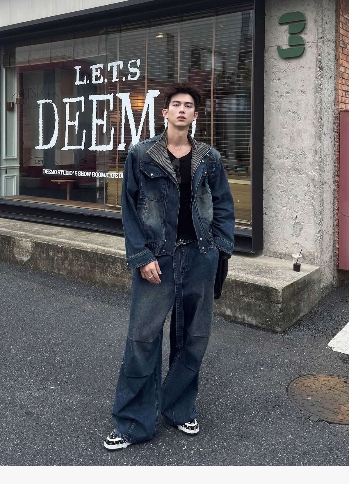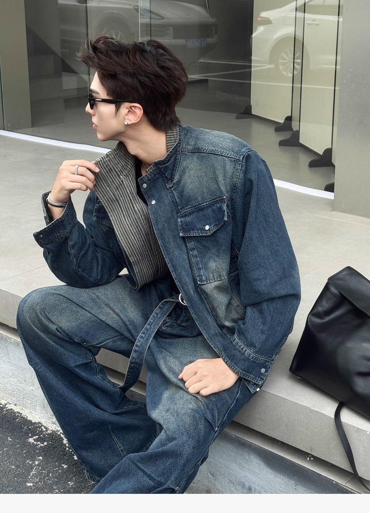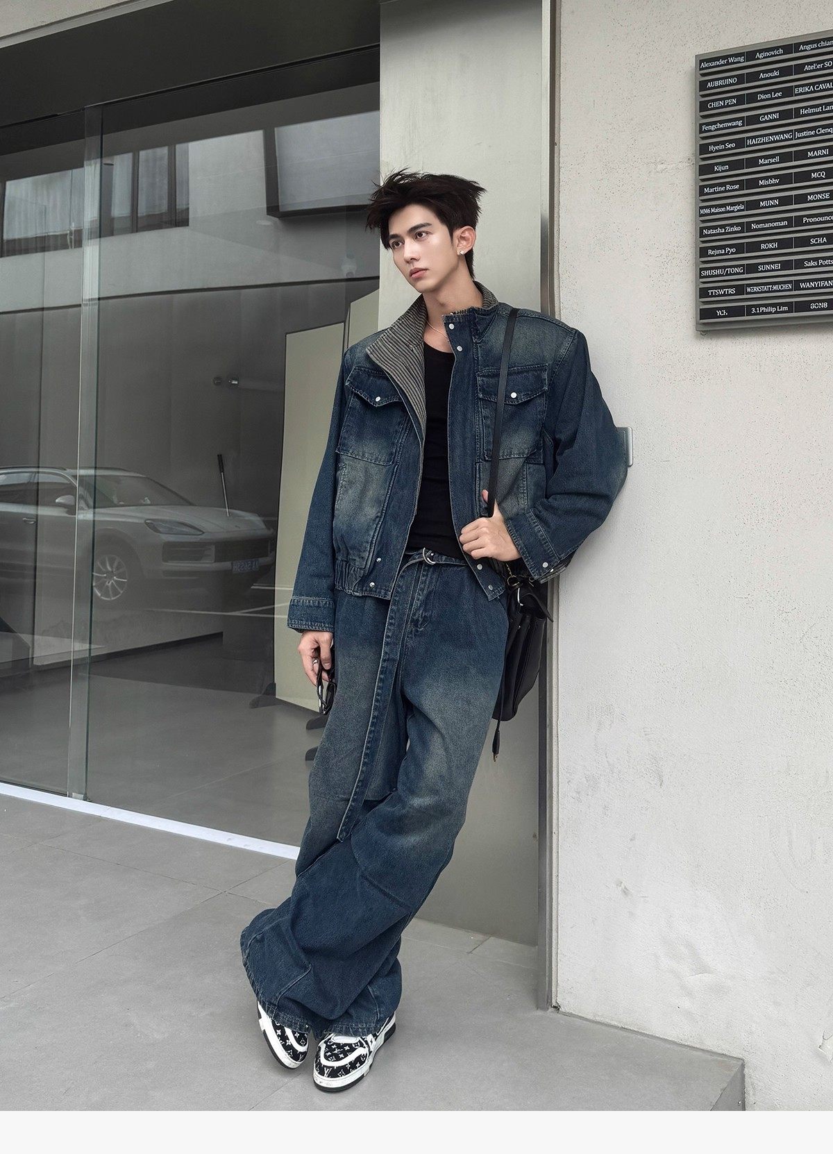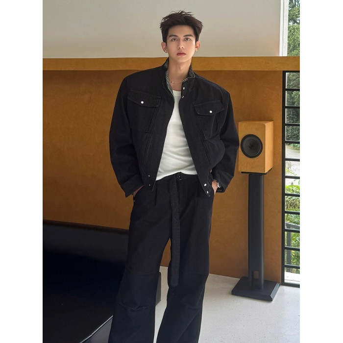 水洗做舊重工假兩件牛仔外套男潮流痞帥立領短款寬鬆工裝夾克上衣
