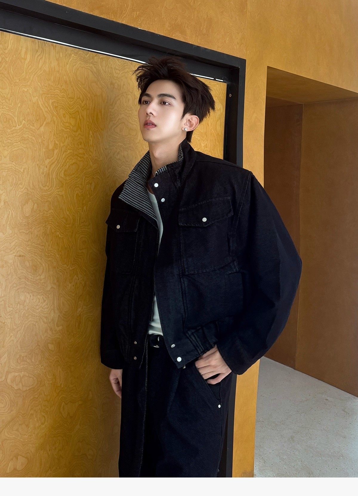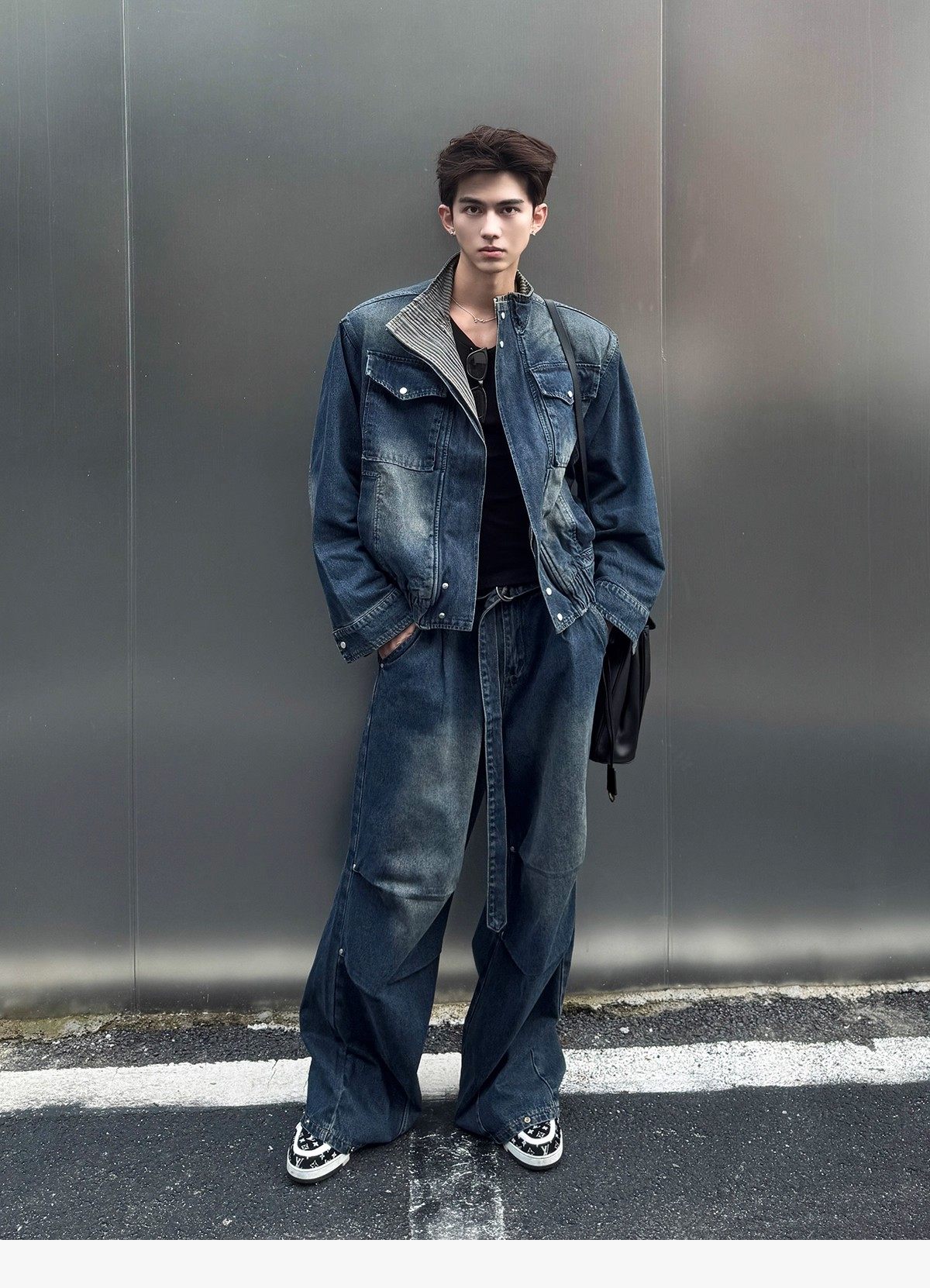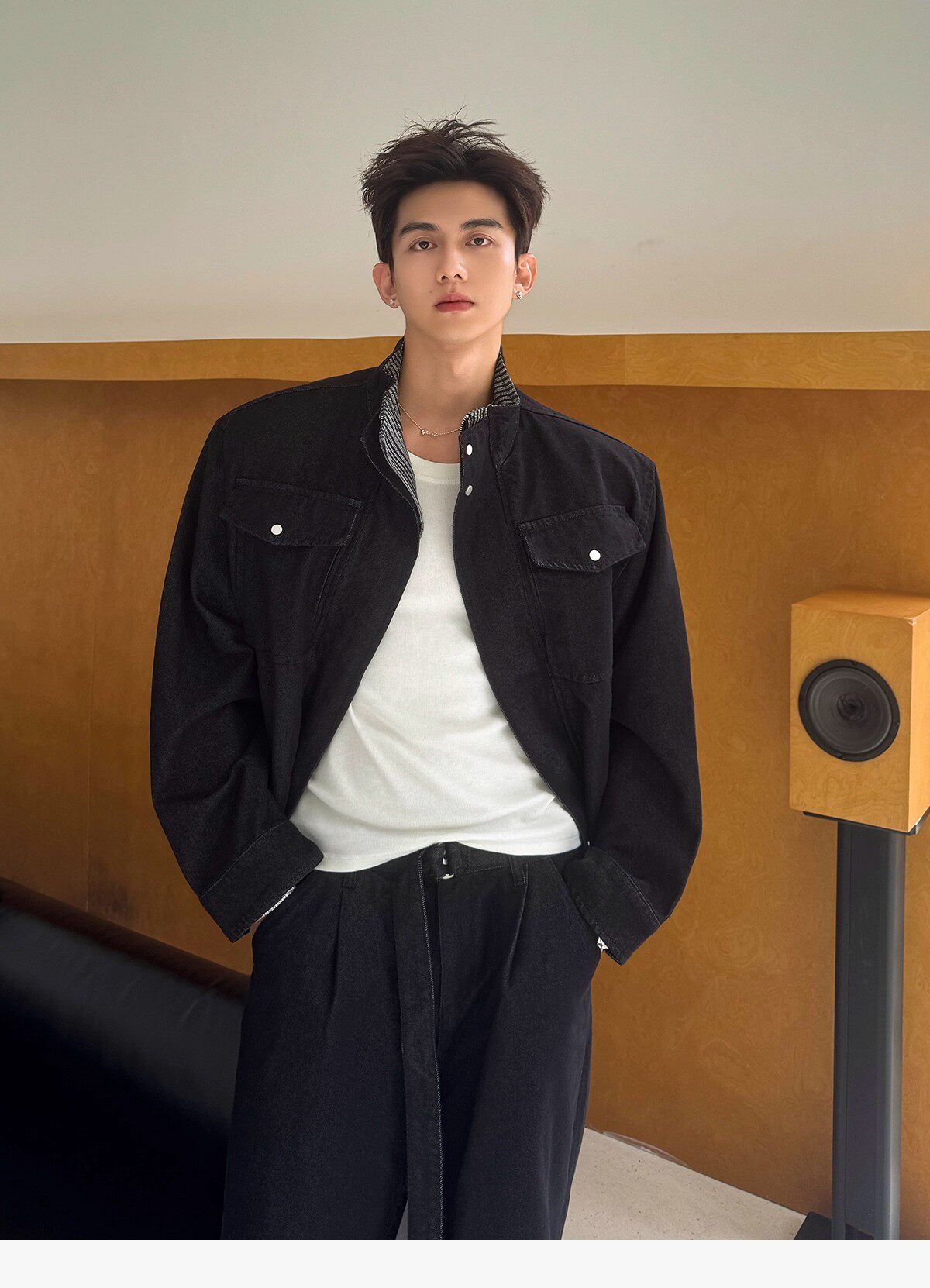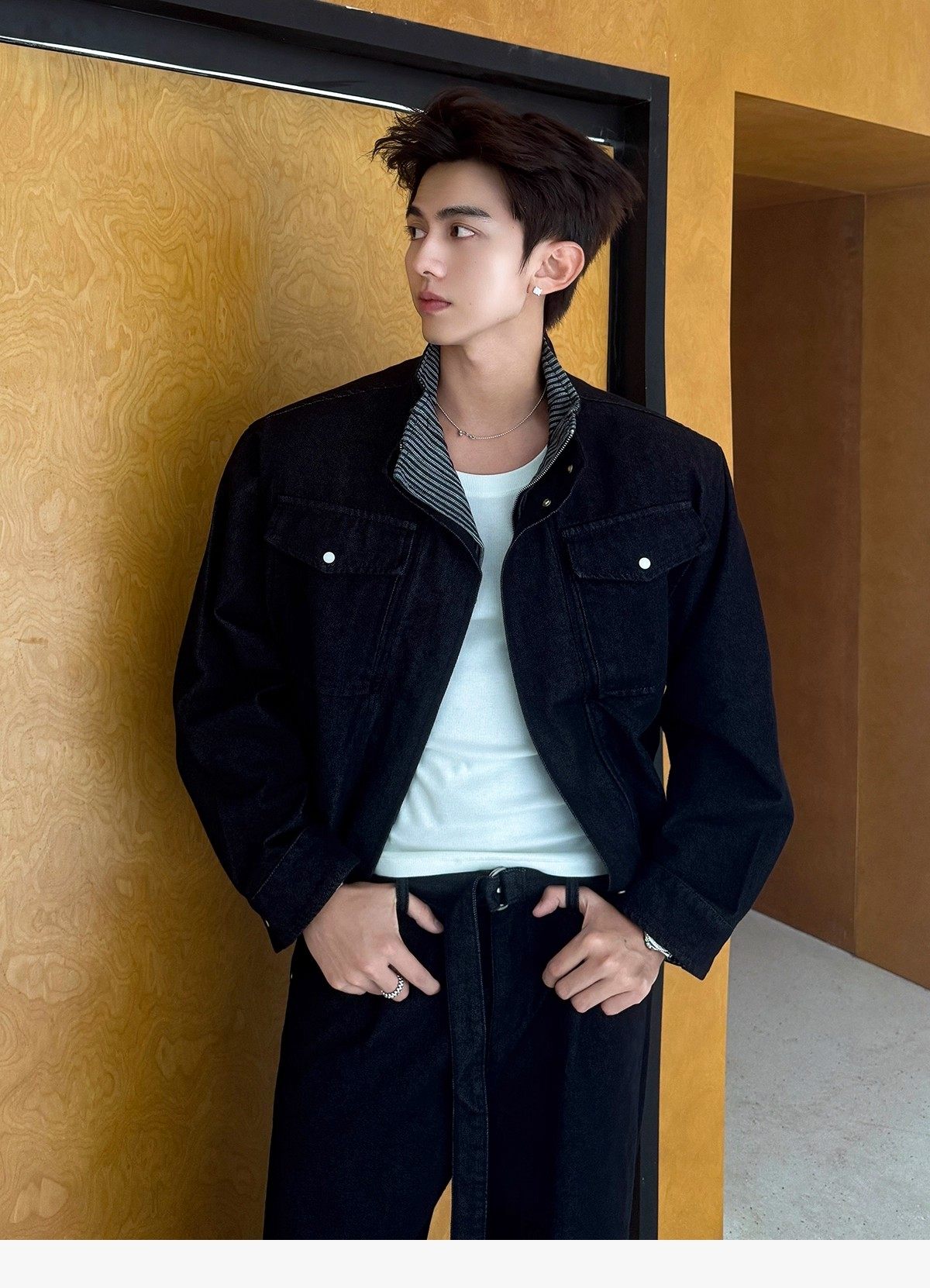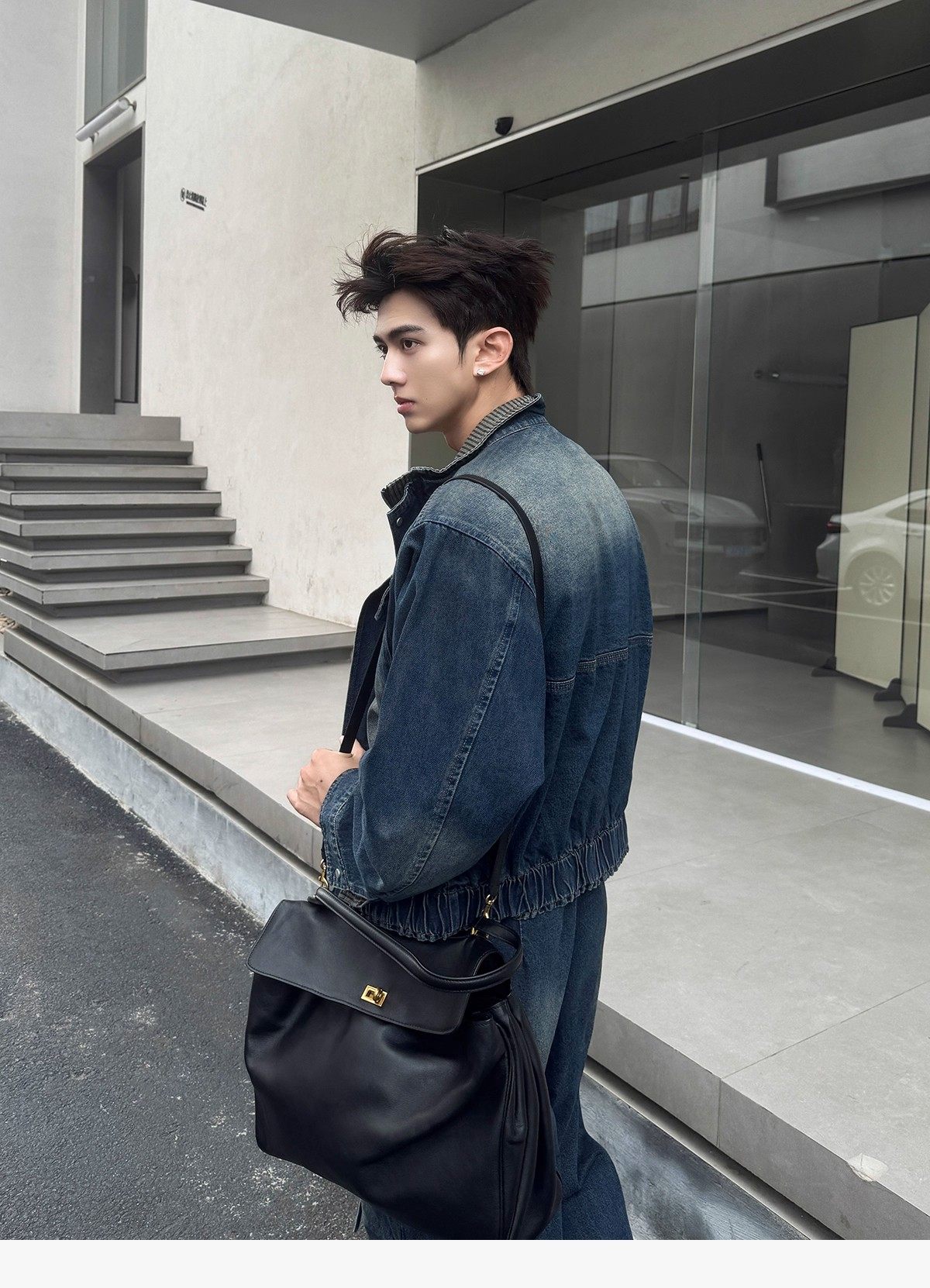 水洗做舊重工假兩件牛仔外套男潮流痞帥立領短款寬鬆工裝夾克上衣